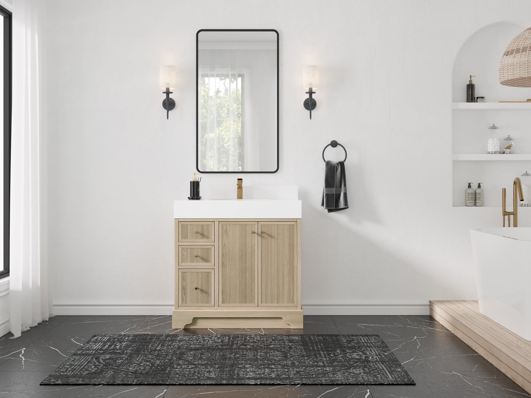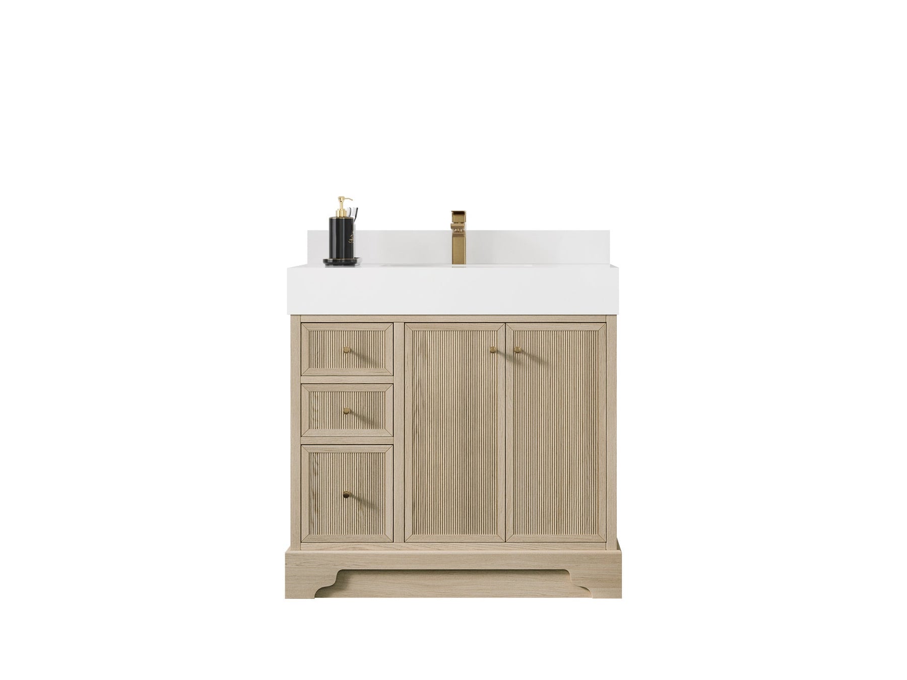 The Manhattan Collection is a modern and stylish addition to any bathroom. It is made from white oak wood and plywood, a strong and durable material that will last for years to come. The reeded design adds a sophisticated touch to the vanity, making it a statement piece in any bathroom. The thick countertop adds an extra layer of strength and durability, making it perfect for a busy bathroom. The white oak wood gives the vanity a clean, contemporary look that will complement any modern bathroom decor. The spacious countertop provides plenty of space for all of your bathroom essentials, and the deep drawer with built-in power station and organizer allows you to keep everything organized and easily accessible. The power station and organizer feature outlets and USB ports to charge your devices, as well as compartments for organizing your personal items. The strong and sturdy construction of this vanity makes it a reliable and functional addition to any bathroom.
