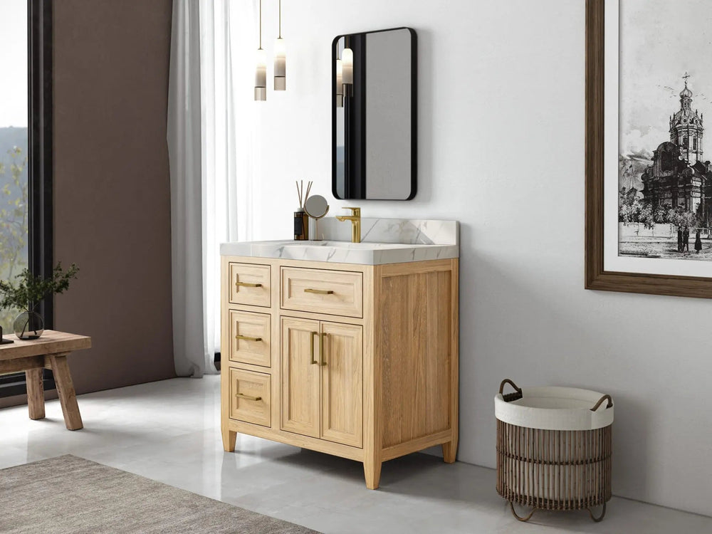 1. Traditional style with a modern twist - made from teak wood, this bathroom vanity features a clean, contemporary design with soft-close hardware and antique brass hardware.