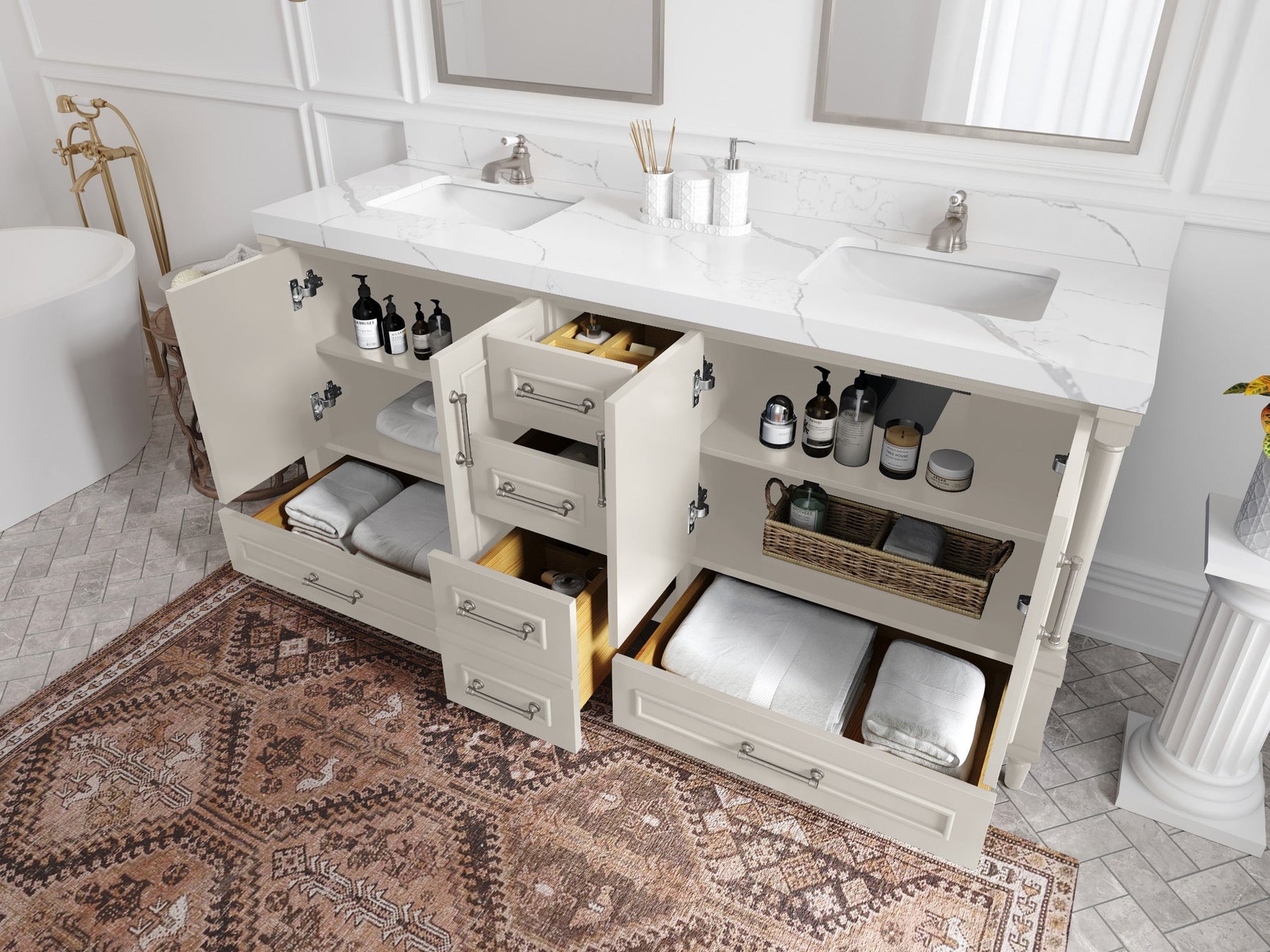 4. Ample Storage Space - The Aberdeen Vanity comes with spacious cabinet space to store all your bathroom essentials, including towels, toiletries, and more. The soft-close drawers and doors ensure that you can access your items easily and quietly.