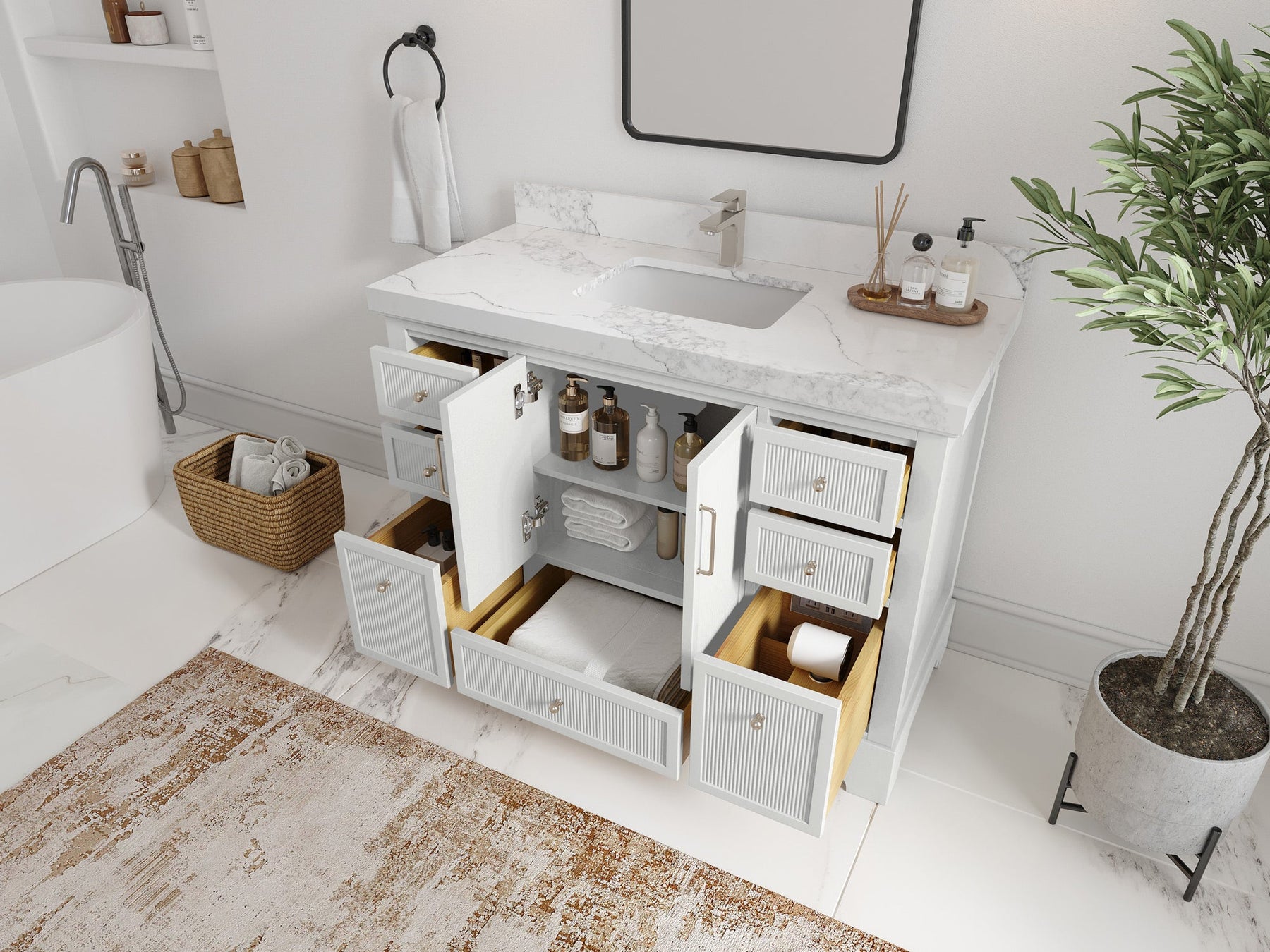 Introducing the Alys Bathroom Vanity Collection – an exquisite blend of style, functionality, and convenience. Crafted with meticulous attention to detail, this collection features a built-in power station and USB ports for easy device charging. Say goodbye to tangled cords with its cleverly organized hairdryer storage. The addition of a shelf provides extra space for your essentials, while the new shaker style with reeded design adds a touch of sophistication. With a variety of beautiful colors and a premium countertop, the Alys Collection offers a seamless fusion of practicality and elegance. Elevate your bathroom with this stunning collection and indulge in the perfect balance of form and function.