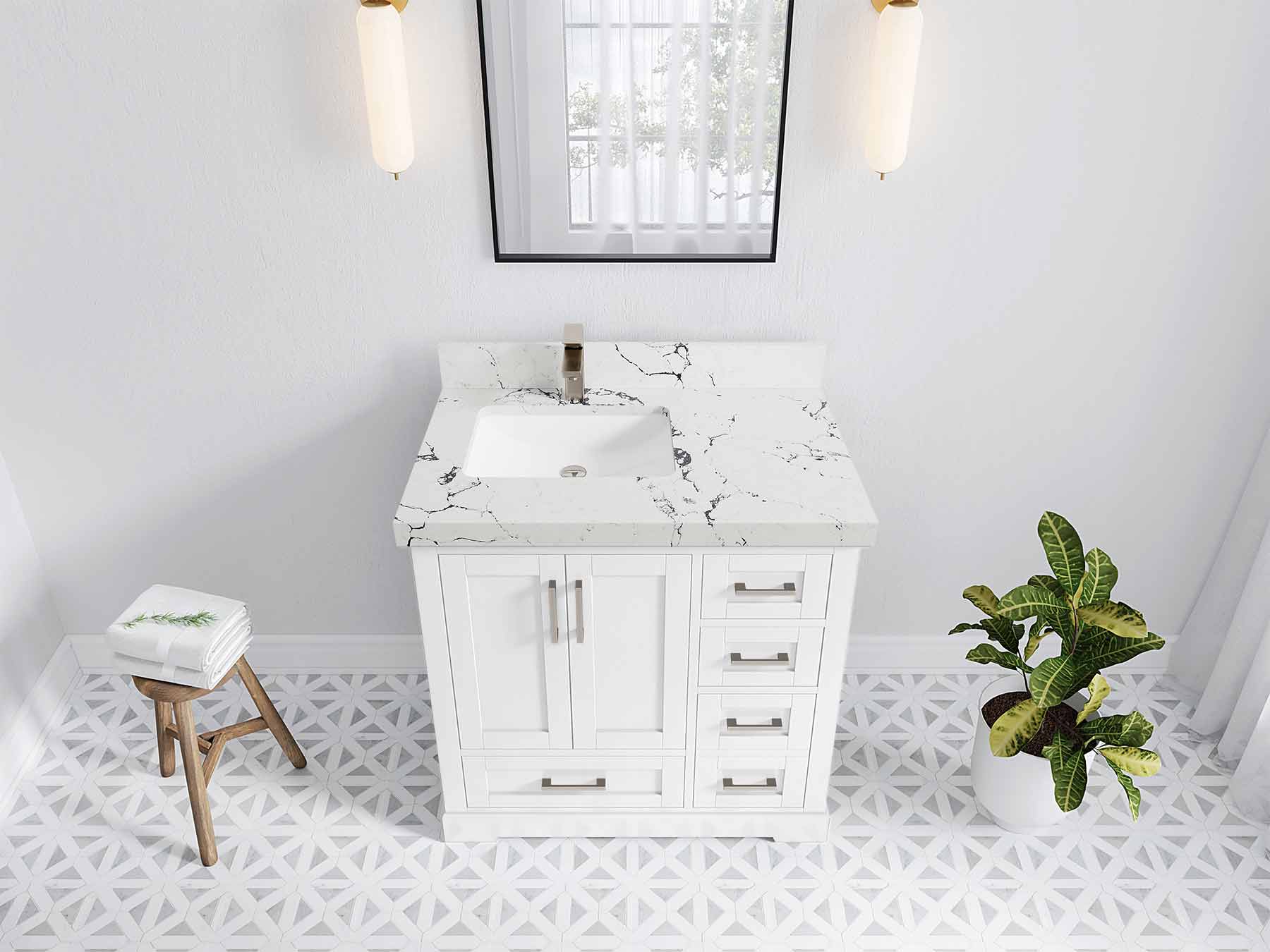 Boston 36 in. W x 22 in. D Single Sink Bathroom Vanity in White with 1.5 in Double Cove Edge Empira White Quartz Countertop - Top View