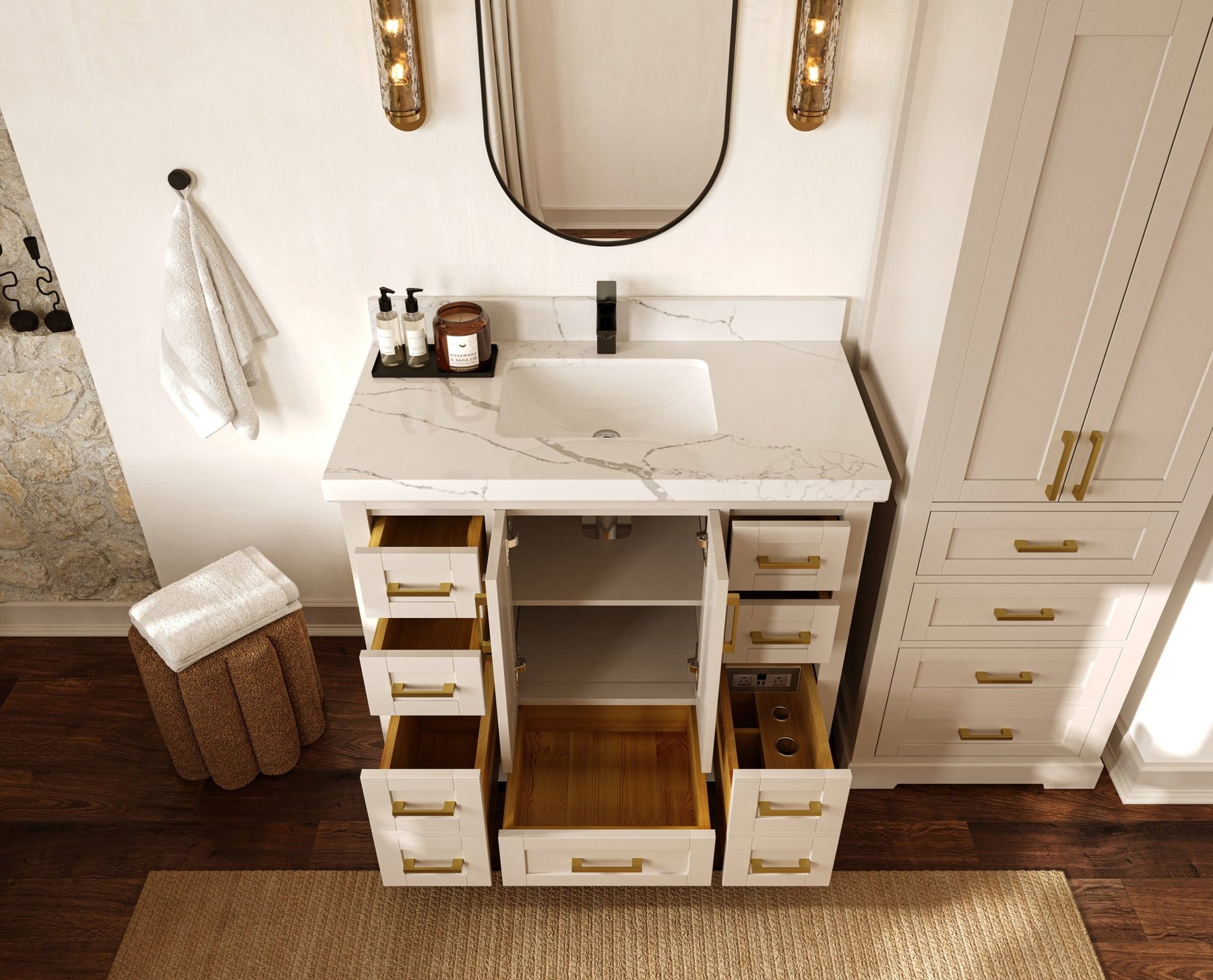 Faucet Hole(S): Comes with Single Faucet, 8 (in.) Widespread Faucet, Wall mount Faucets - Only Available for White Quartz and Carrara Quartz. (PLEASE ADD THIS CONFIGURATION UNDER COUNTERTOPS SECTION )