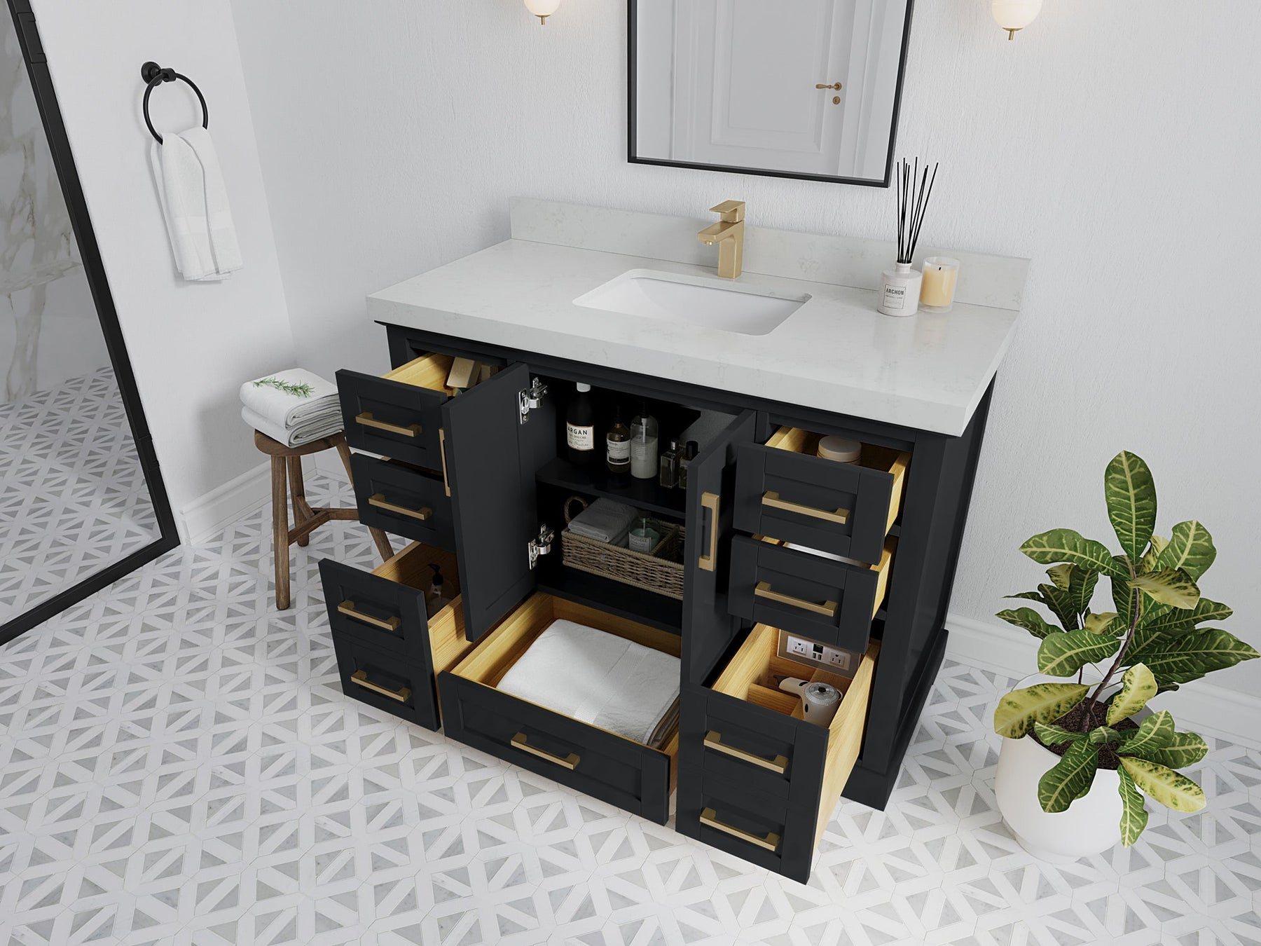 Boston 48 in. W x 22 in. D Single Sink Bathroom Vanity in Wrought Iron with 2 in Calacatta Black Quartz Countertop - Top View
