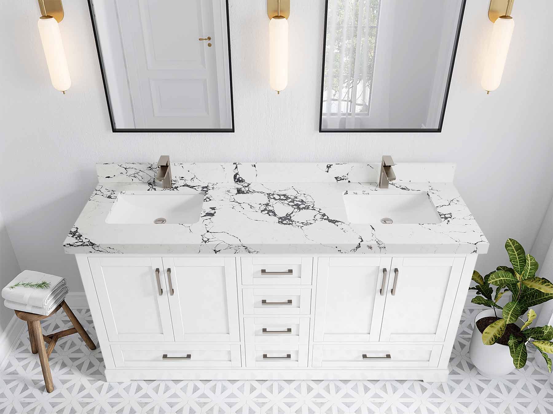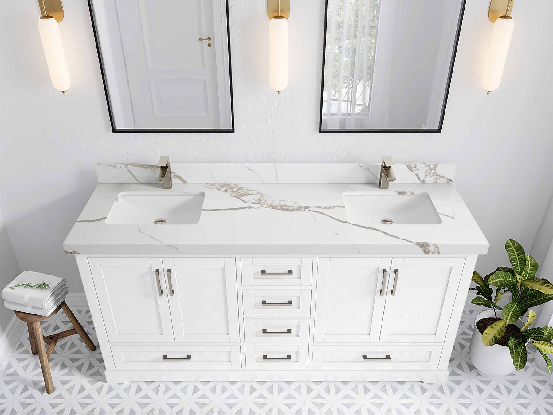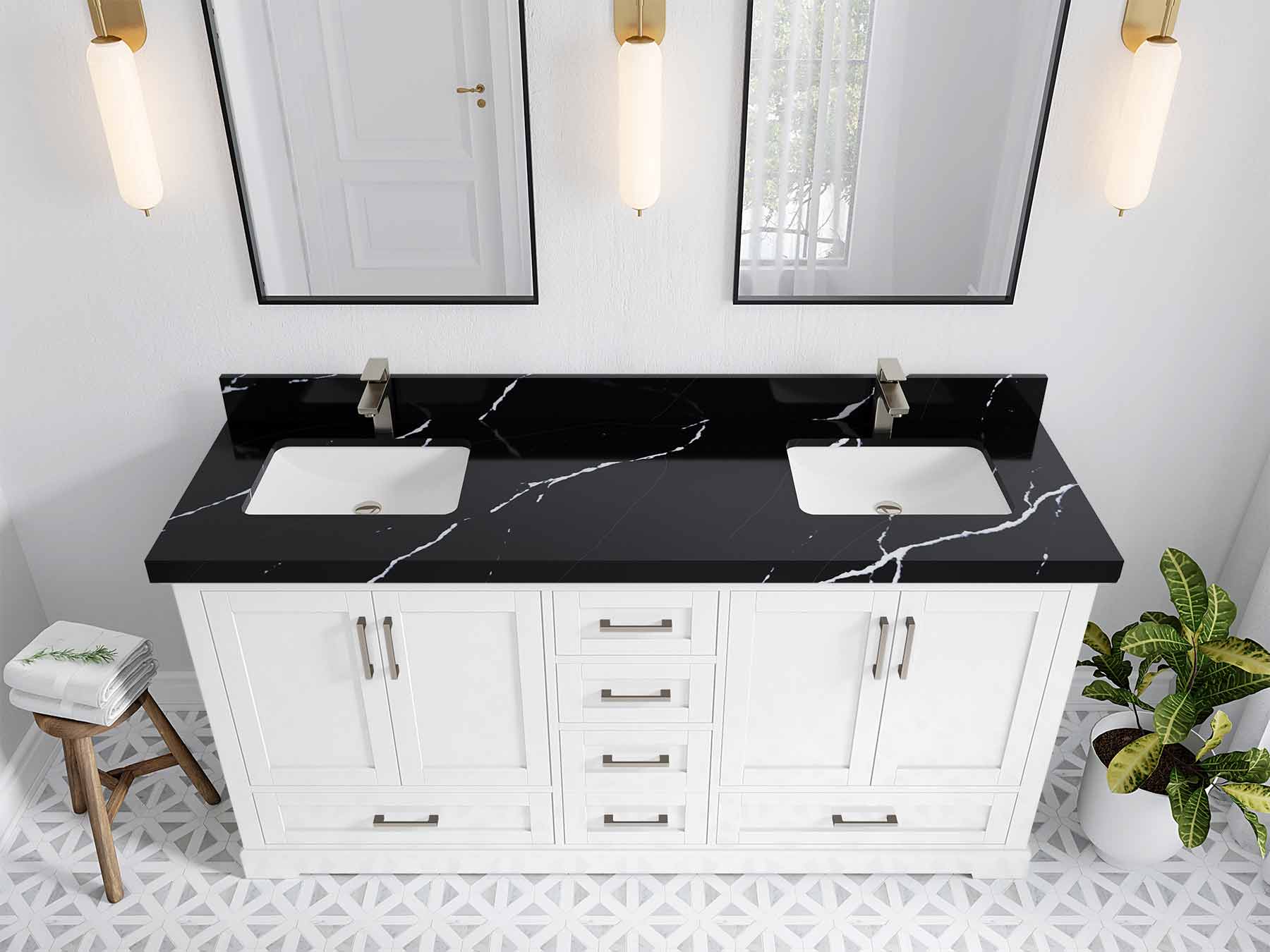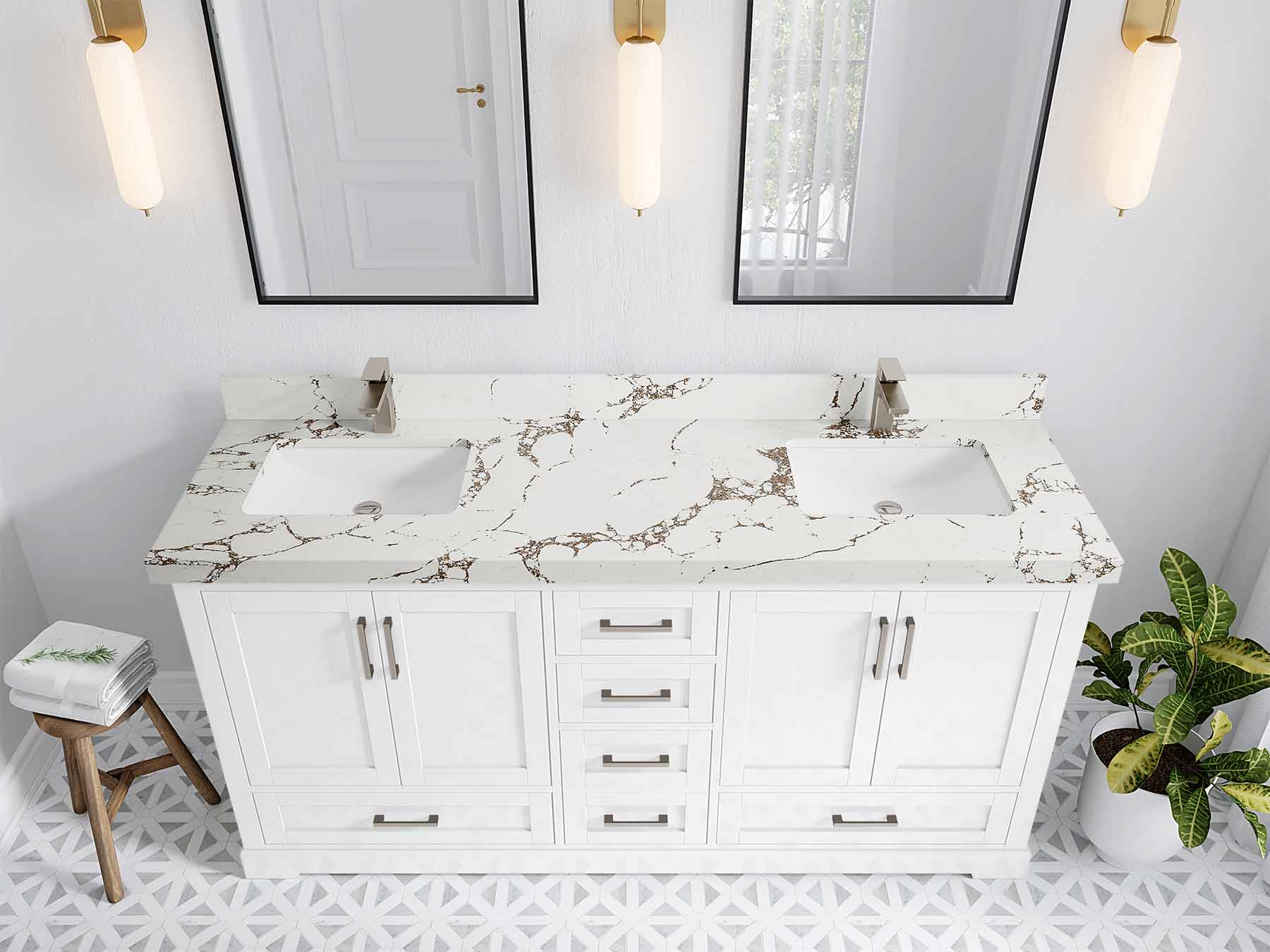 Vanity Countertops options: For Calacatta Laza Quartz, Empira White Quartz, Pure White Quartz, Palissandro Quartz we have 2 options Straight-Mitered Edge and Double Cove Edge; For Calacatta Nuvo Quartz, Carrara Marble, Carrara Quartz, Piatra Gray Quartz, Pearl Light Gray Quartz, Calacatta Black Quartz, Calacatta Gold Quartz, Calacatta Sienna Quartz, Calacatta Poanazzo Quartz, Venatino Quartz, Viola Brown Quartz, Viola Gold Quartz, Viola Night Quartz, Viola Biagio Quartz, Berkshire Brass Quartz, Frosty Carrara Quartz, Onyx Quartz we have Straight - Mitered Edge option.