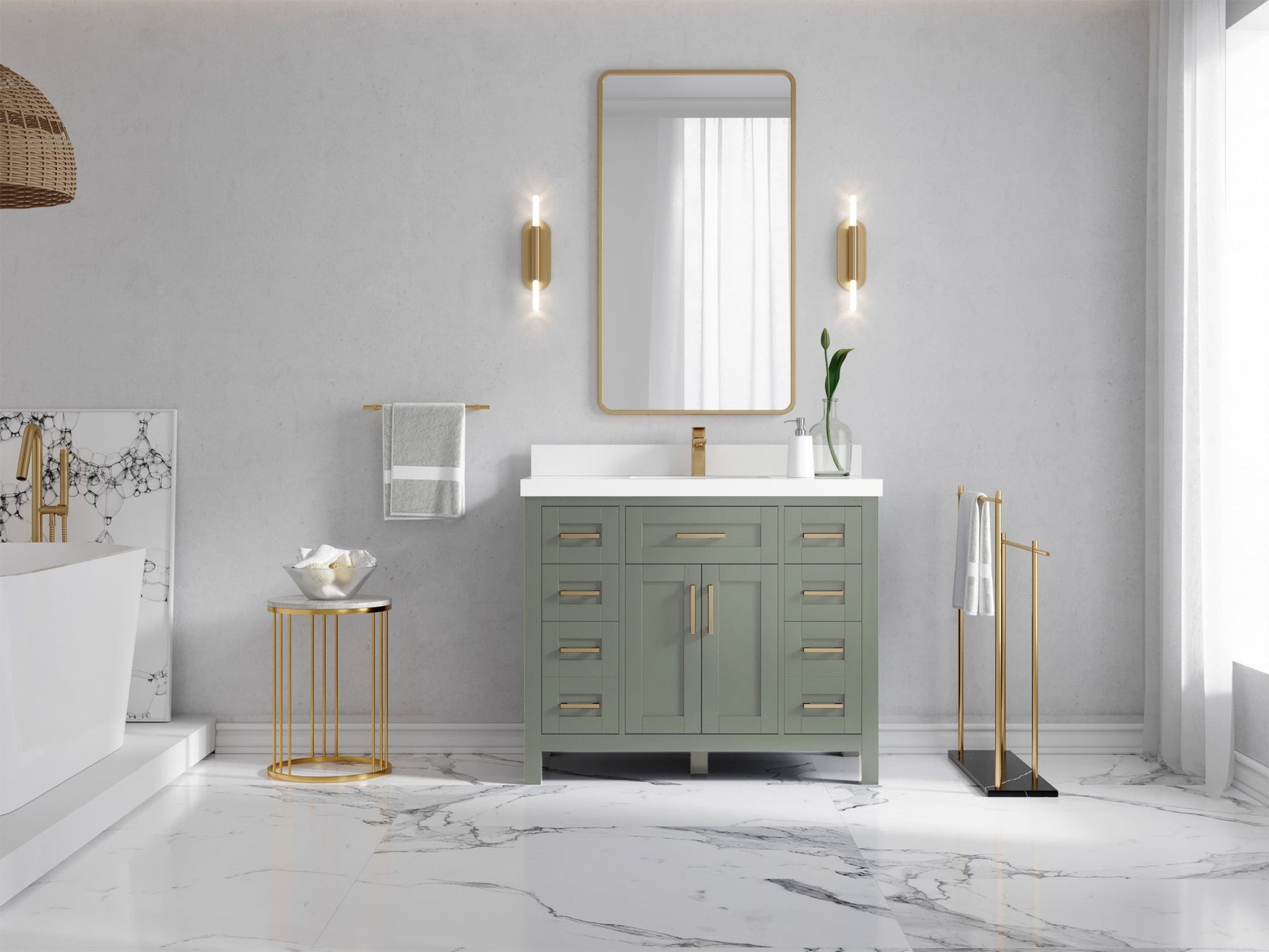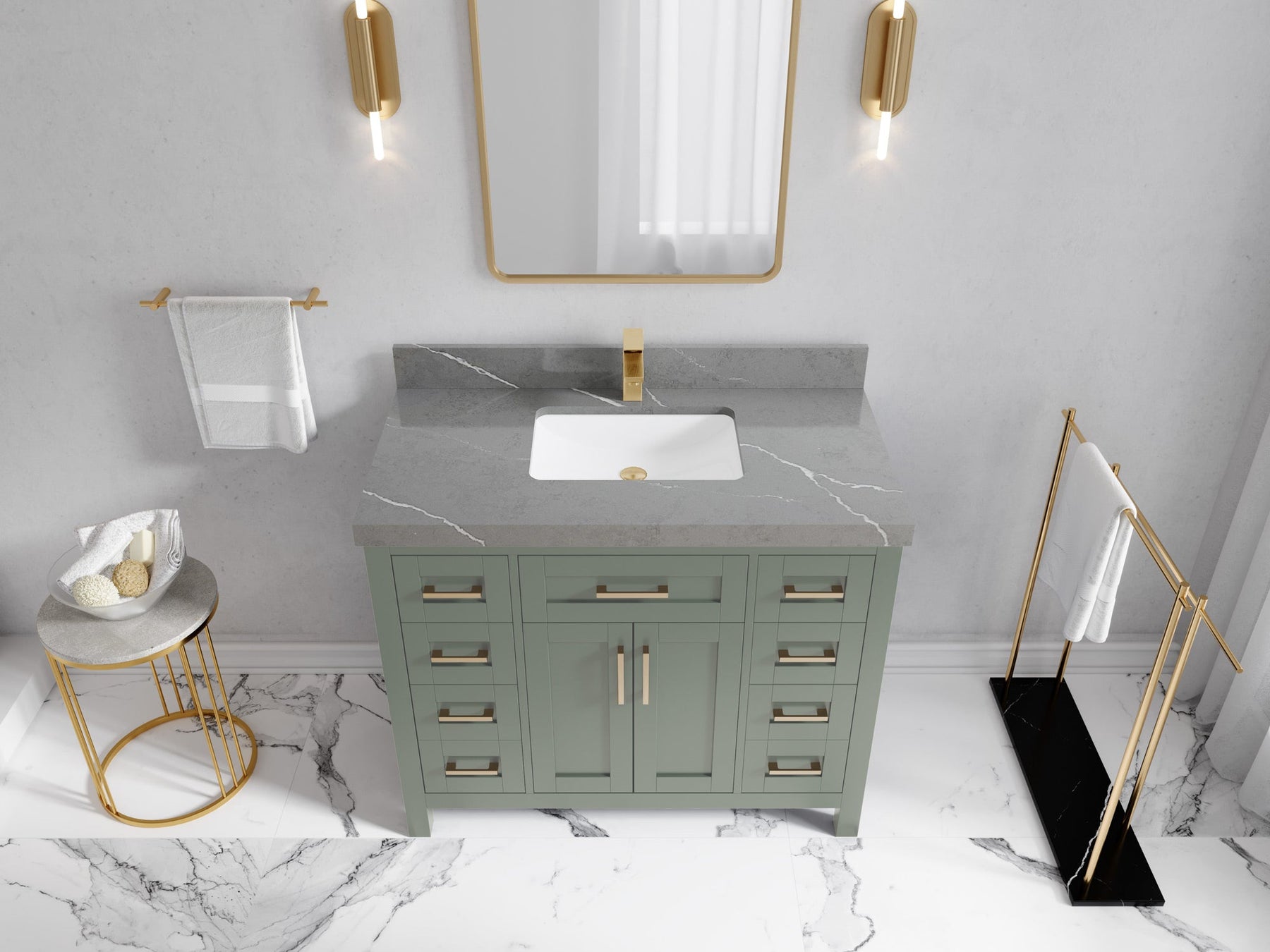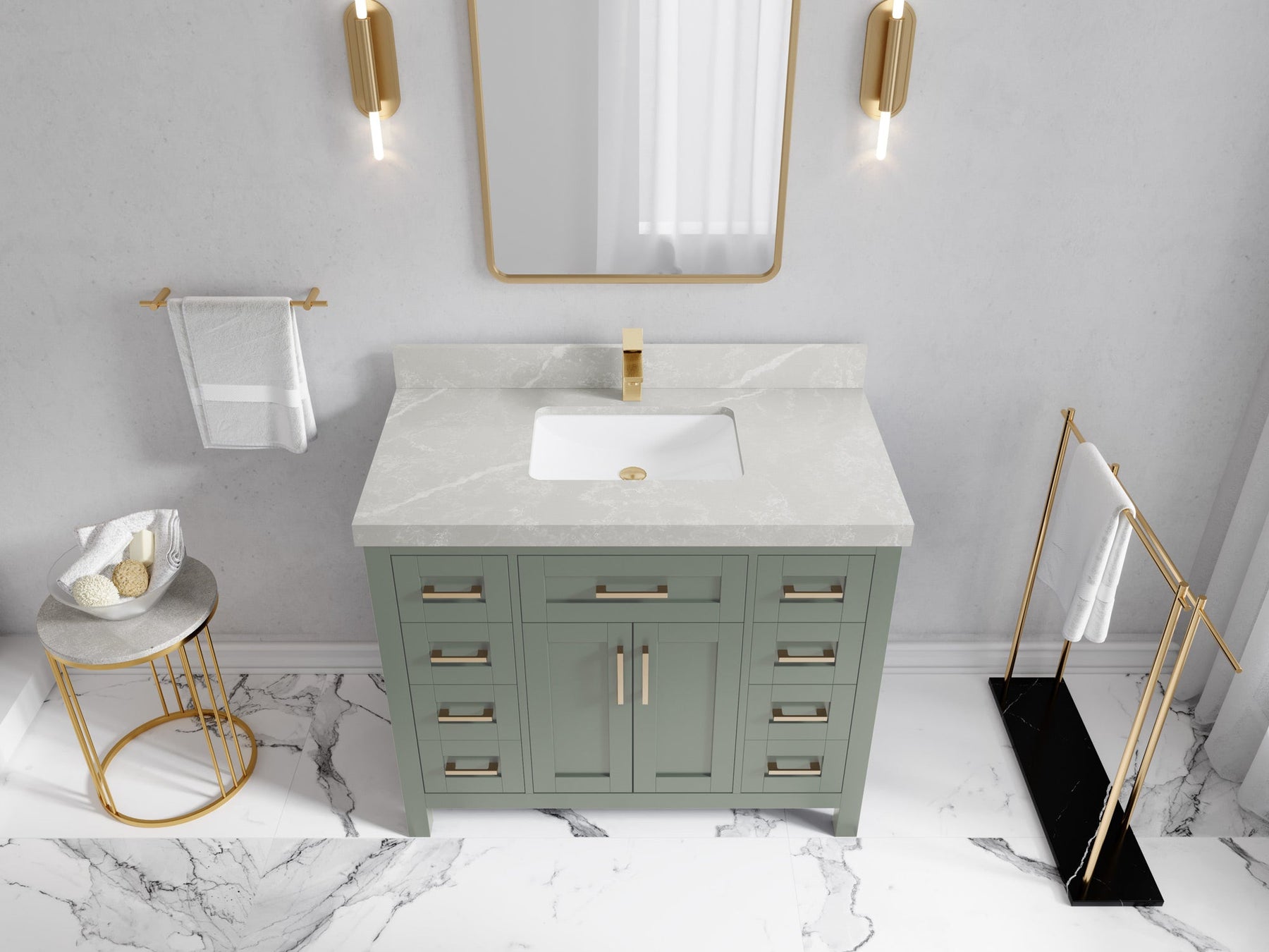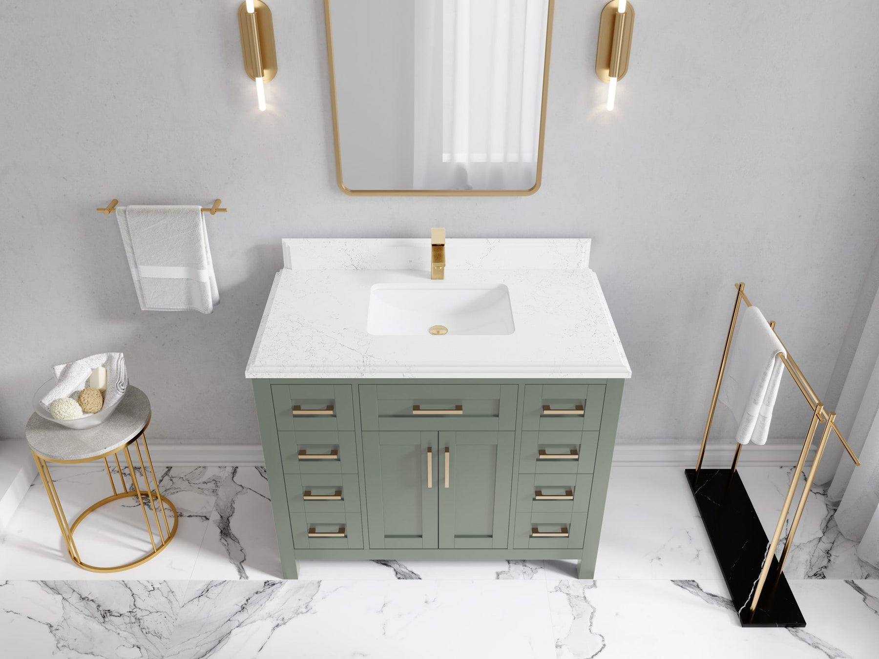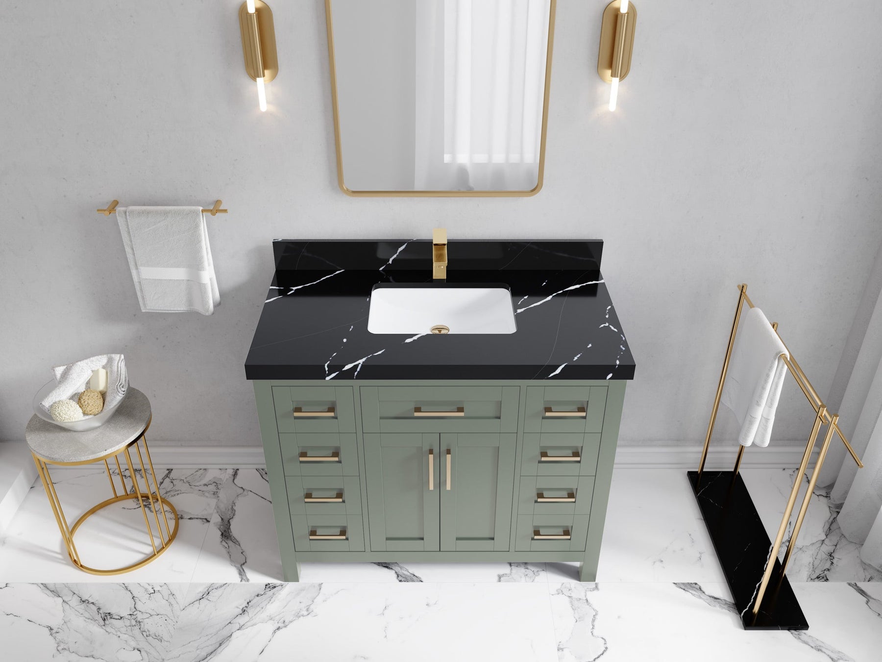 1. Traditional style with a modern twist - made from birch tree and plywood, this bathroom vanity features a clean, contemporary design with soft-close hardware and gold and nickel brushed hardware.