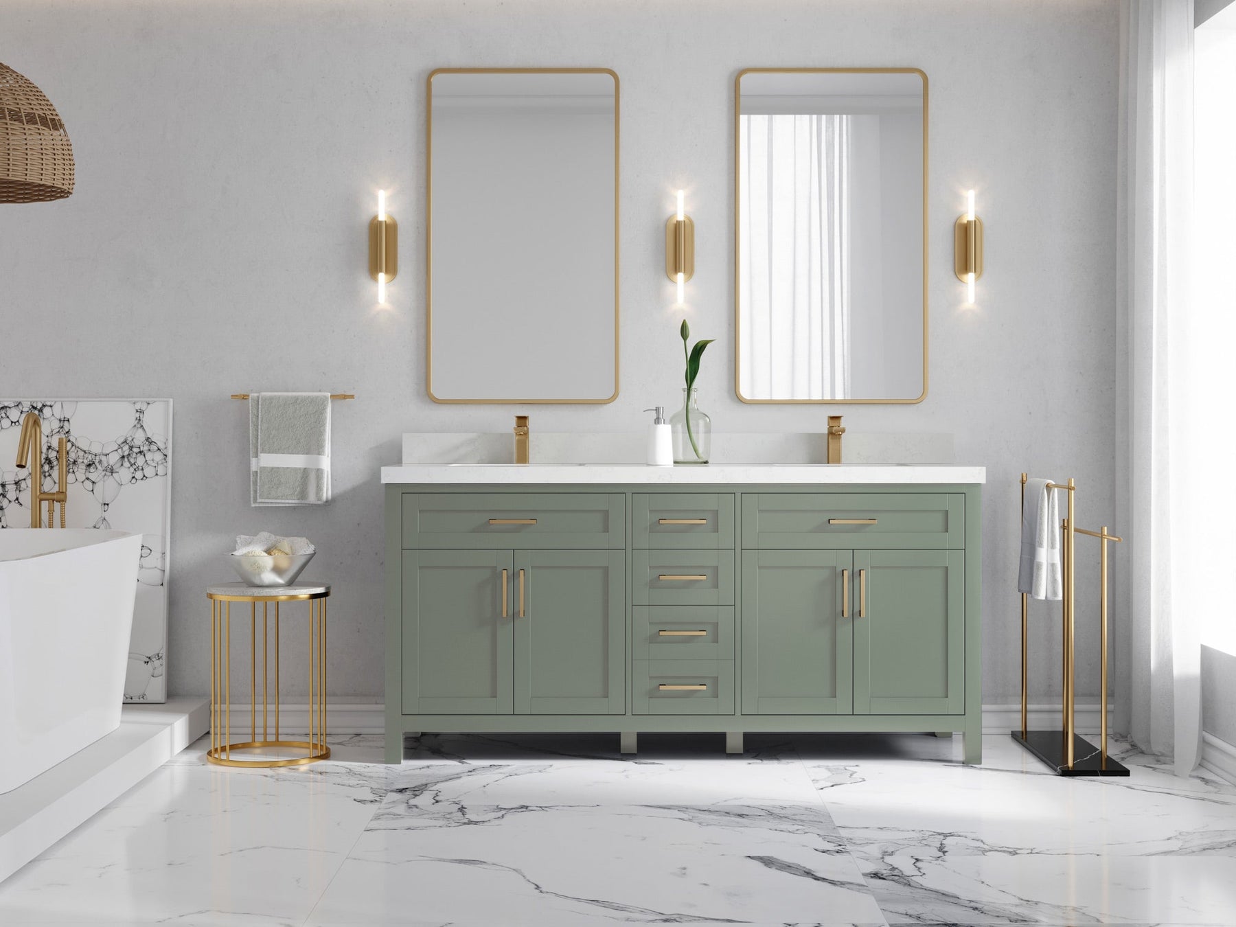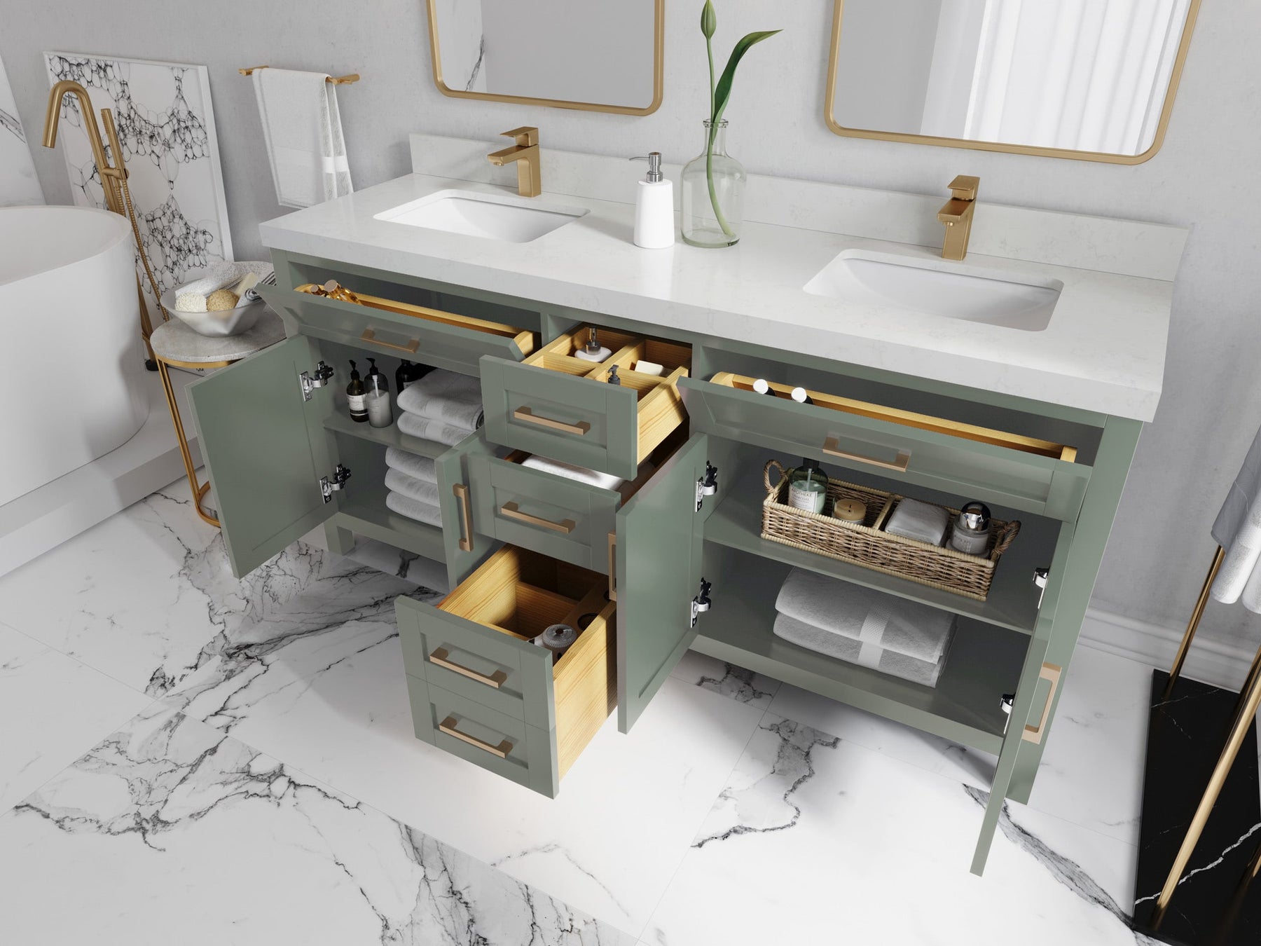 1. Traditional style with a modern twist - made from birch tree and plywood, this bathroom vanity features a clean, contemporary design with soft-close hardware and gold and nickel brushed hardware.