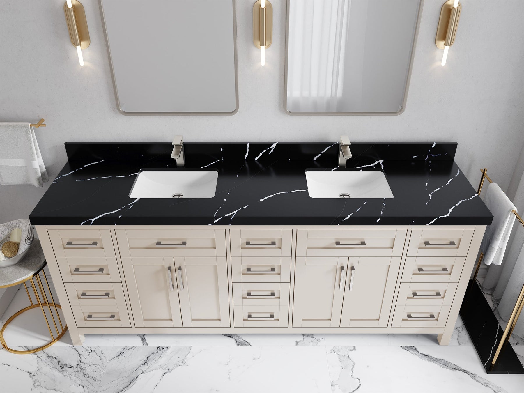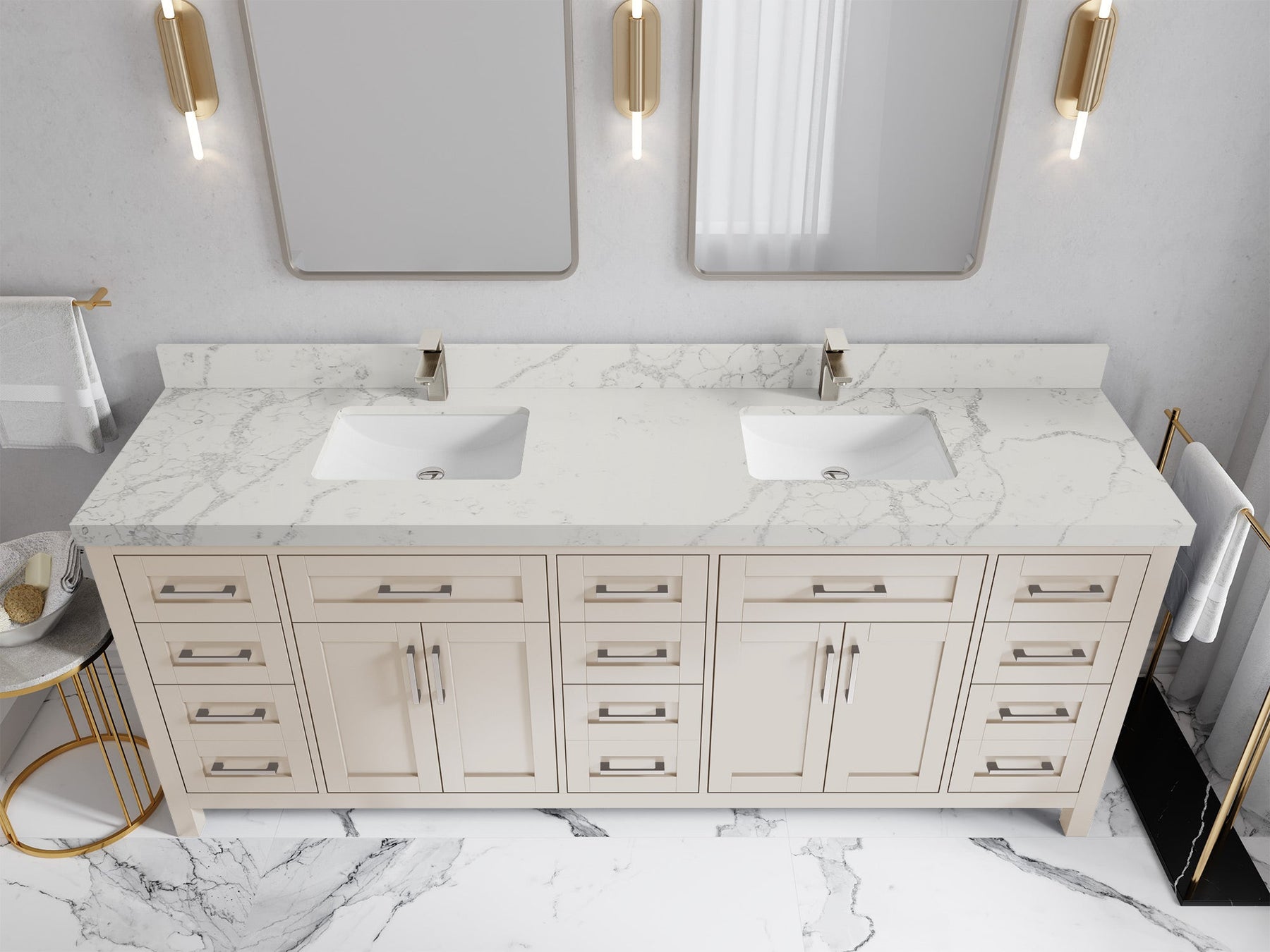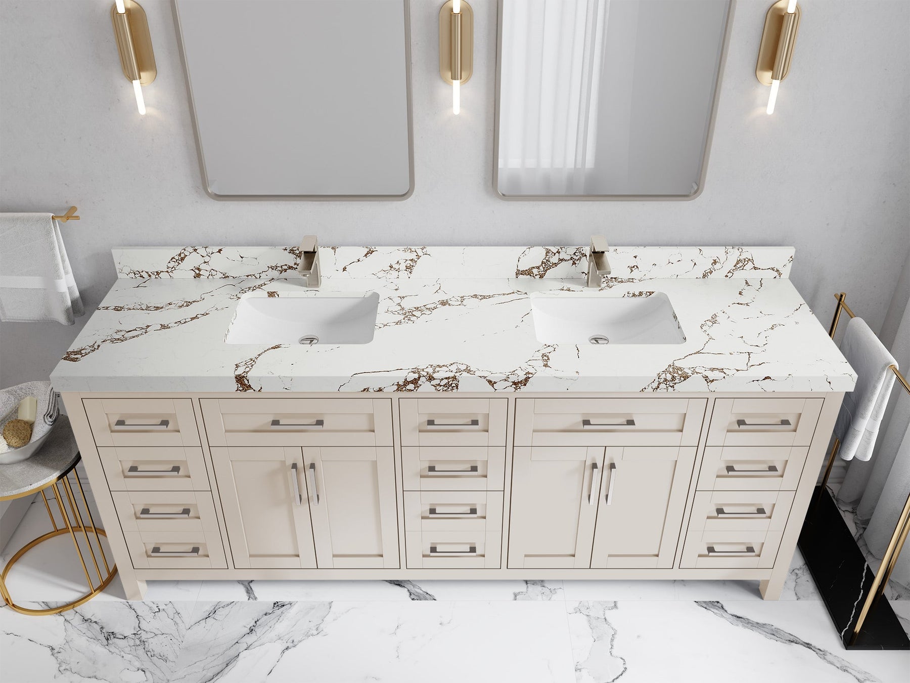 1. Traditional style with a modern twist - made from birch tree and plywood, this bathroom vanity features a clean, contemporary design with soft-close hardware and gold and nickel brushed hardware.