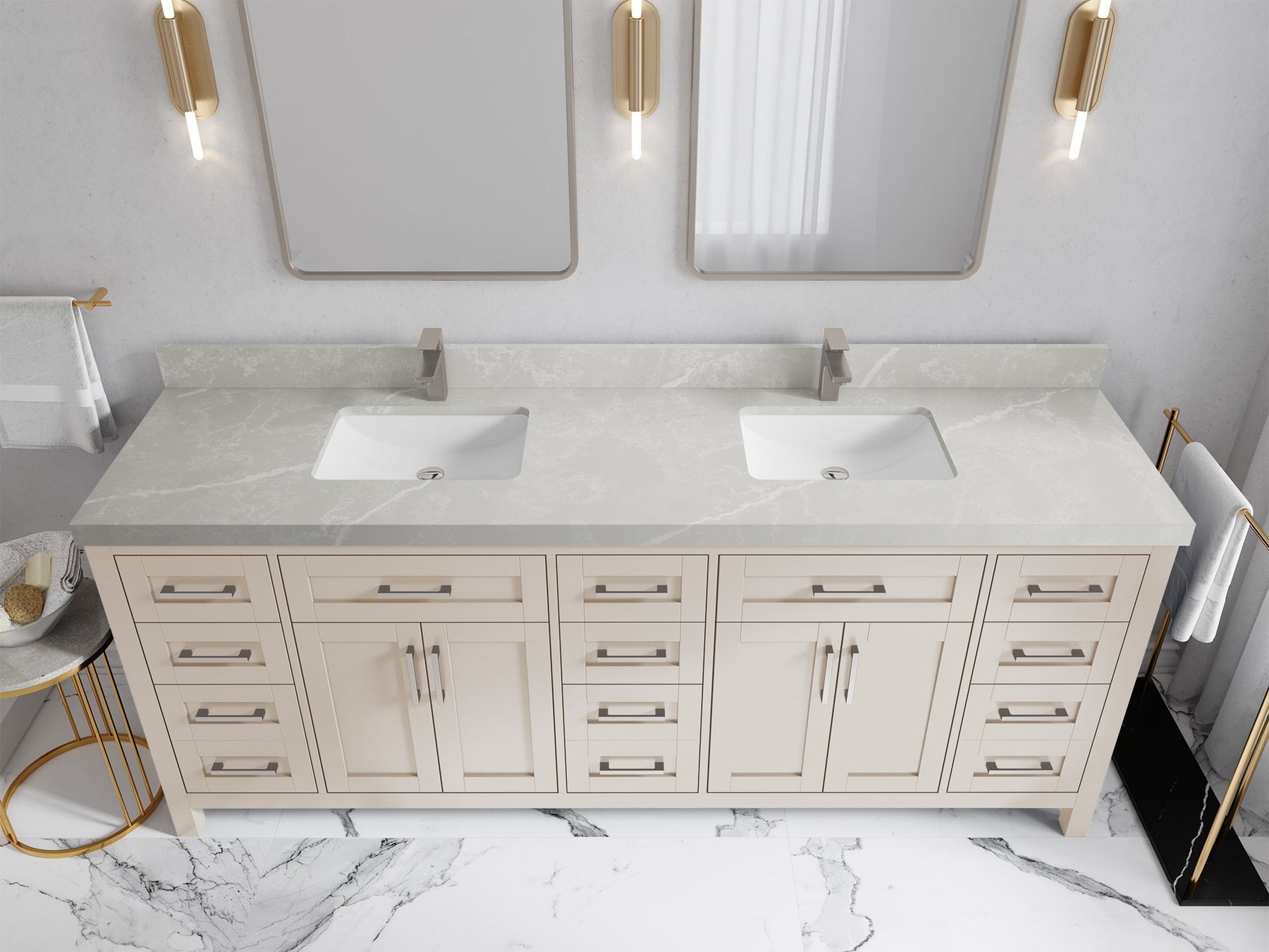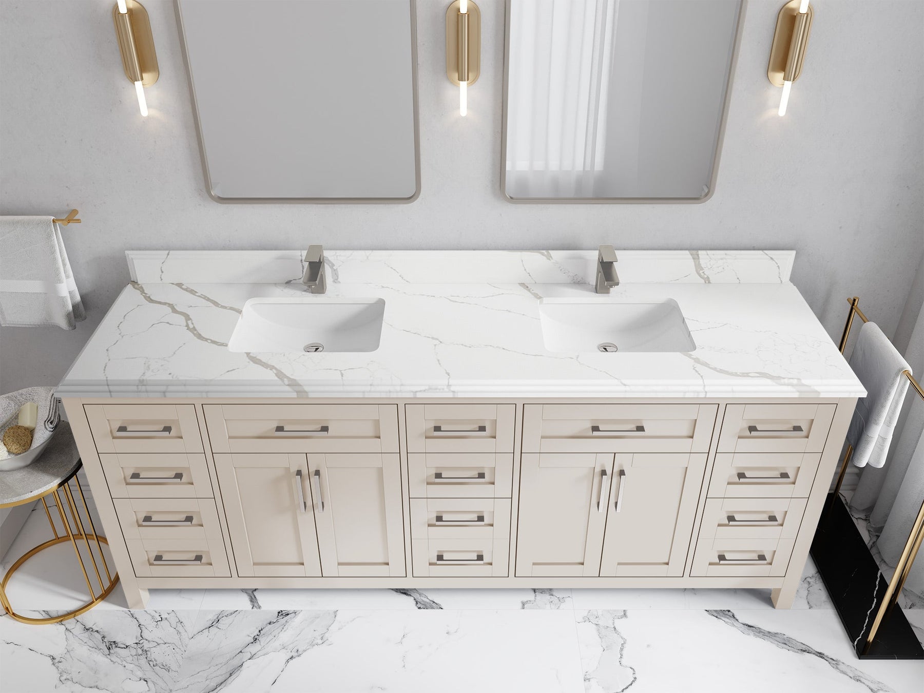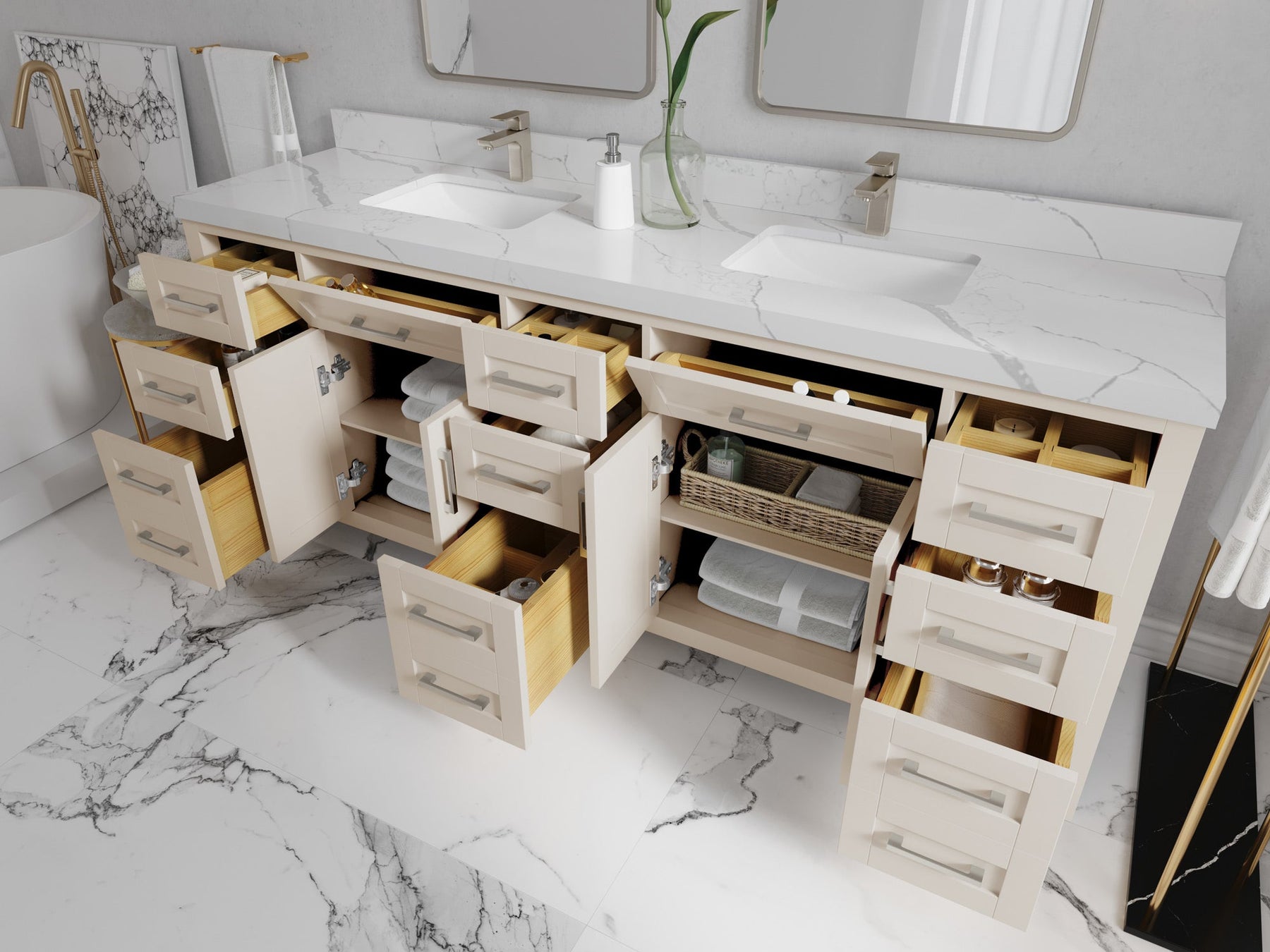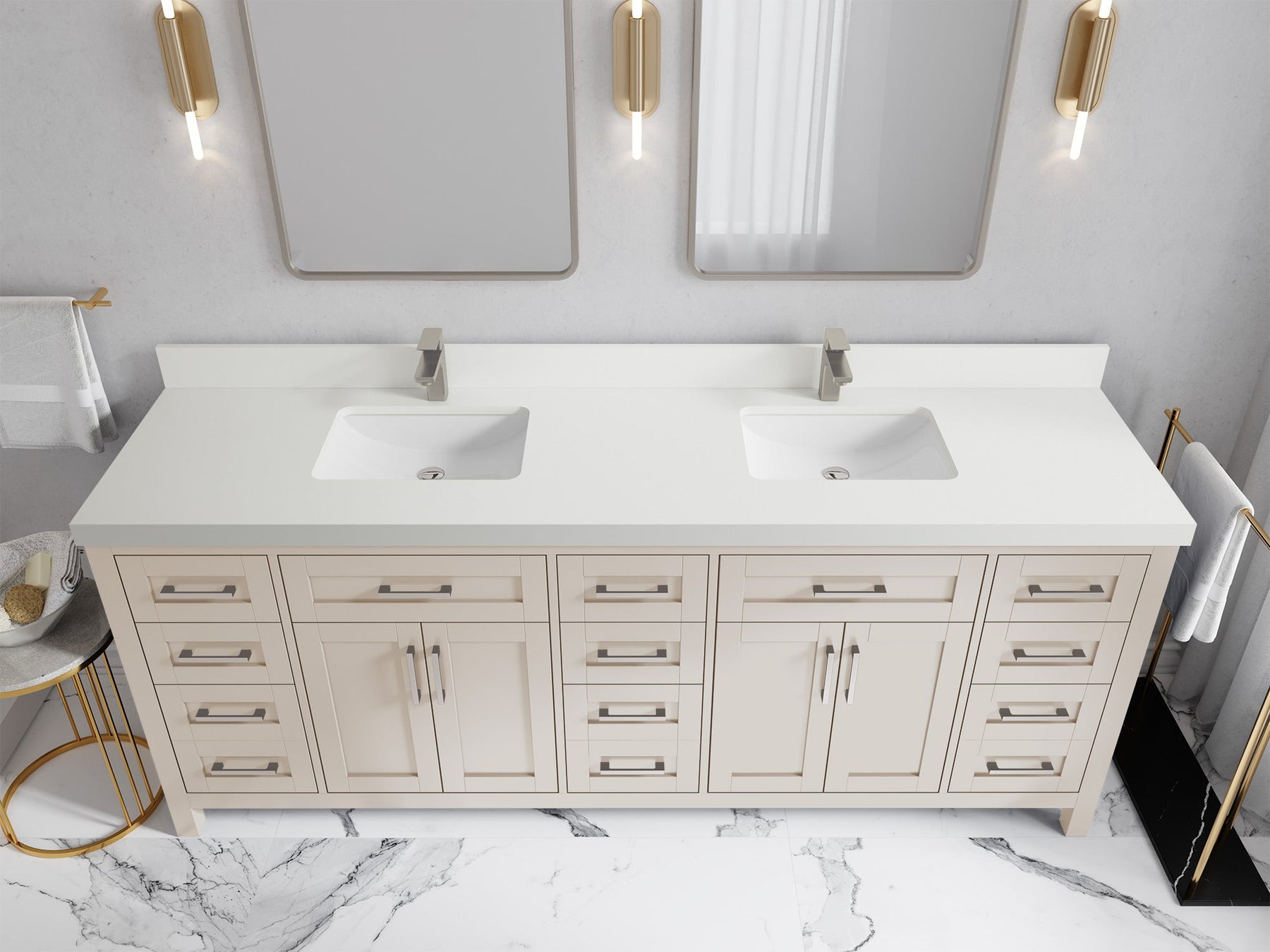 1. Traditional style with a modern twist - made from birch tree and plywood, this bathroom vanity features a clean, contemporary design with soft-close hardware and gold and nickel brushed hardware.
