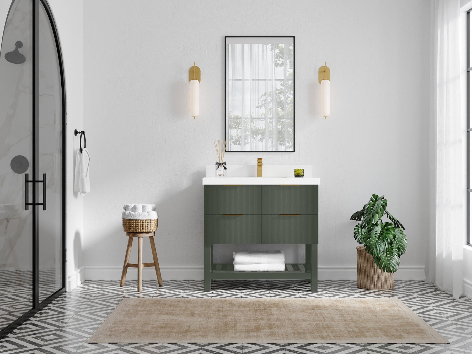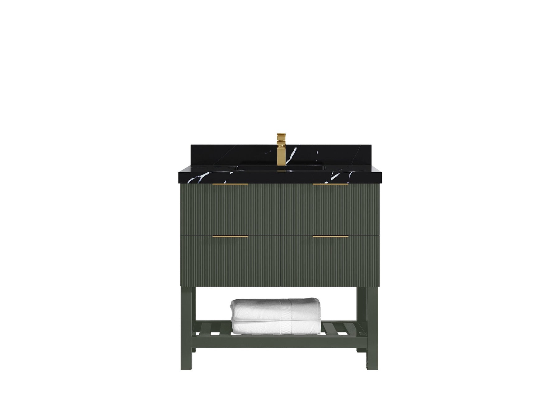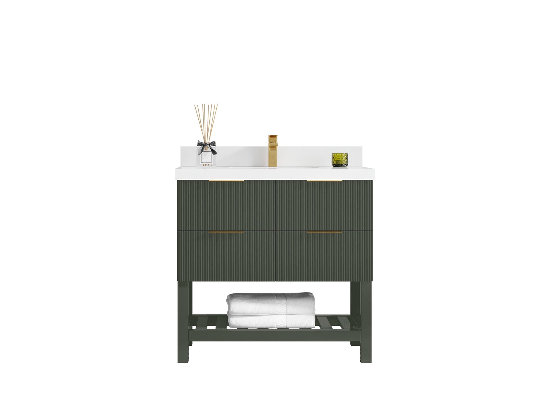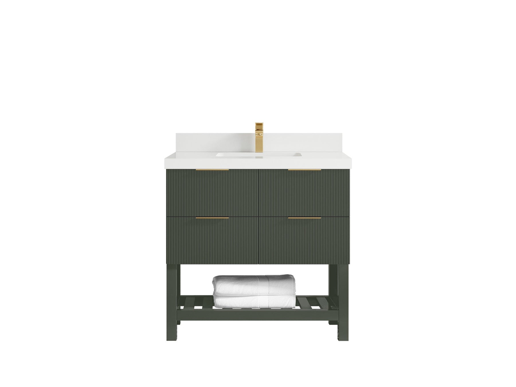The Catalina Collection bathroom vanity is a stylish and functional addition to any modern bathroom. The vanity features a sleek and reeded design, providing a contemporary look and feel. The large open shelf concept of the vanity is perfect for storing and displaying bathroom essentials, such as towels, toiletries, and decor. Crafted from high-quality materials, the Catalina vanity is both durable and long-lasting. The clean lines and minimalist design make it a versatile piece that can complement a range of bathroom styles, from modern to transitional. The open shelf design of the Catalina vanity allows for easy access to items stored on the shelf, while also providing a visually appealing display space. The reeded texture adds a touch of sophistication and elegance to the overall design, making it a statement piece in any bathroom. Overall, the Catalina Collection bathroom vanity is a great choice for those looking for a modern, functional, and stylish bathroom vanity with ample storage space and a unique design.