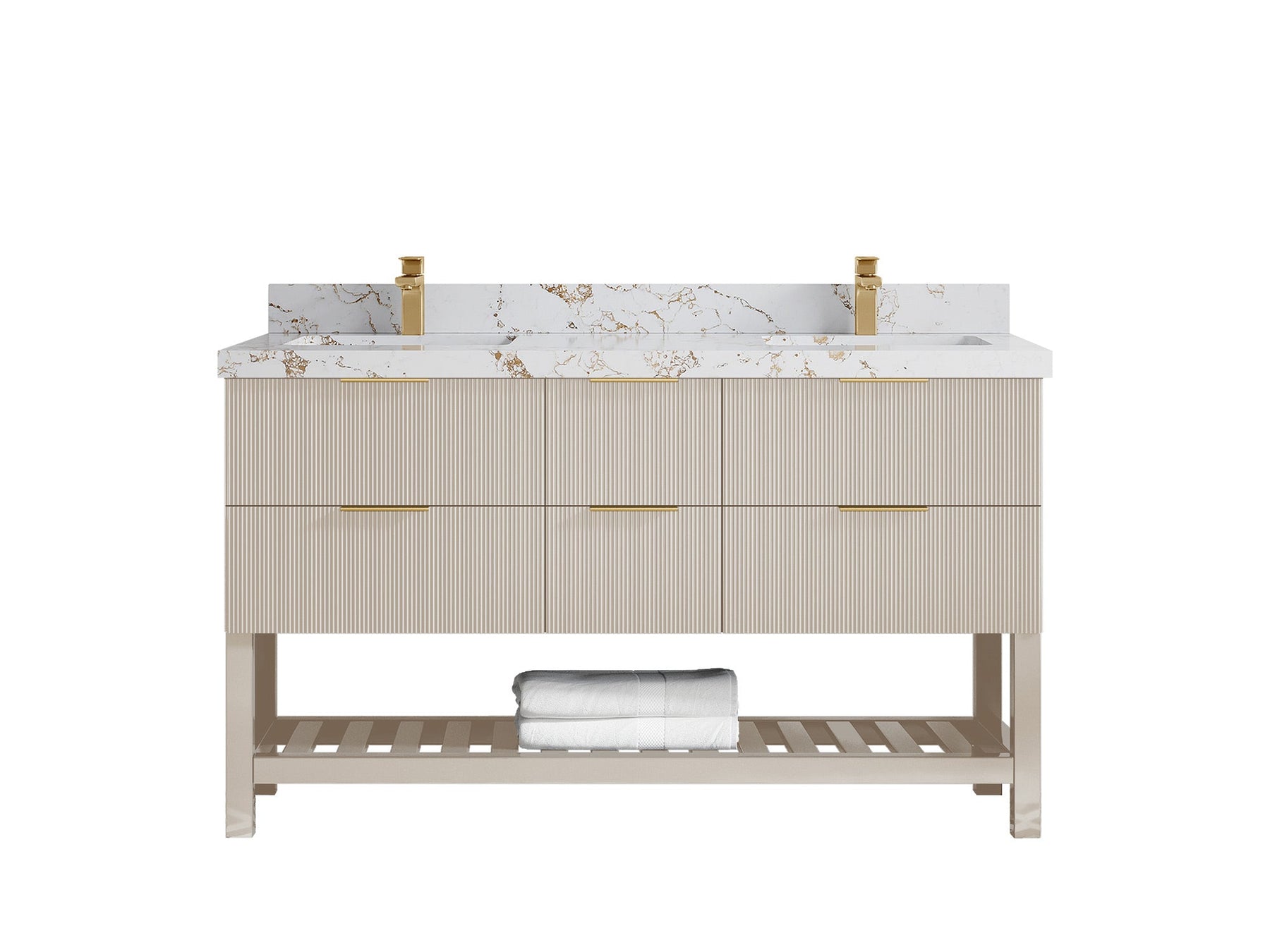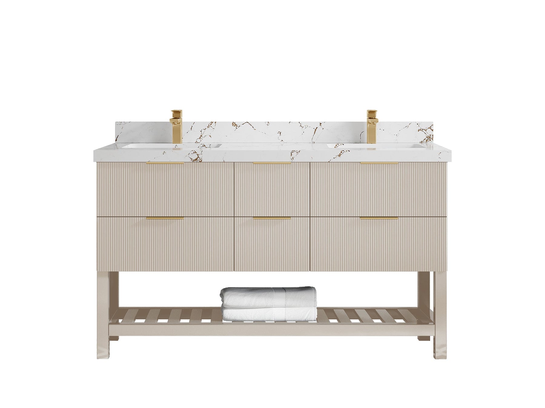 Catalina 60 in. W x 22 in. D Double Sink Bathroom Vanity in Fine Grain with 2 in Calacatta Sienna Quartz Countertop - Top View