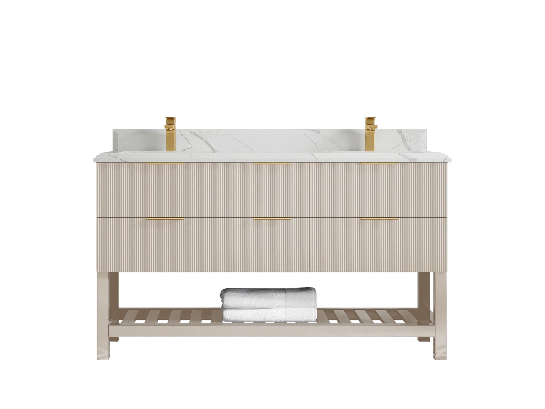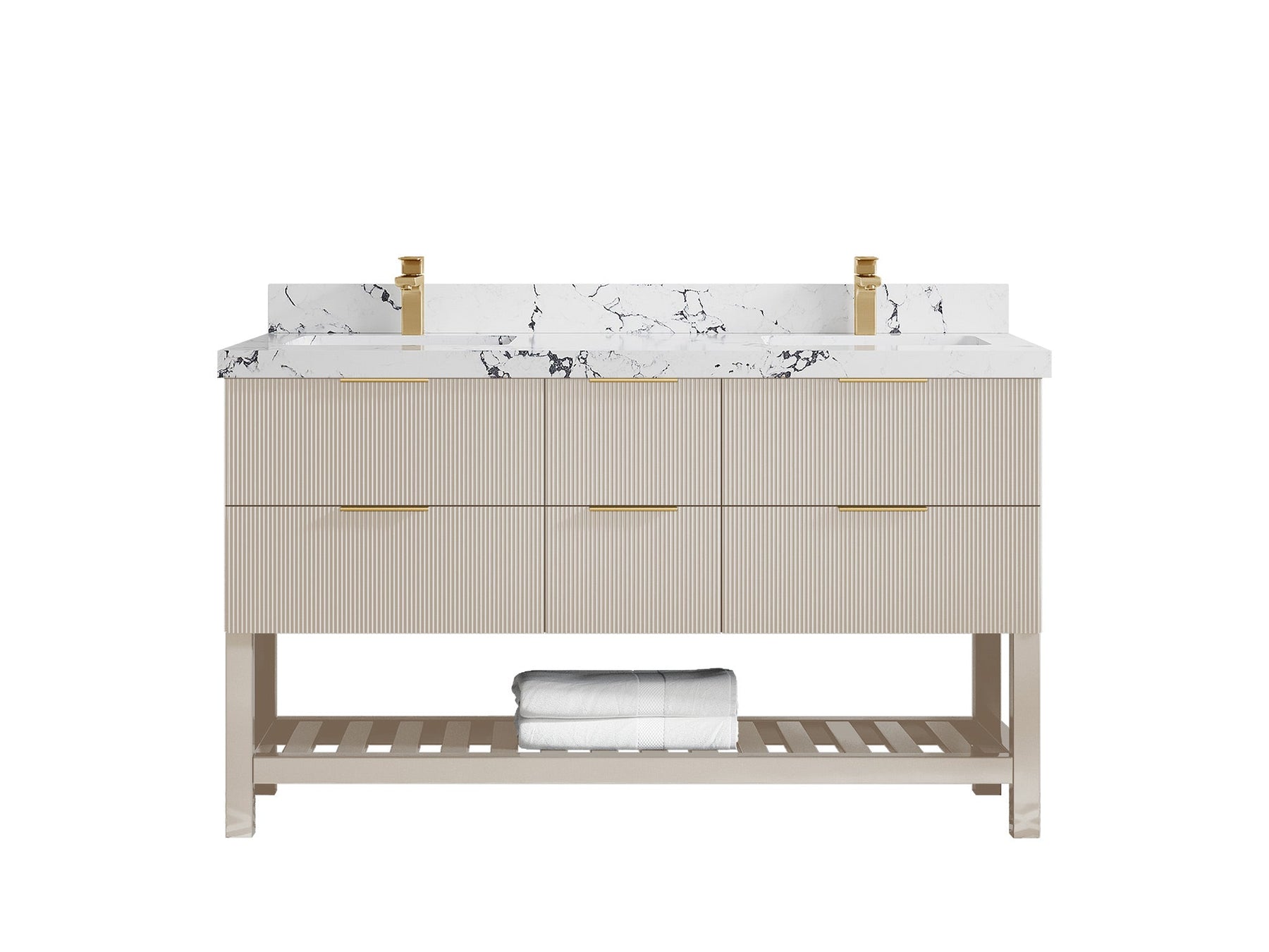 Catalina 60 in. W x 22 in. D Double Sink Bathroom Vanity in Fine Grain with 1.5 in Double Cove Edge Calacatta Laza Quartz Countertop- Top View