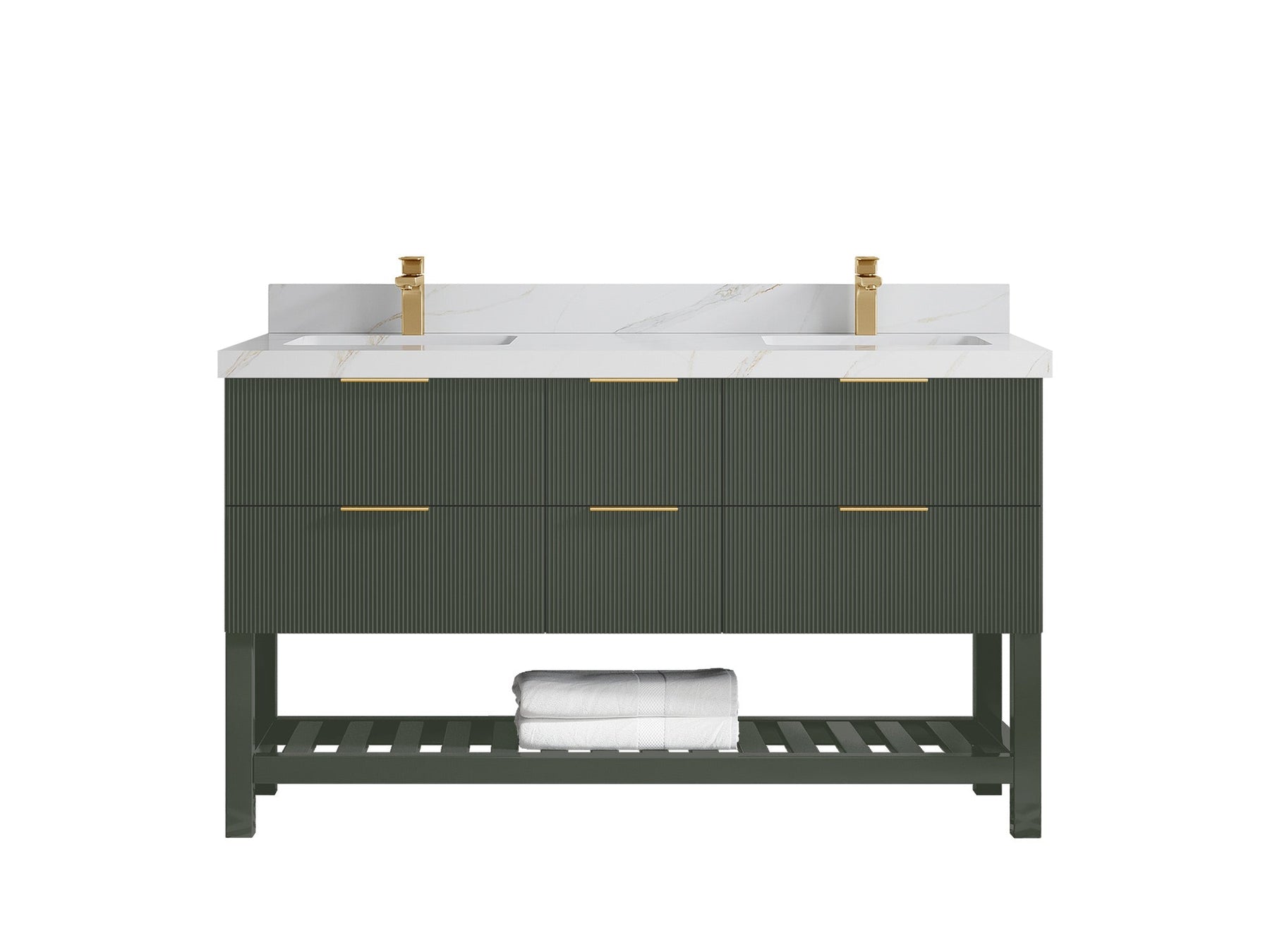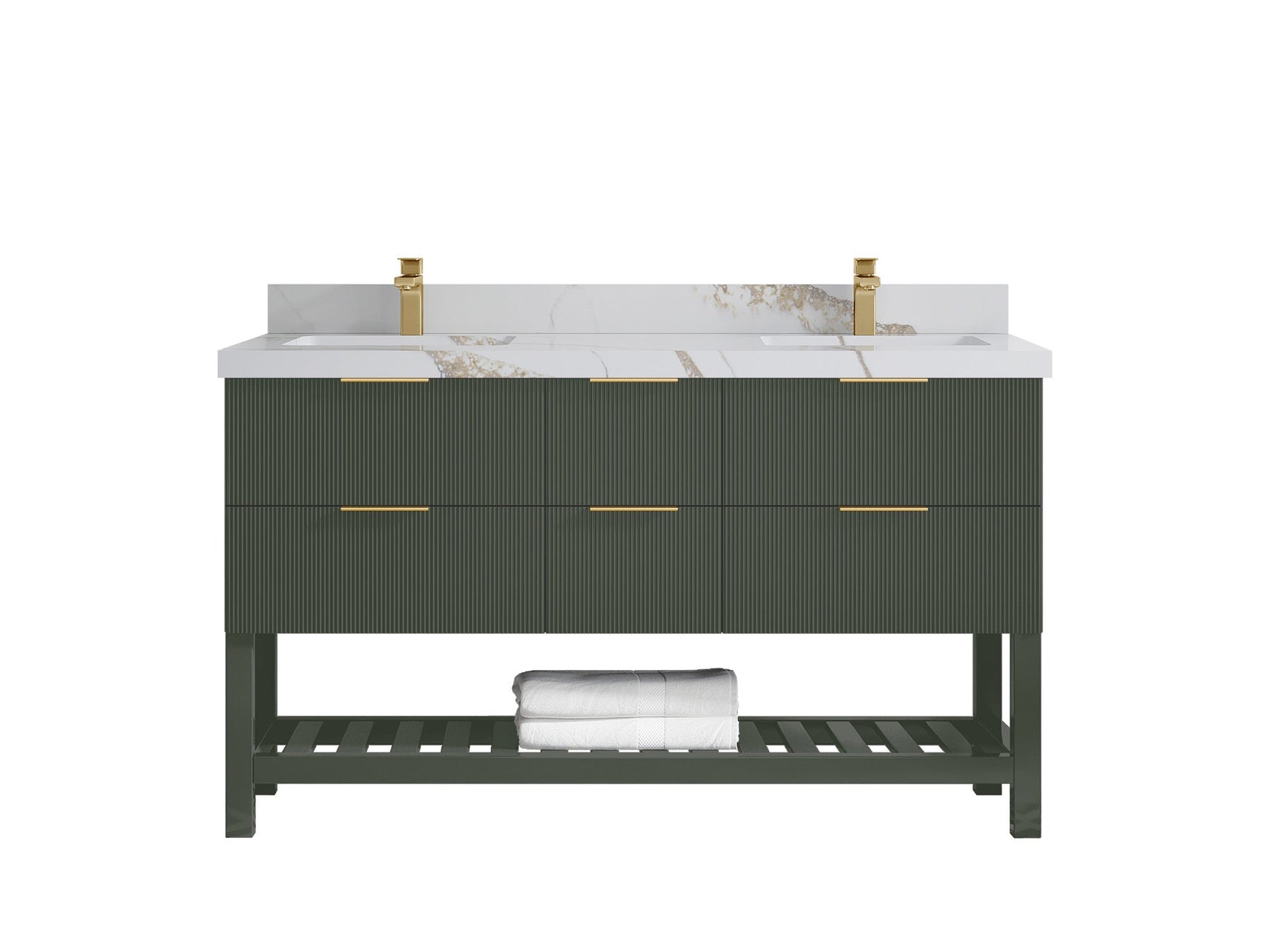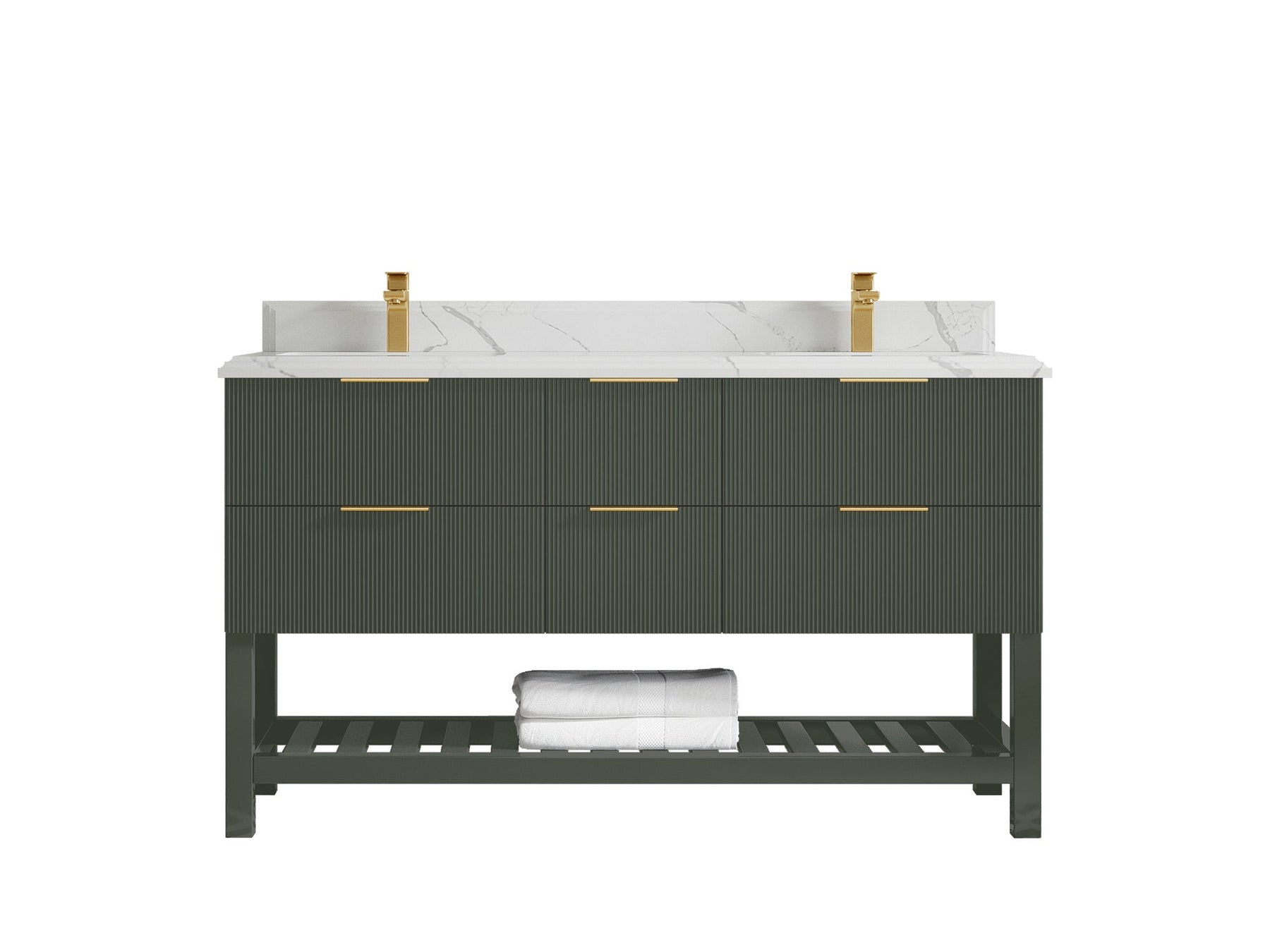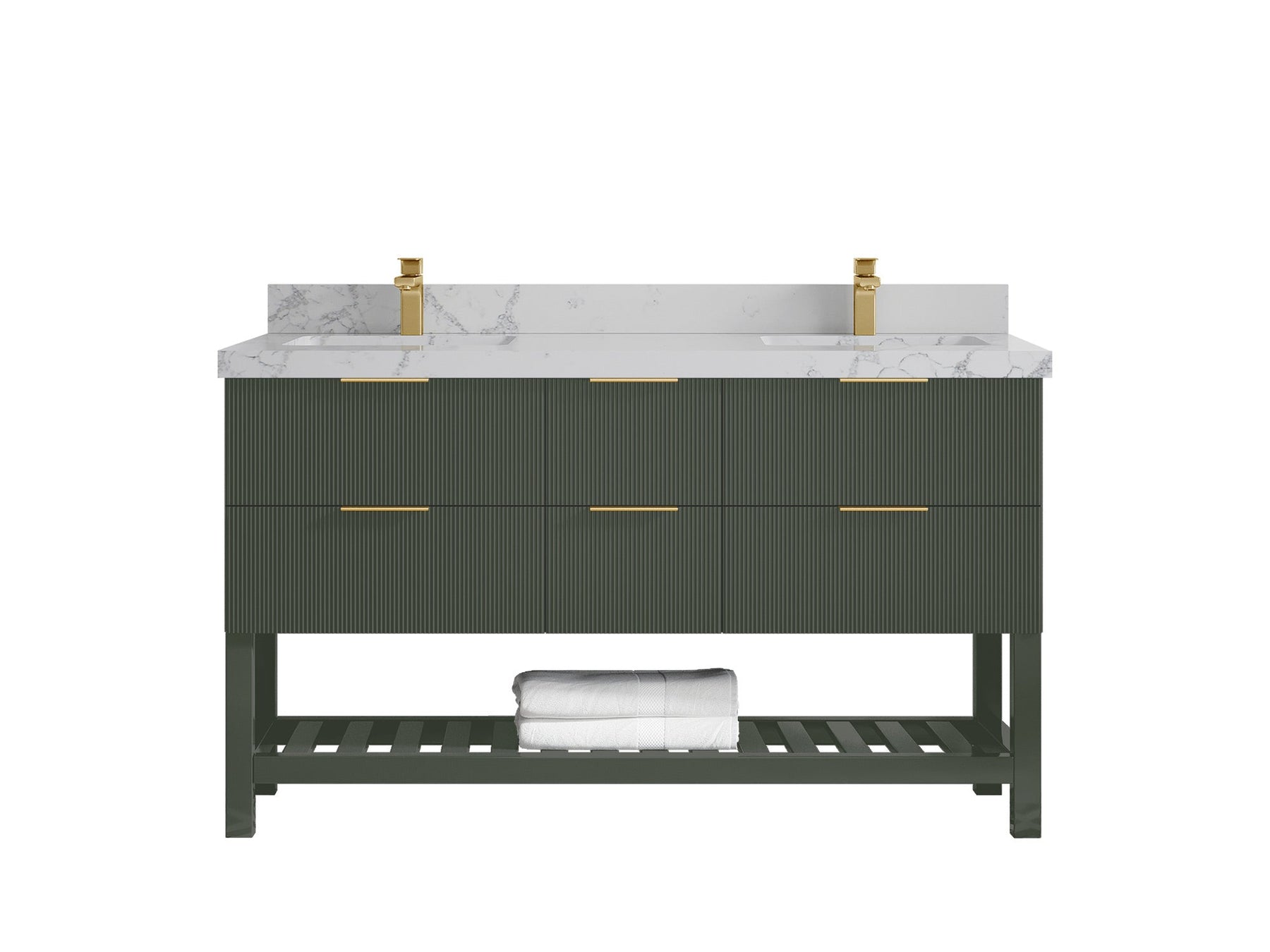 Catalina 60 in. W x 22 in. D Double Sink Bathroom Vanity in Pewter Green with 1.5 in Double Cove Edge Calacatta Laza Quartz Countertop- Top View