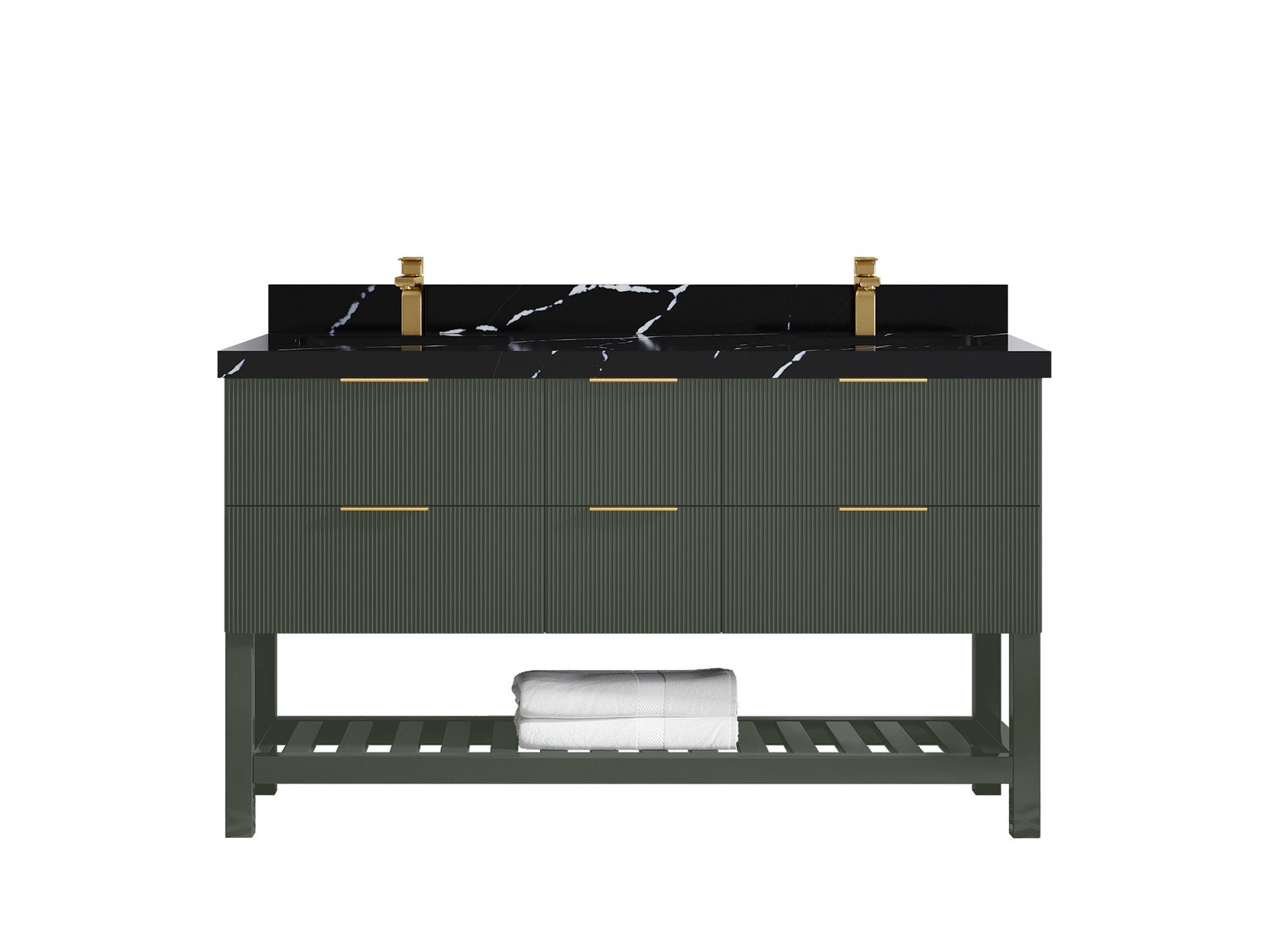 Catalina 60 in. W x 22 in. D Double Sink Bathroom Vanity in Pewter Green with 2 in Calacatta Black Quartz Countertop - Top View