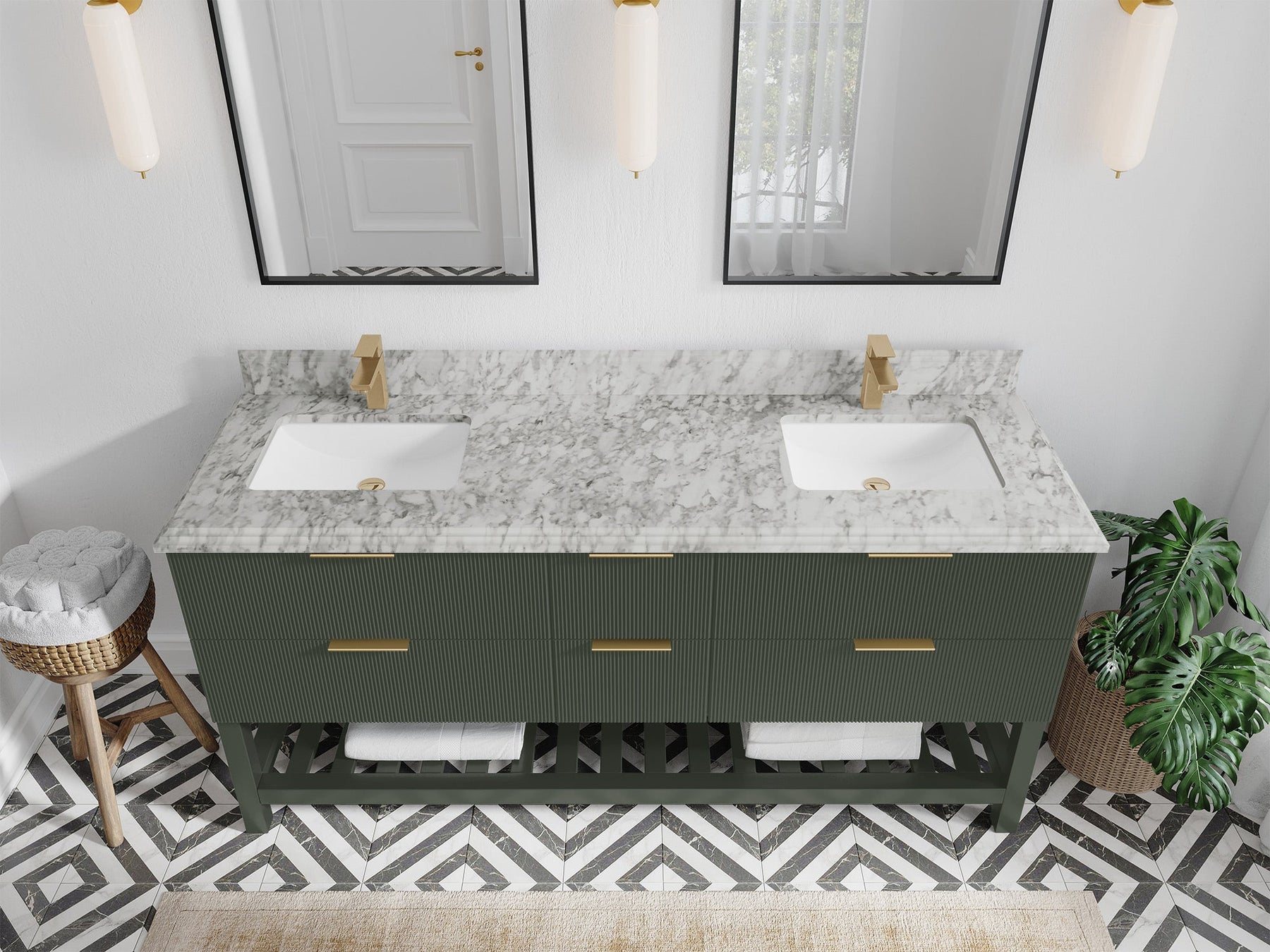 Catalina 72 in. W x 22 in. D Double Sink Bathroom Vanity in Pewter Green with 2 in Carrara Marble Countertop - Top View
