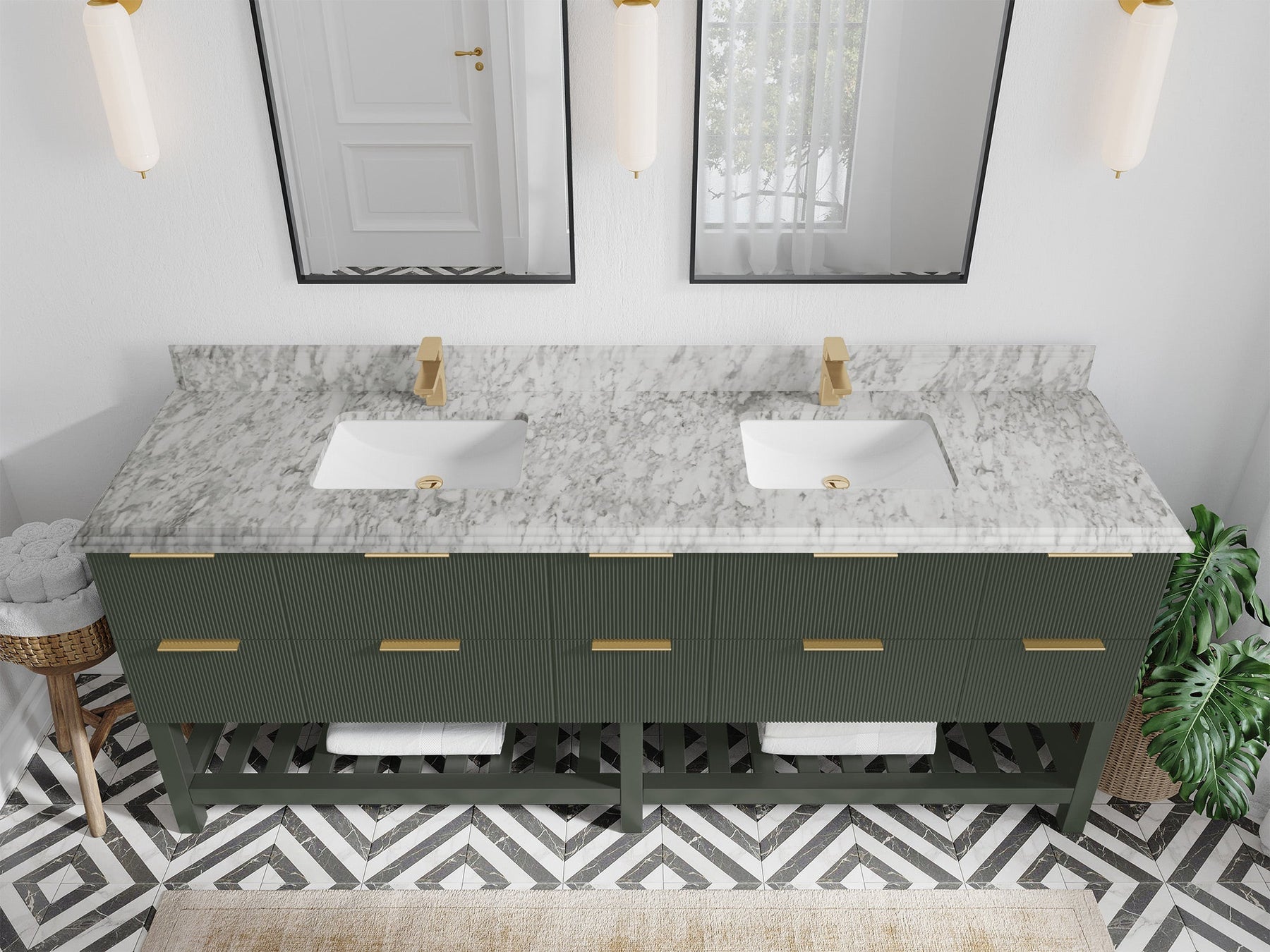 Catalina 84 in. W x 22 in. D Double Sink Bathroom Vanity in Pewter Green with 2 in Carrara Marble Countertop - Top View