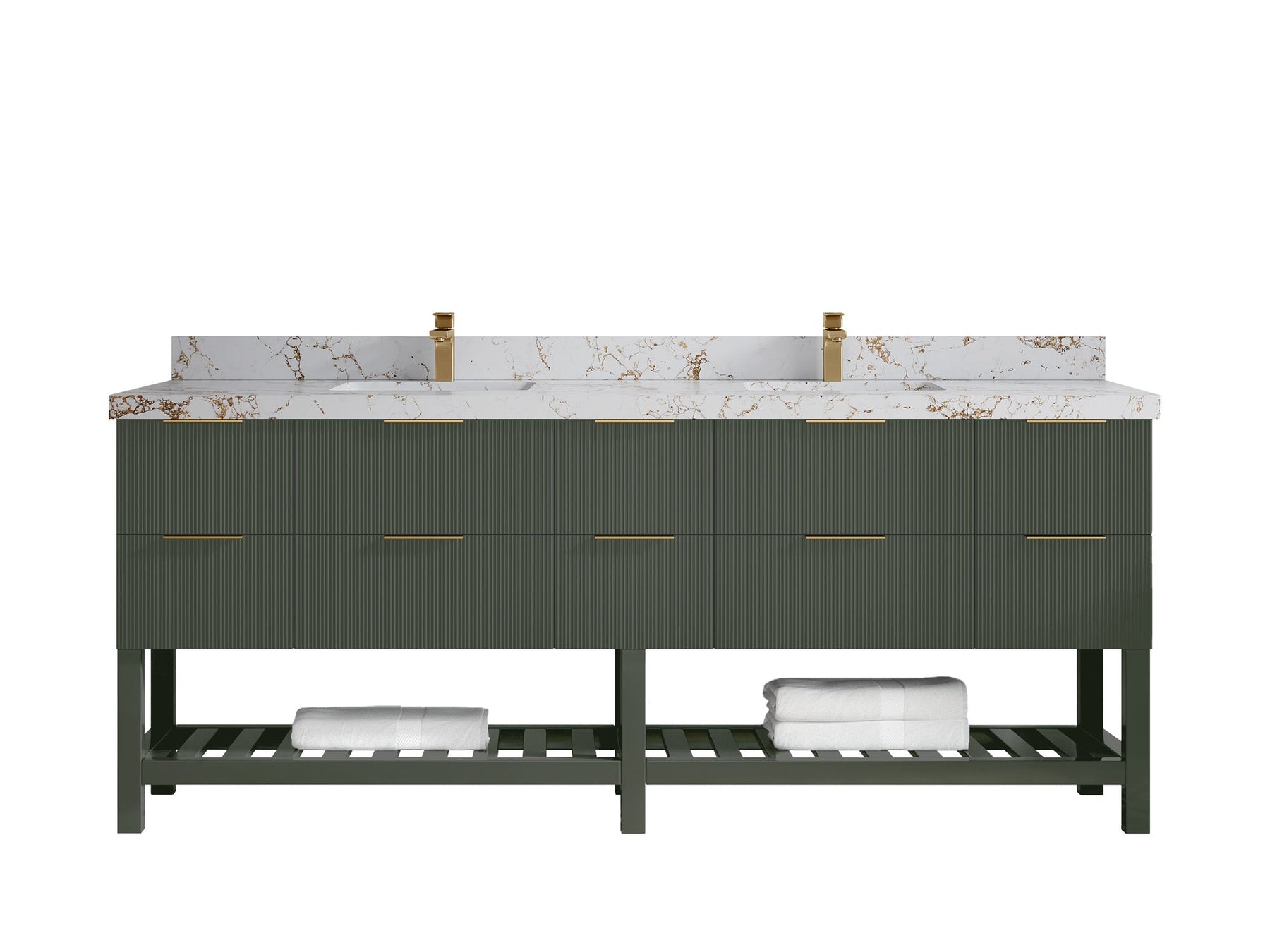 Catalina 84 in. W x 22 in. D Double Sink Bathroom Vanity in Pewter Green with 2 in Calacatta Gold Quartz Countertop - Top View