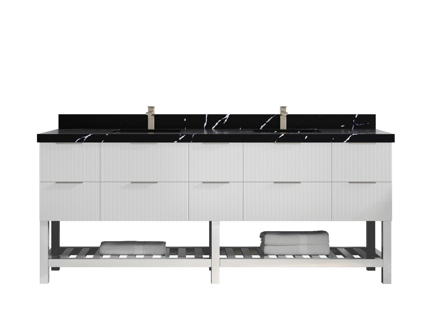 Catalina 84 in. W x 22 in. D Double Sink Bathroom Vanity in White with 2 in Calacatta Black Quartz Countertop - Top View