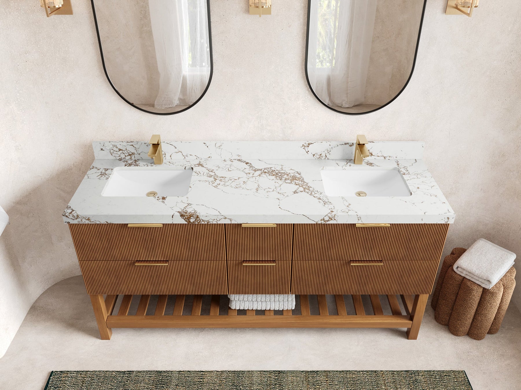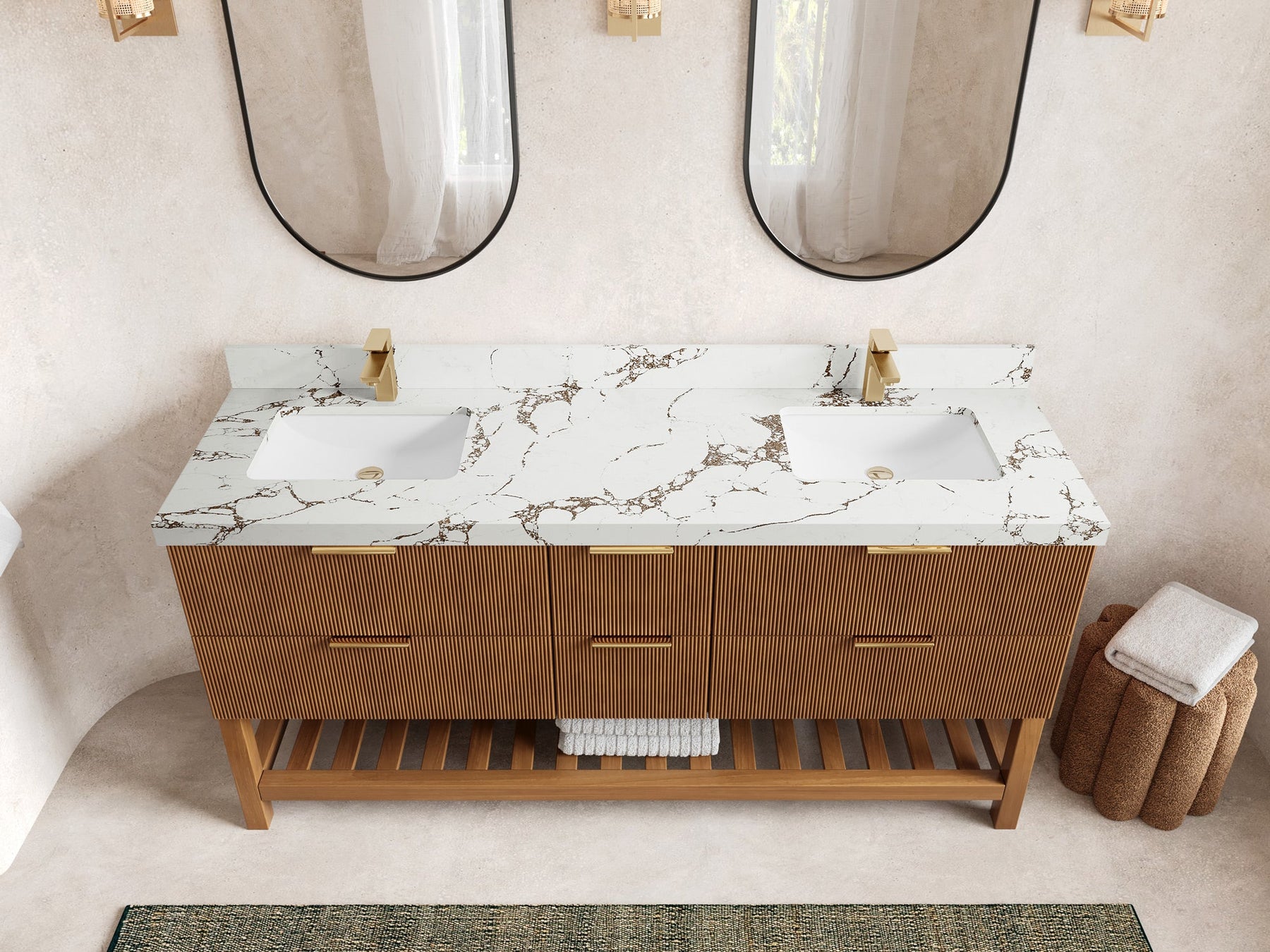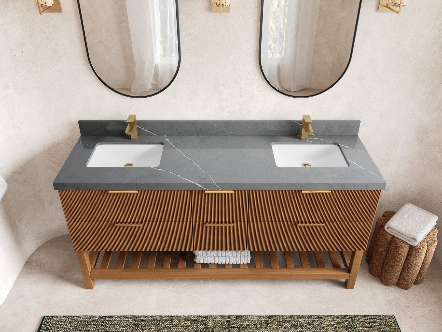 Vanity Countertops options: For Calacatta Laza Quartz, Empira White Quartz, Pure White Quartz we have 2 options Straight-Mitered Edge & Double Cove Edge, For Calacatta Black Quartz, Calacatta Gold Quartz, Calacatta Nuvo Quartz, Carrara Marble, Carrara Quartz, Pearl Light Gray Quartz, Piatra Gray Quartz, Venatino Quartz, and Light Concrete Gray Quartz we only have Straight - Mitered Edge option.