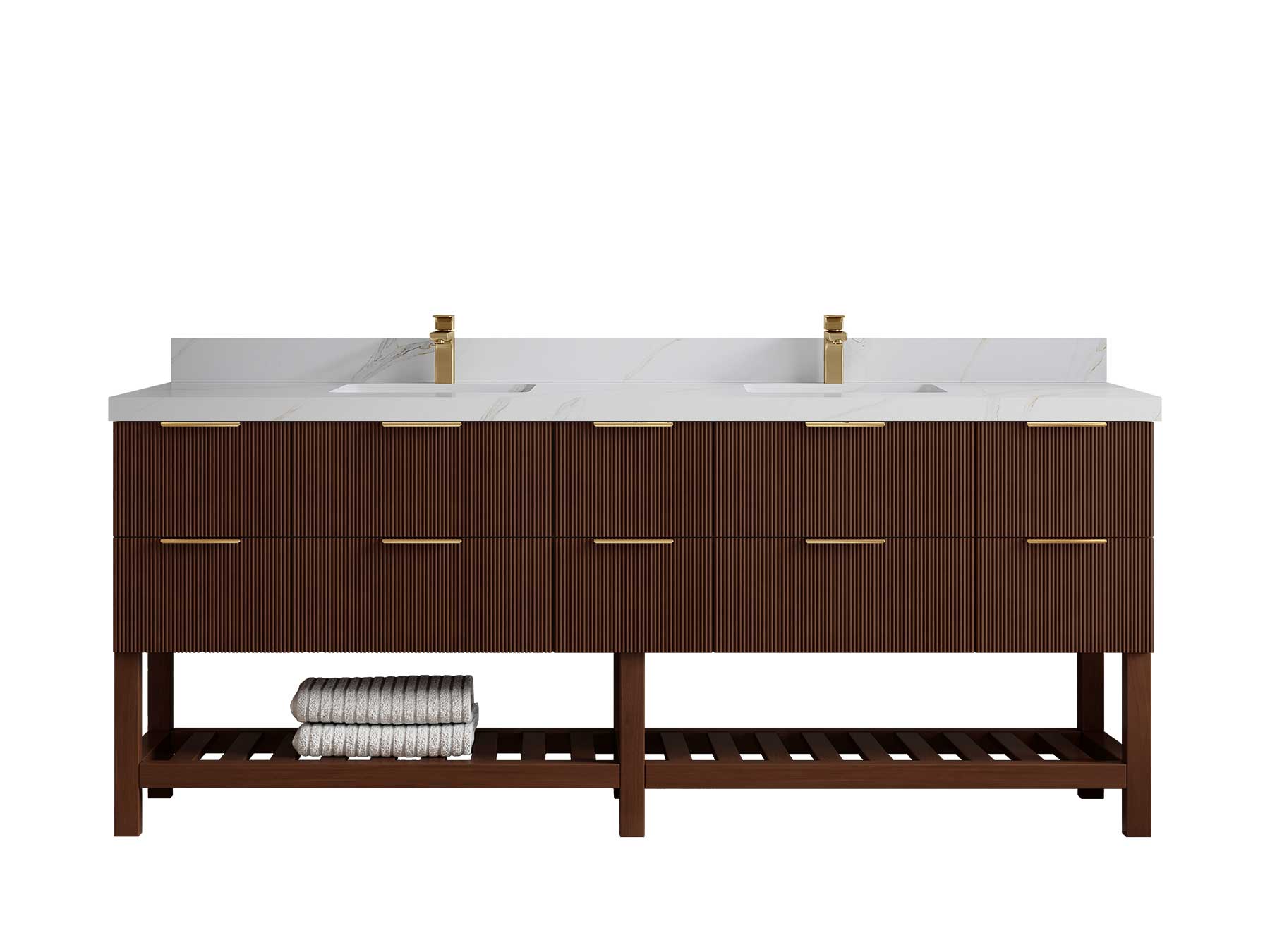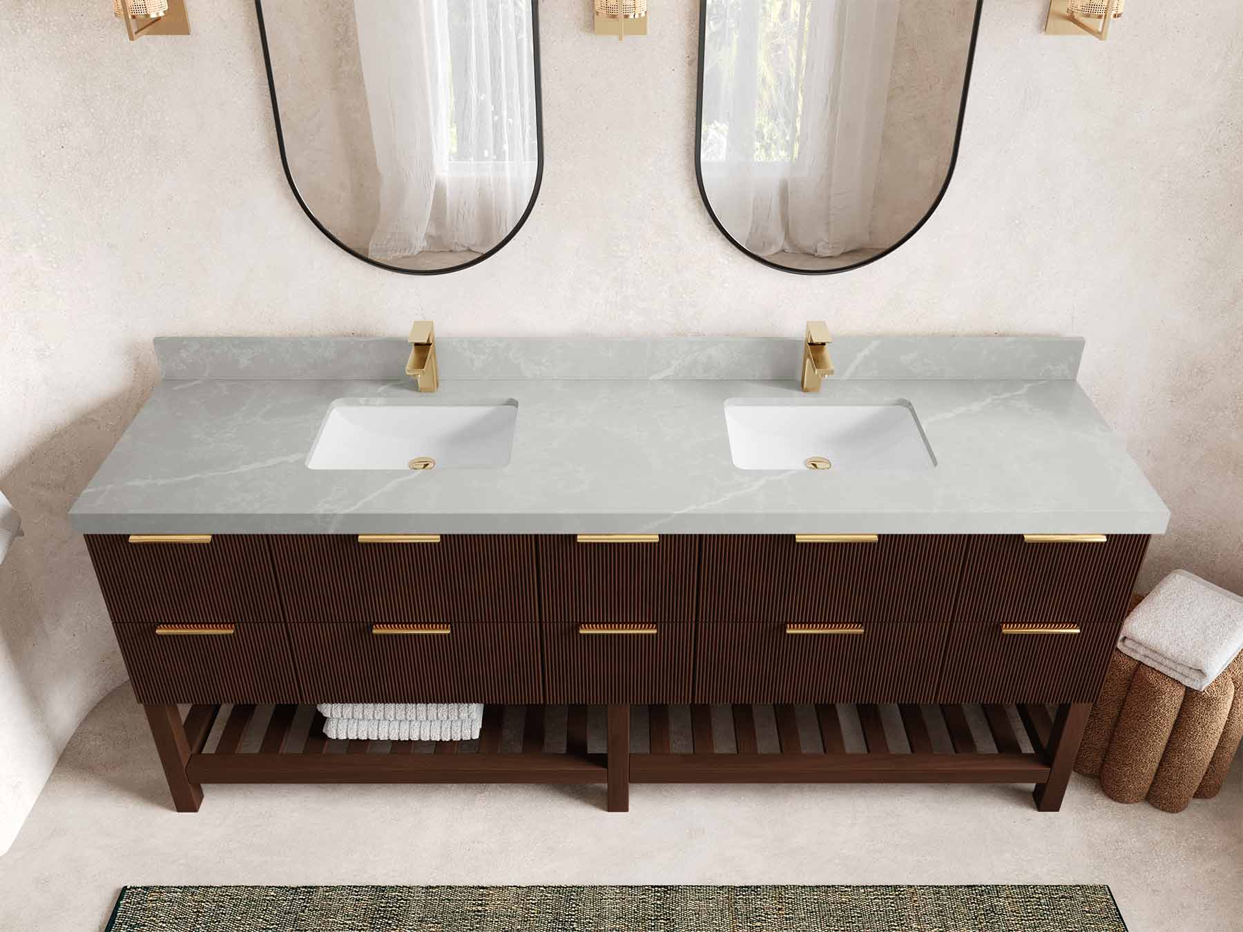 Vanity Countertops options: For Calacatta Laza Quartz, Empira White Quartz, Pure White Quartz, Palissandro Quartz, Calacatta Nuvo Quartz, Carrara Marble, Carrara Quartz, Piatra Gray Quartz, Pearl Light Gray Quartz, Calacatta Black Quartz, Calacatta Gold Quartz, Calacatta Sienna Quartz, Calacatta Poanazzo Quartz, Venatino Quartz, Viola Brown Quartz, Viola Gold Quartz, Viola Night Quartz, Viola Biagio Quartz, Berkshire Brass Quartz, Frosty Carrara Quartz, Onyx Quartz we have Straight - Mitered Edge option.