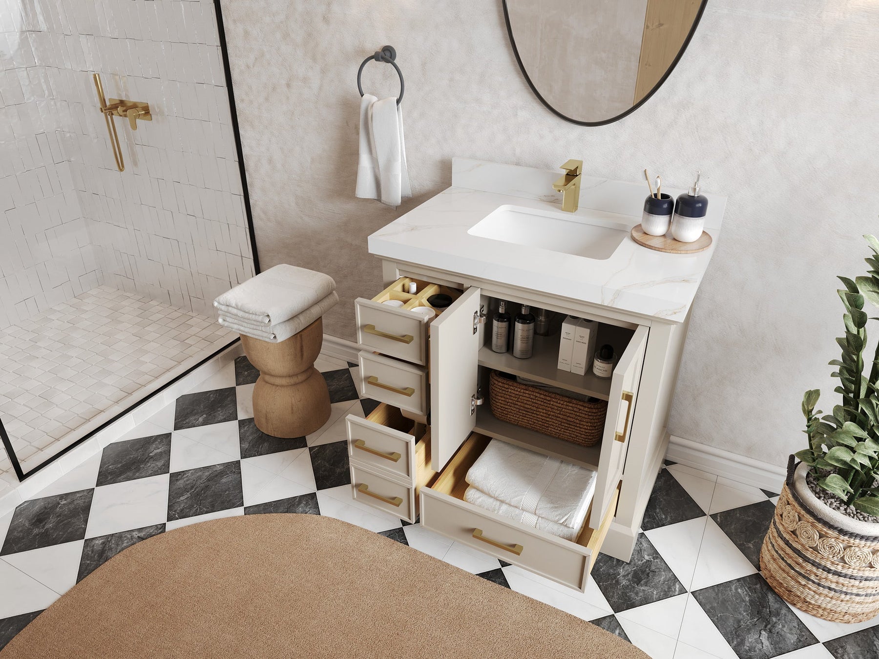 The Charlotte Cabinet comes with spacious cabinet compartments and drawers to store all your bathroom essentials, including towels, toiletries, and more. The soft-close drawers and doors ensure easy and quiet access.