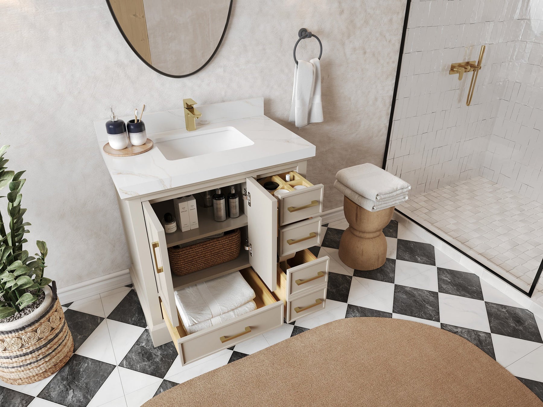 The Charlotte Cabinet comes with spacious cabinet compartments and drawers to store all your bathroom essentials, including towels, toiletries, and more. The soft-close drawers and doors ensure easy and quiet access.