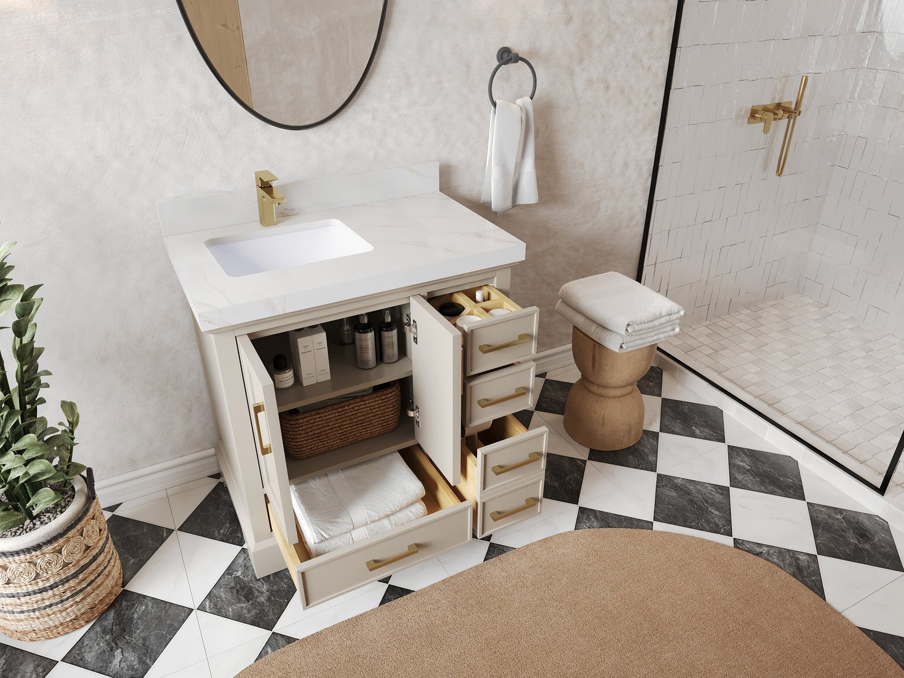 The Charlotte Cabinet comes with spacious cabinet compartments and drawers to store all your bathroom essentials, including towels, toiletries, and more. The soft-close drawers and doors ensure easy and quiet access.