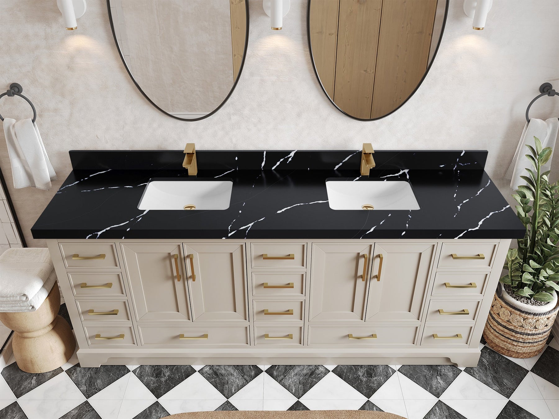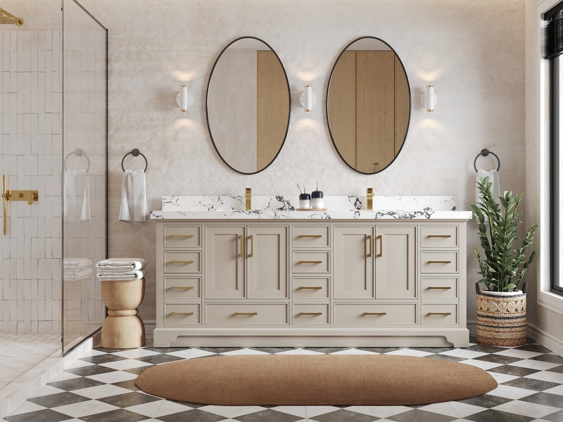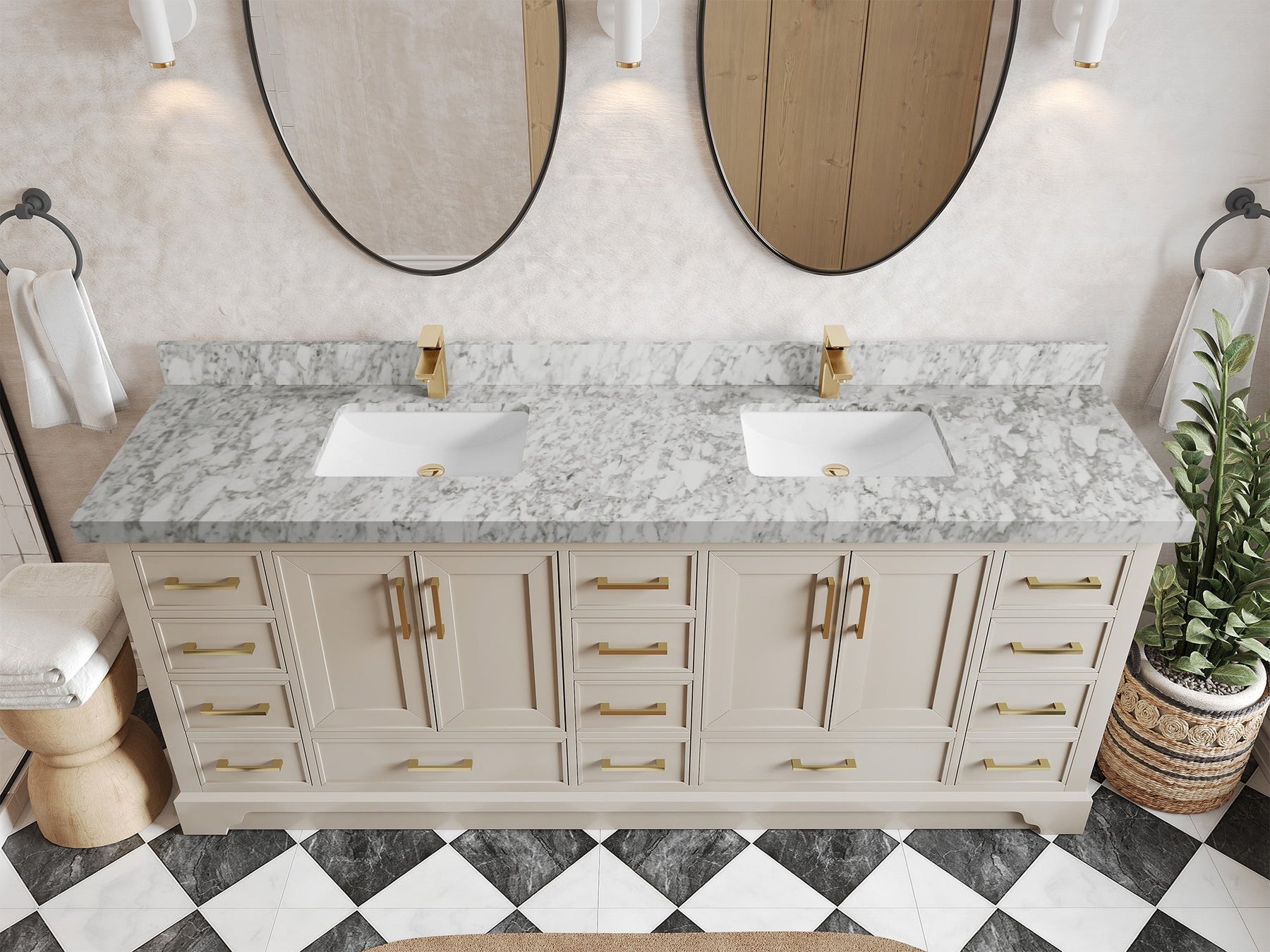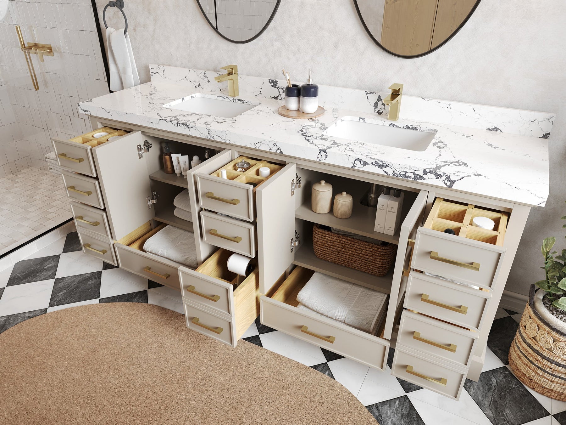 The Charlotte Cabinet comes with spacious cabinet compartments and drawers to store all your bathroom essentials, including towels, toiletries, and more. The soft-close drawers and doors ensure easy and quiet access.