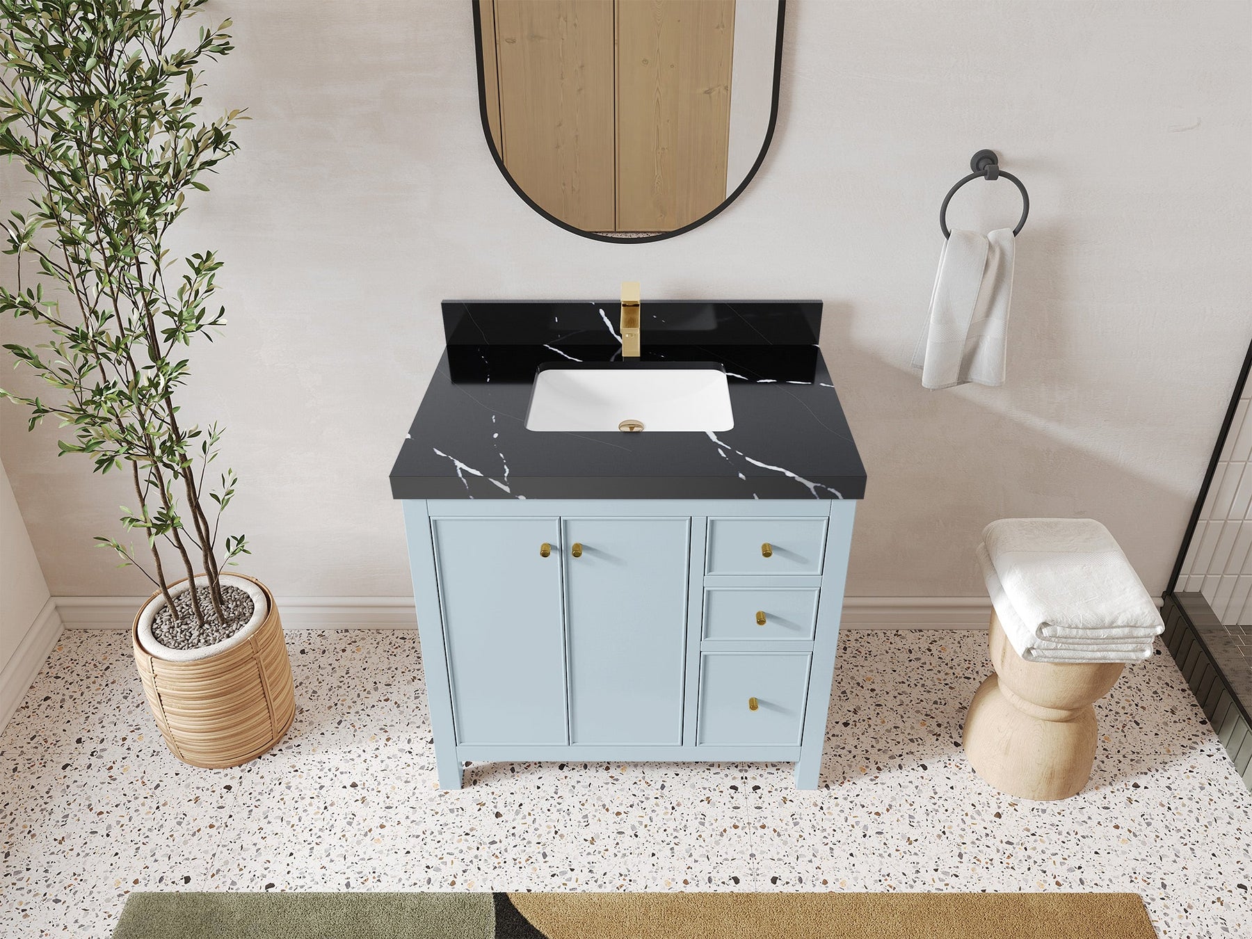 2. Durable Brass Hardware - This vanity is adorned with brass-finish hardware that not only adds a touch of luxury but also ensures long-lasting durability.