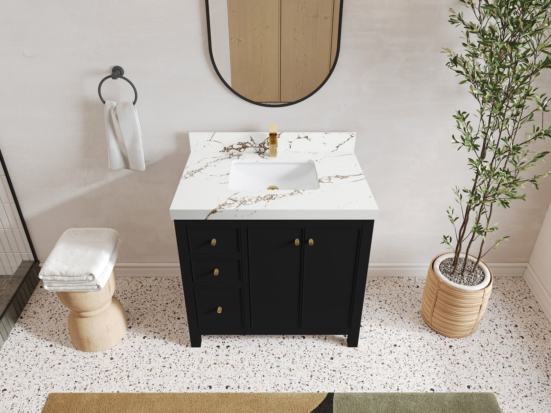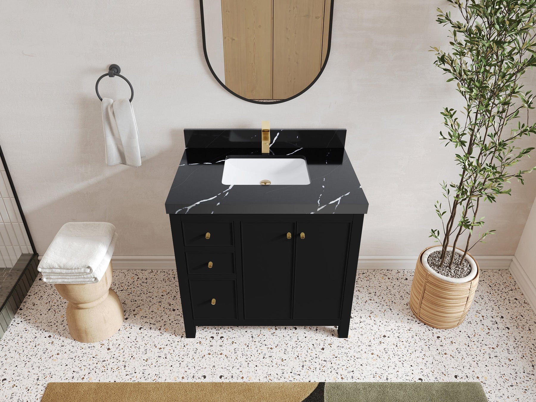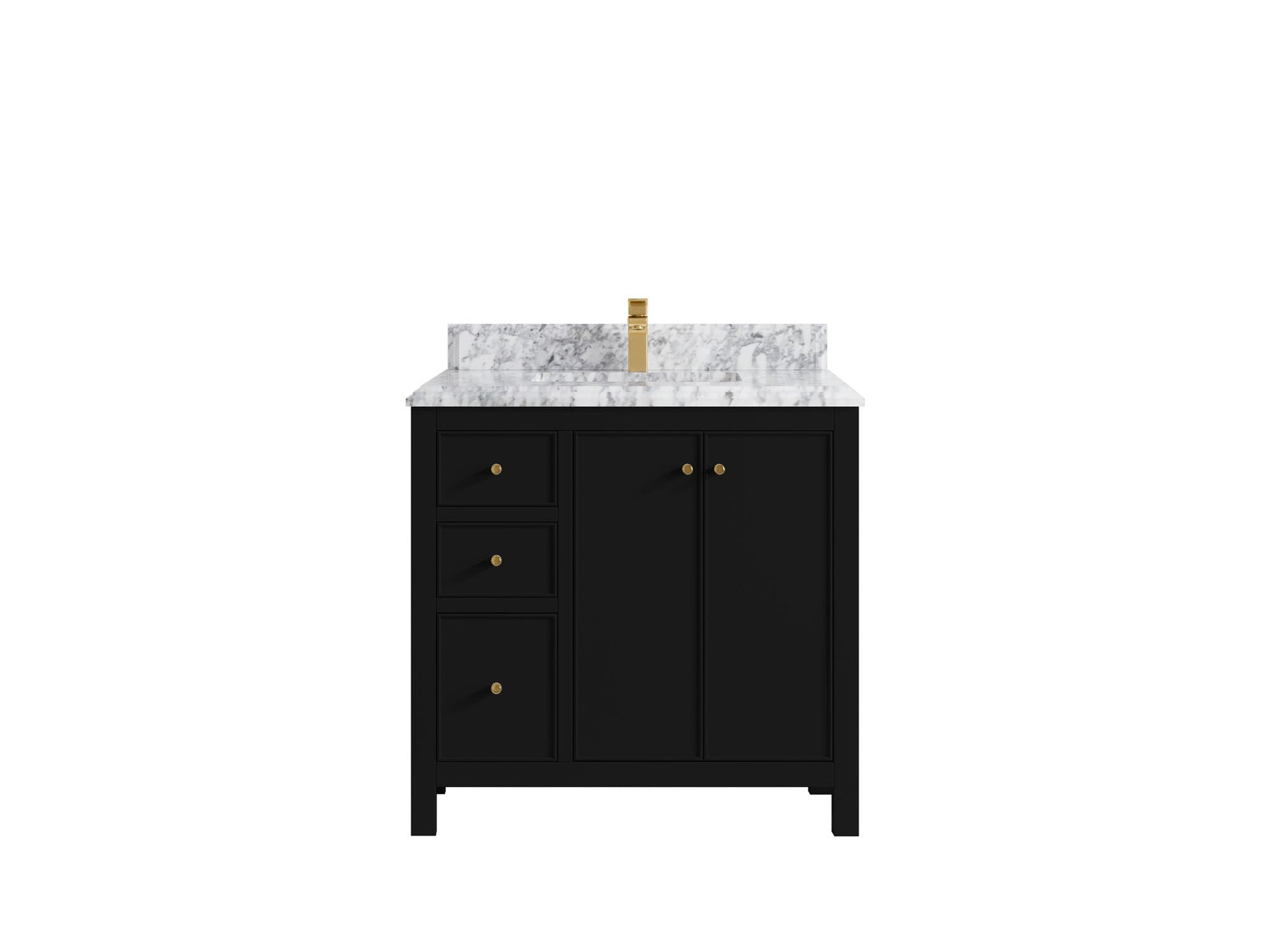 2. Durable Brass Hardware - This vanity is adorned with brass-finish hardware that not only adds a touch of luxury but also ensures long-lasting durability.