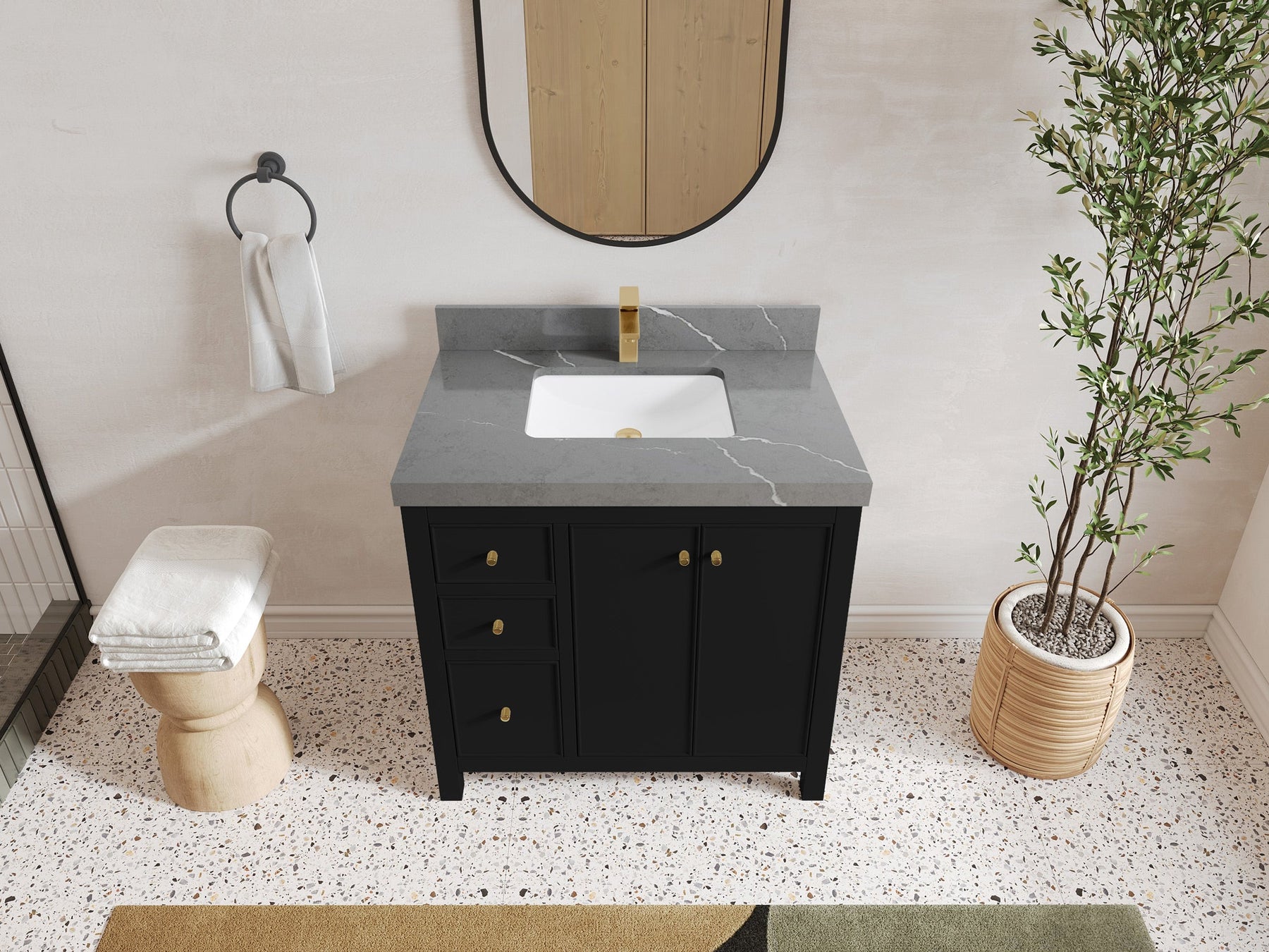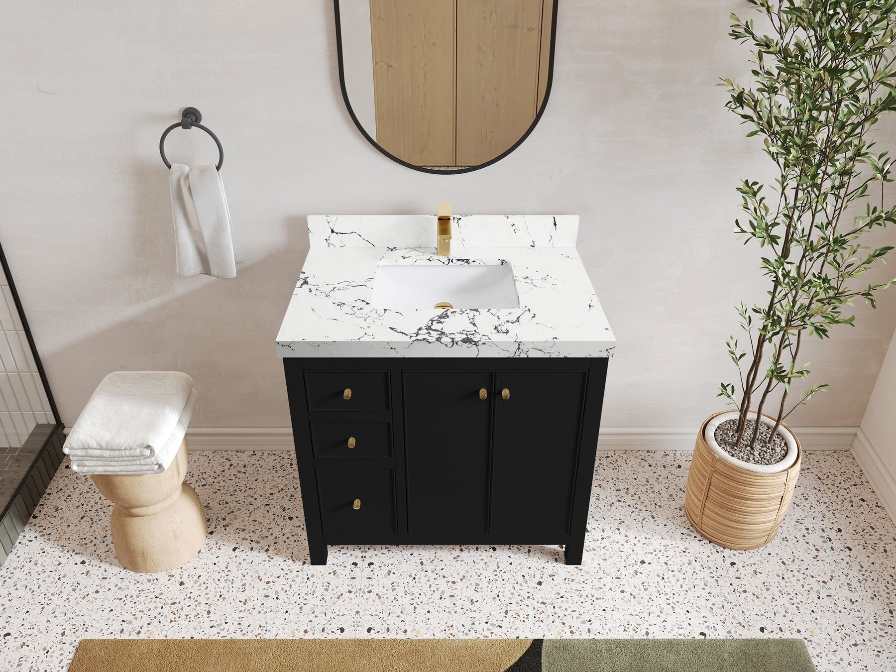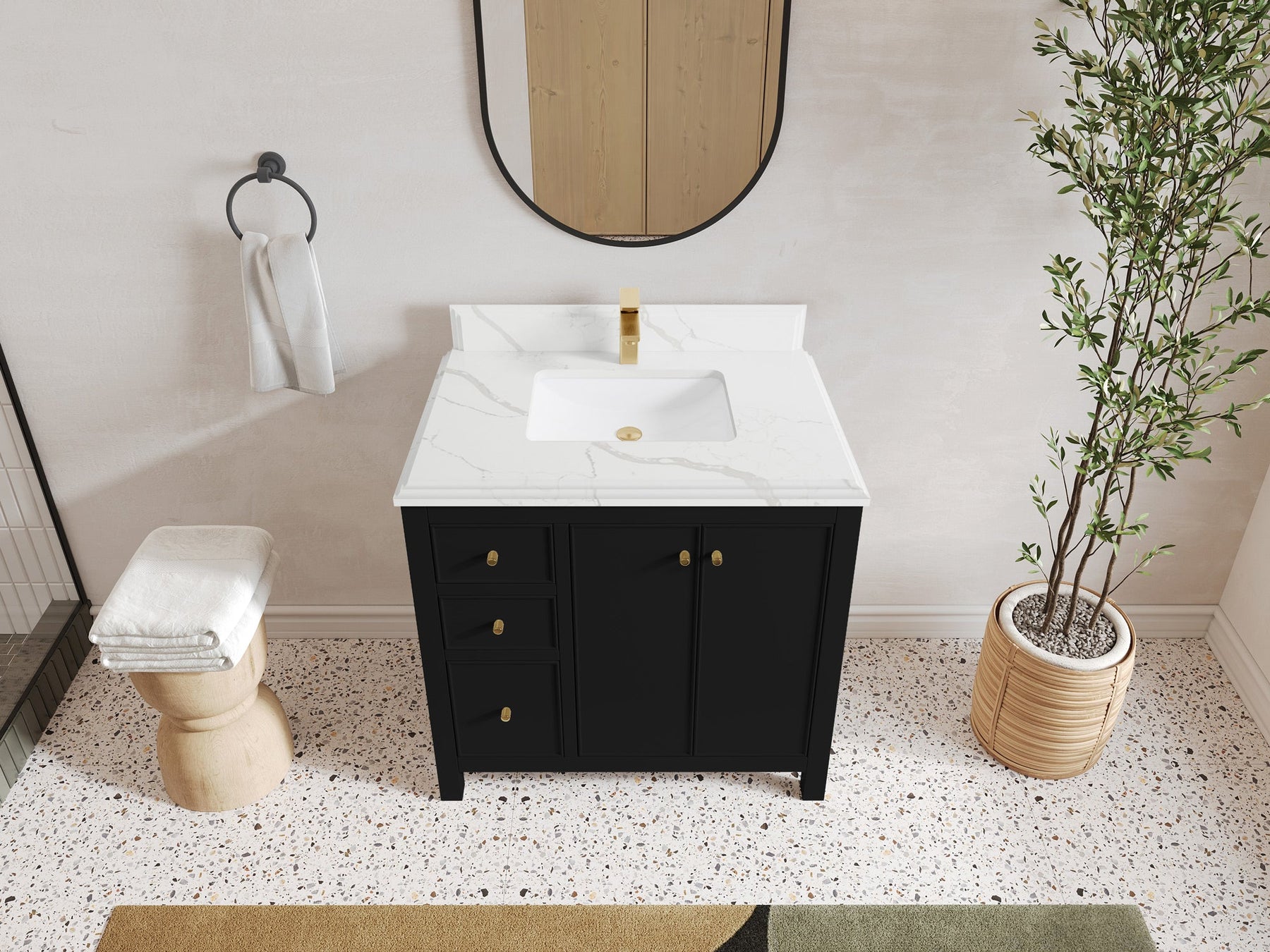 2. Durable Brass Hardware - This vanity is adorned with brass-finish hardware that not only adds a touch of luxury but also ensures long-lasting durability.