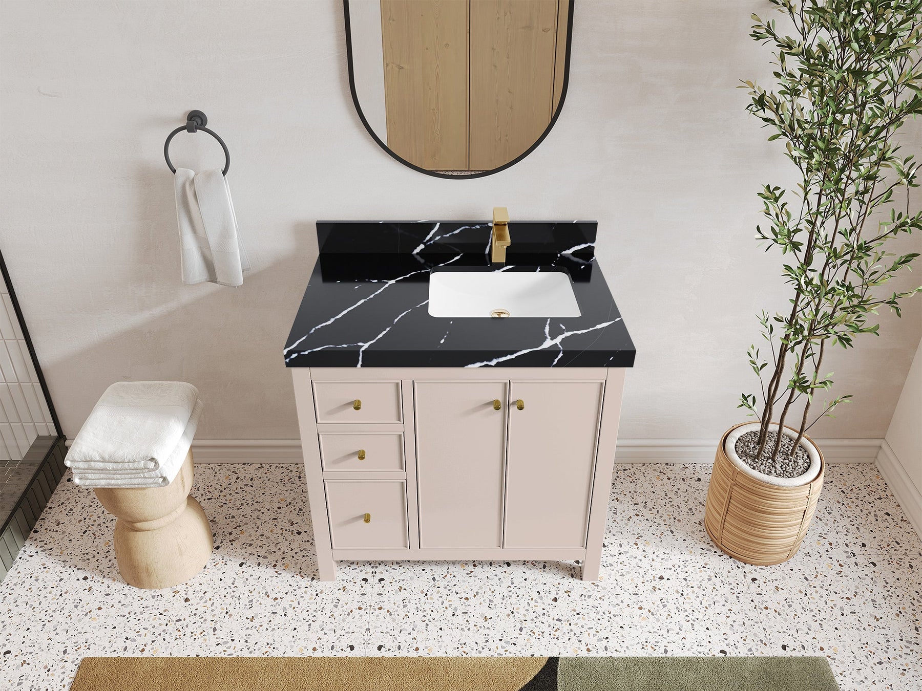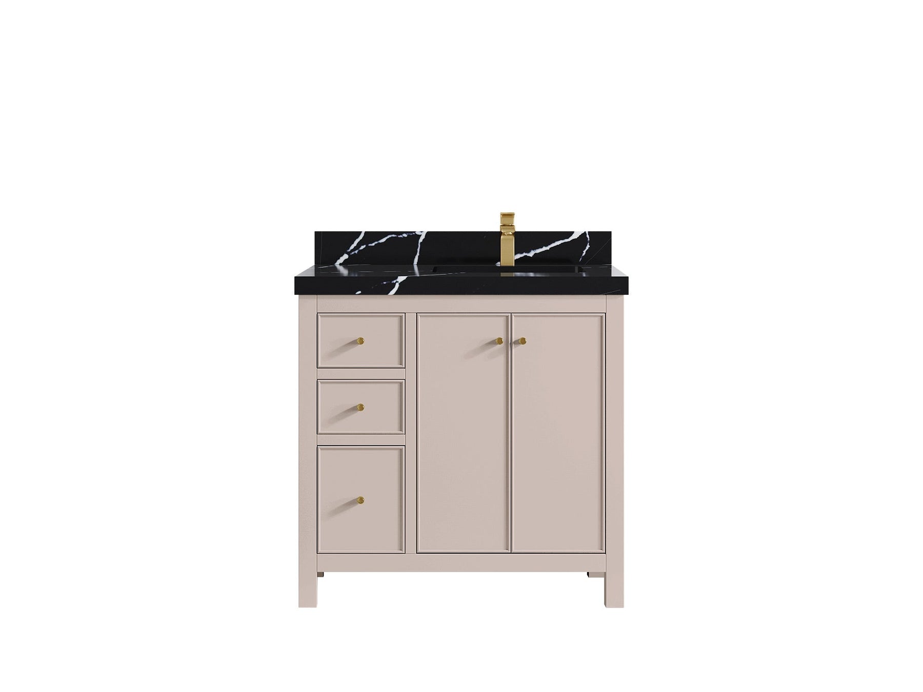 2. Durable Brass Hardware - This vanity is adorned with brass-finish hardware that not only adds a touch of luxury but also ensures long-lasting durability.