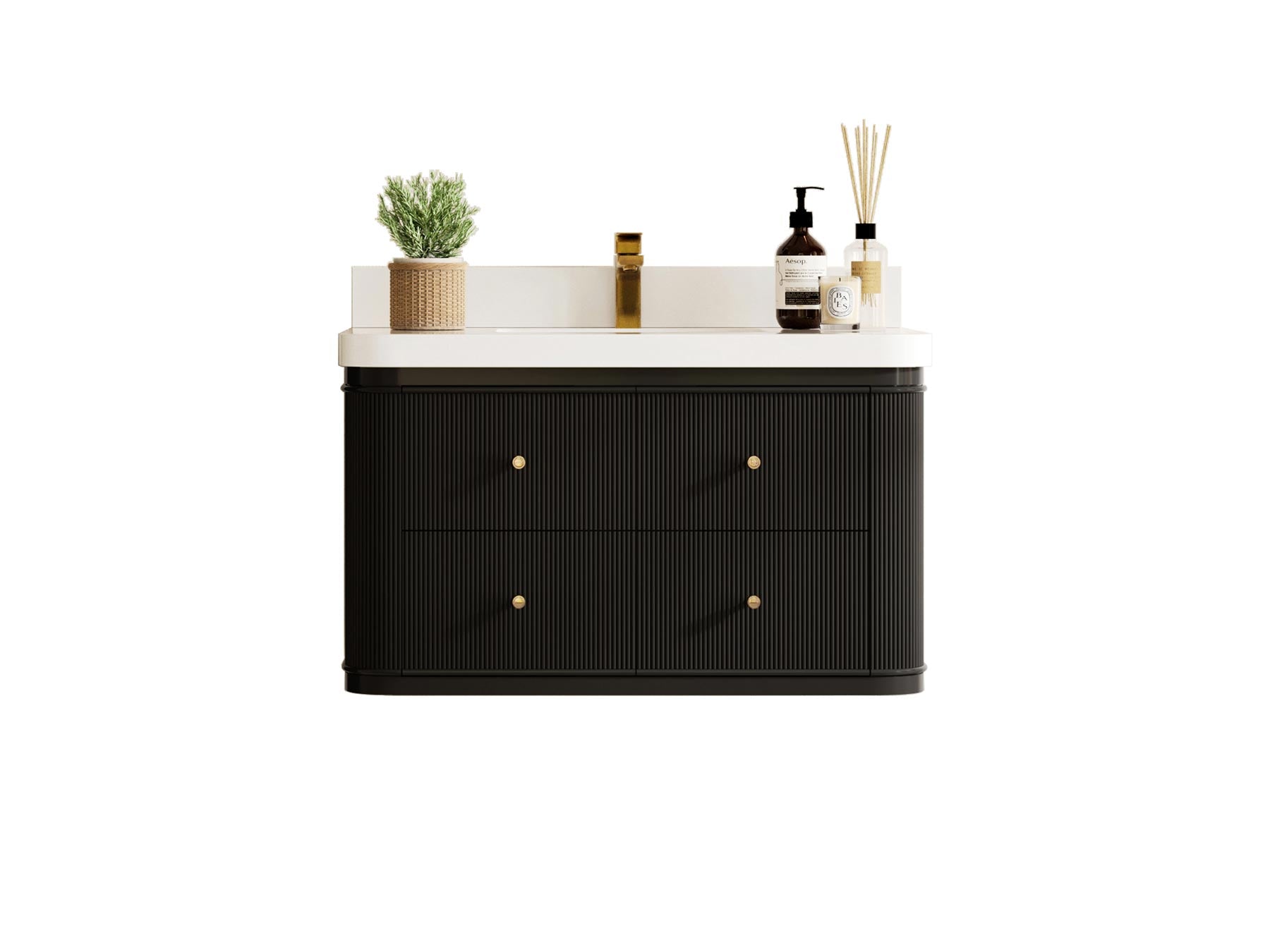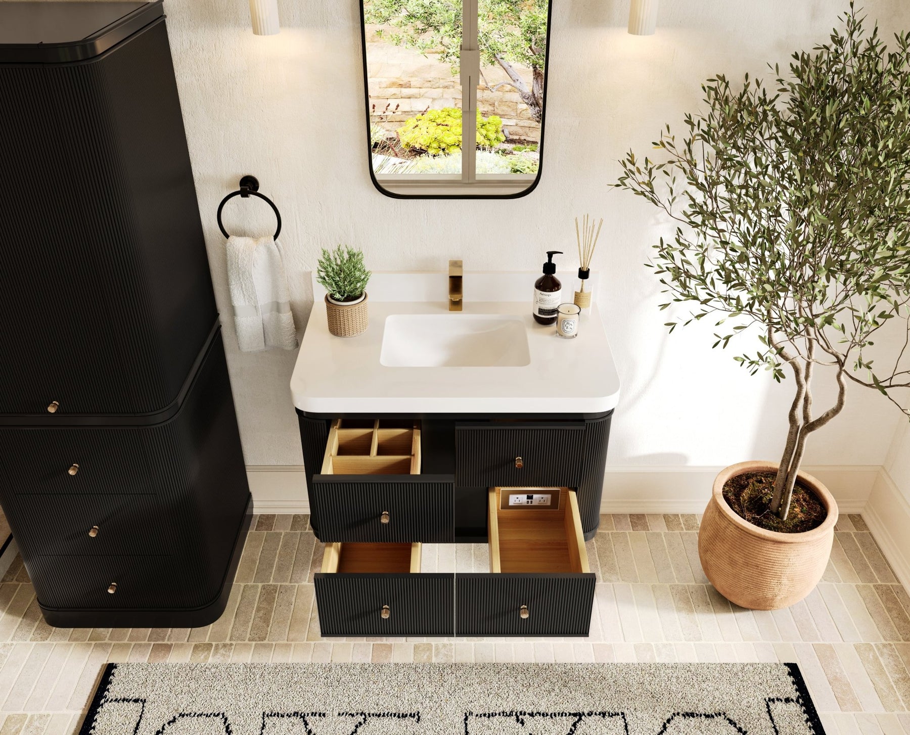 The Hampton Collection embodies understated elegance through its fluted detailing, soft rounded corners, and floating form. This wall-mounted vanity creates an elevated sense of space while offering exceptional storage and organization. Every drawer opens to reveal a thoughtfully designed interior with natural wood compartments, built-in power outlets, and soft-close hardware for a seamless experience.