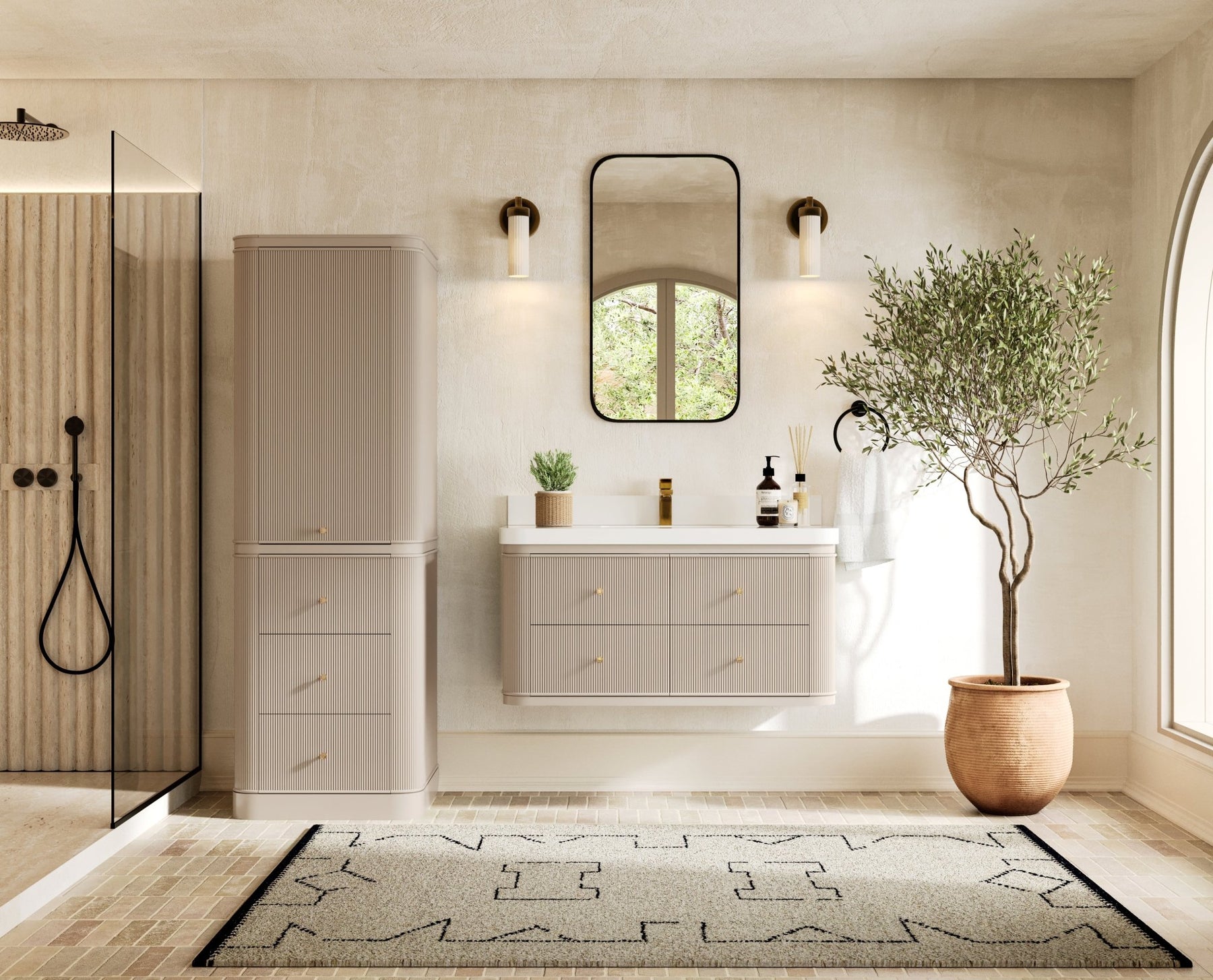 The Hampton Collection embodies understated elegance through its fluted detailing, soft rounded corners, and floating form. This wall-mounted vanity creates an elevated sense of space while offering exceptional storage and organization. Every drawer opens to reveal a thoughtfully designed interior with natural wood compartments, built-in power outlets, and soft-close hardware for a seamless experience.