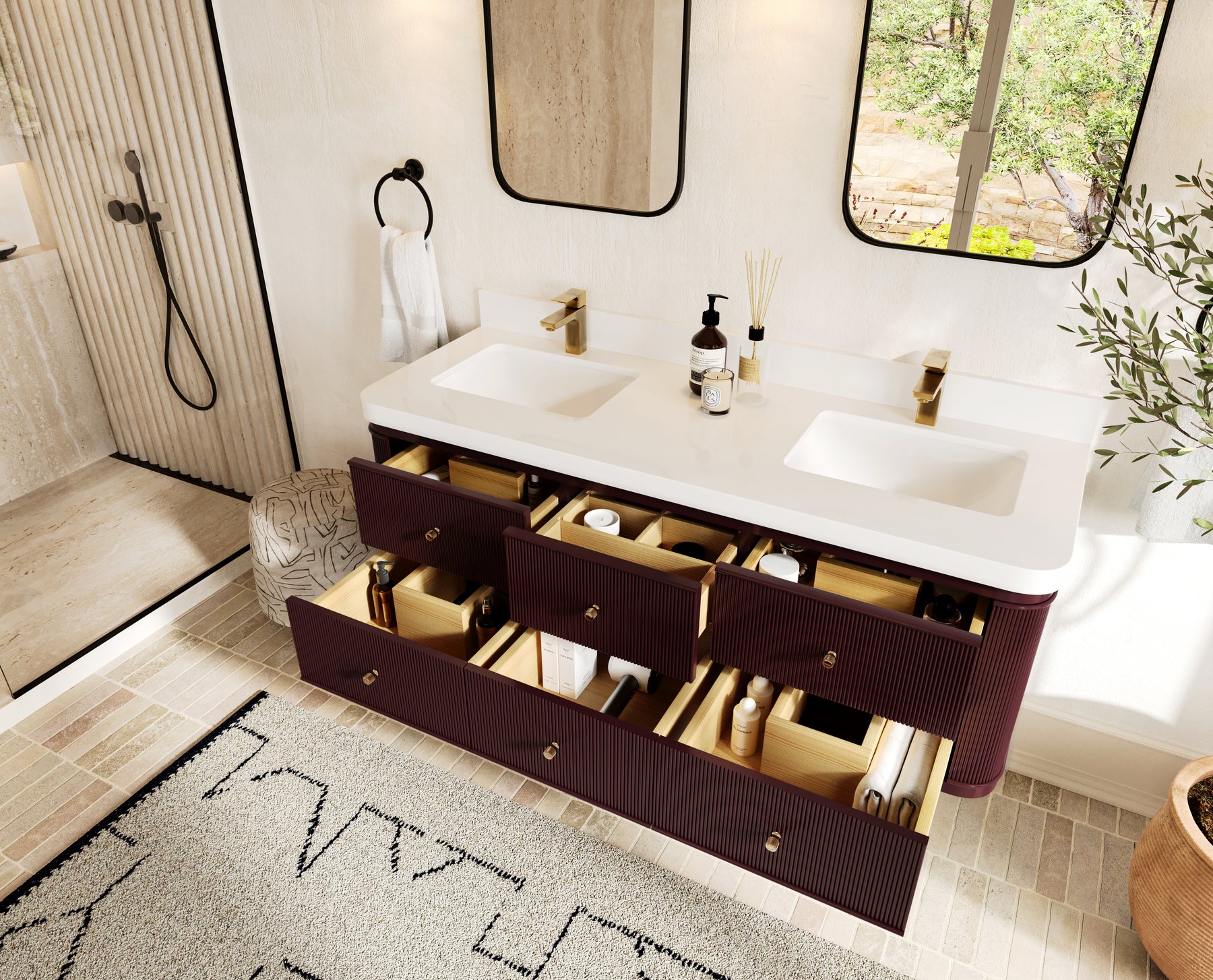 The Hampton Collection embodies understated elegance through its fluted detailing, soft rounded corners, and floating form. This wall-mounted vanity creates an elevated sense of space while offering exceptional storage and organization. Every drawer opens to reveal a thoughtfully designed interior with natural wood compartments, built-in power outlets, and soft-close hardware for a seamless experience.