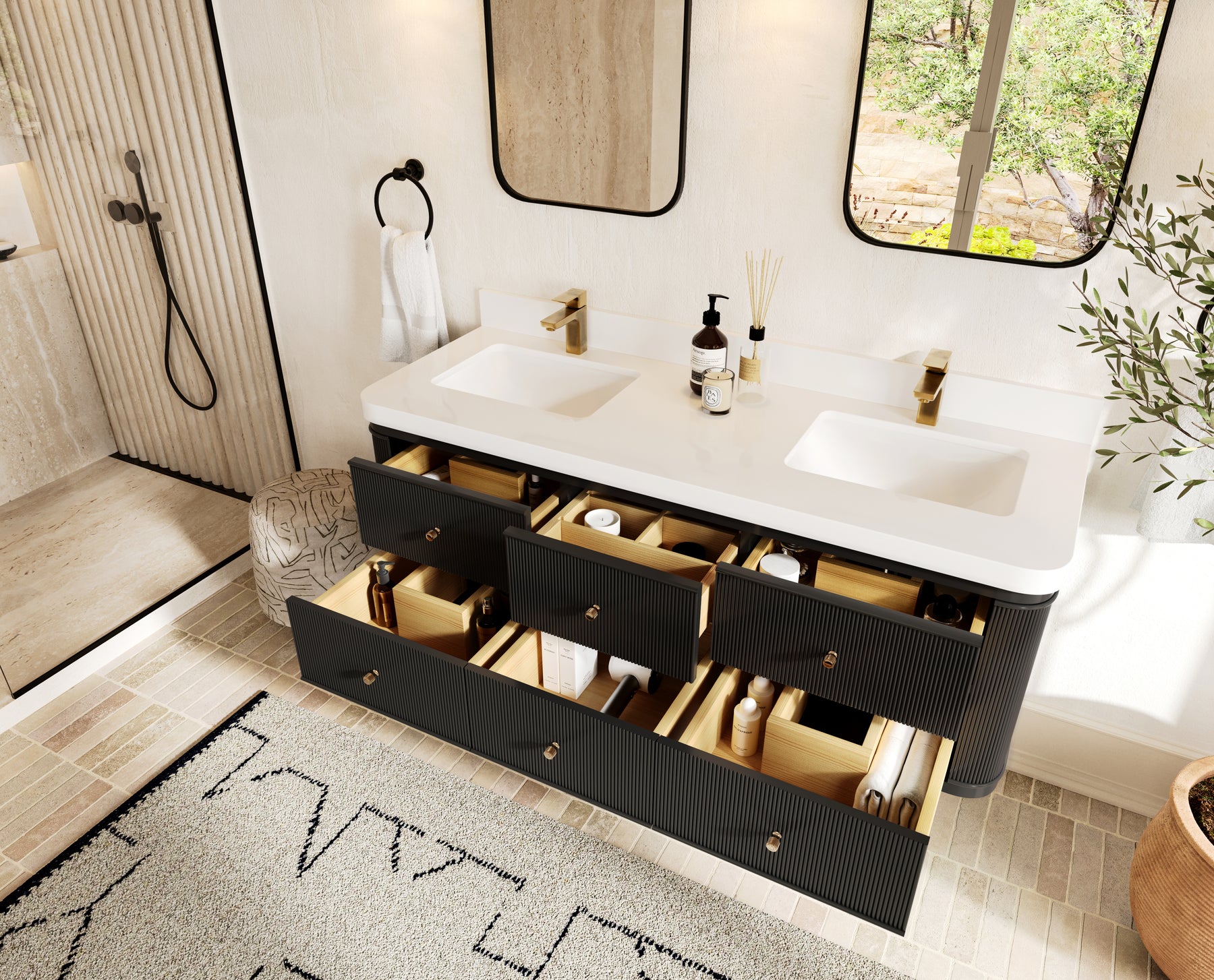 The Hampton Collection embodies understated elegance through its fluted detailing, soft rounded corners, and floating form. This wall-mounted vanity creates an elevated sense of space while offering exceptional storage and organization. Every drawer opens to reveal a thoughtfully designed interior with natural wood compartments, built-in power outlets, and soft-close hardware for a seamless experience.