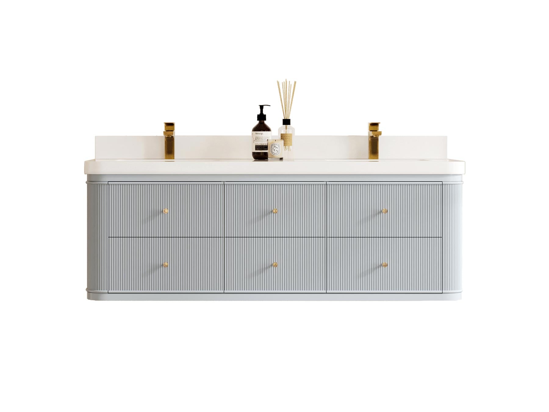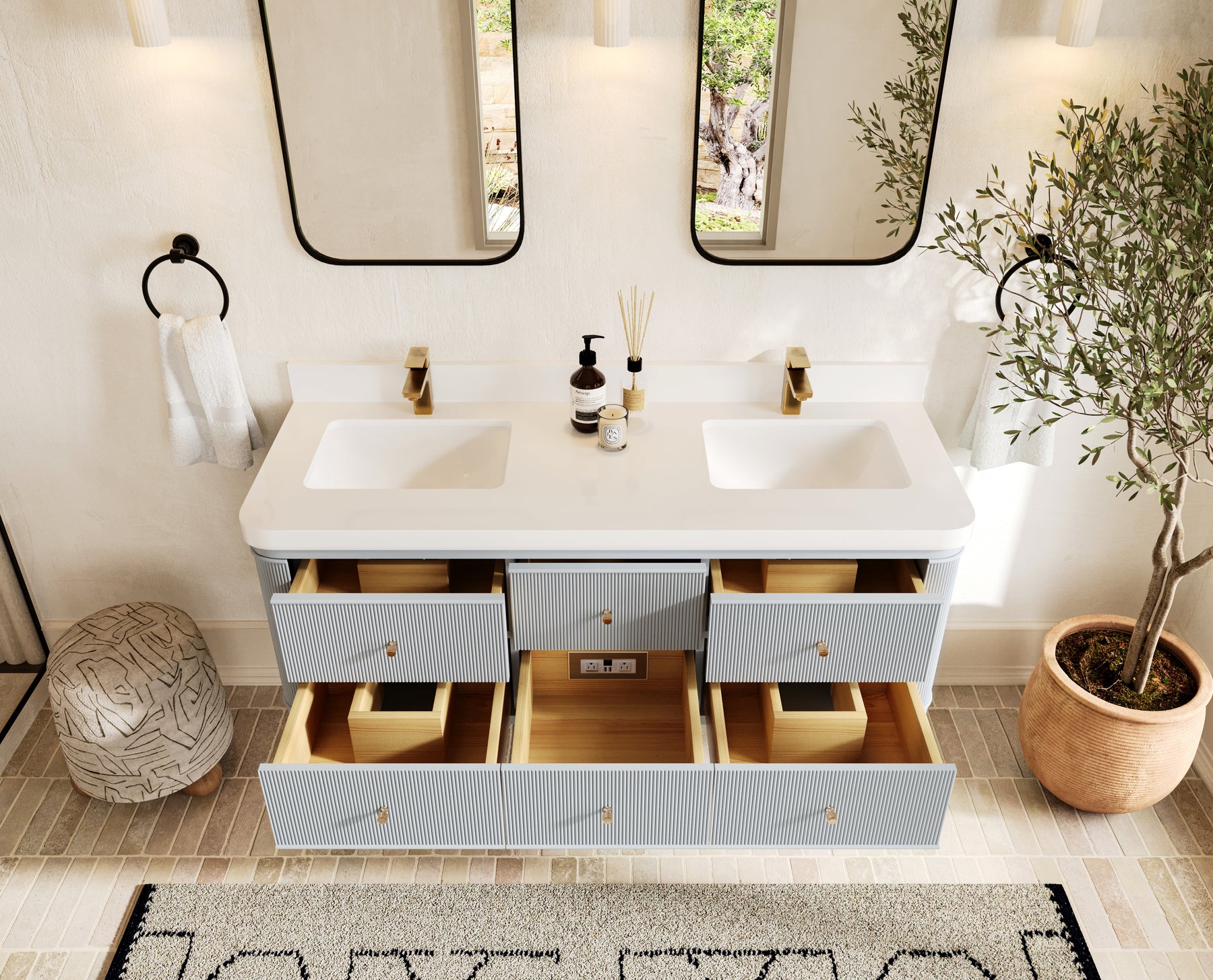 The Hampton Collection embodies understated elegance through its fluted detailing, soft rounded corners, and floating form. This wall-mounted vanity creates an elevated sense of space while offering exceptional storage and organization. Every drawer opens to reveal a thoughtfully designed interior with natural wood compartments, built-in power outlets, and soft-close hardware for a seamless experience.