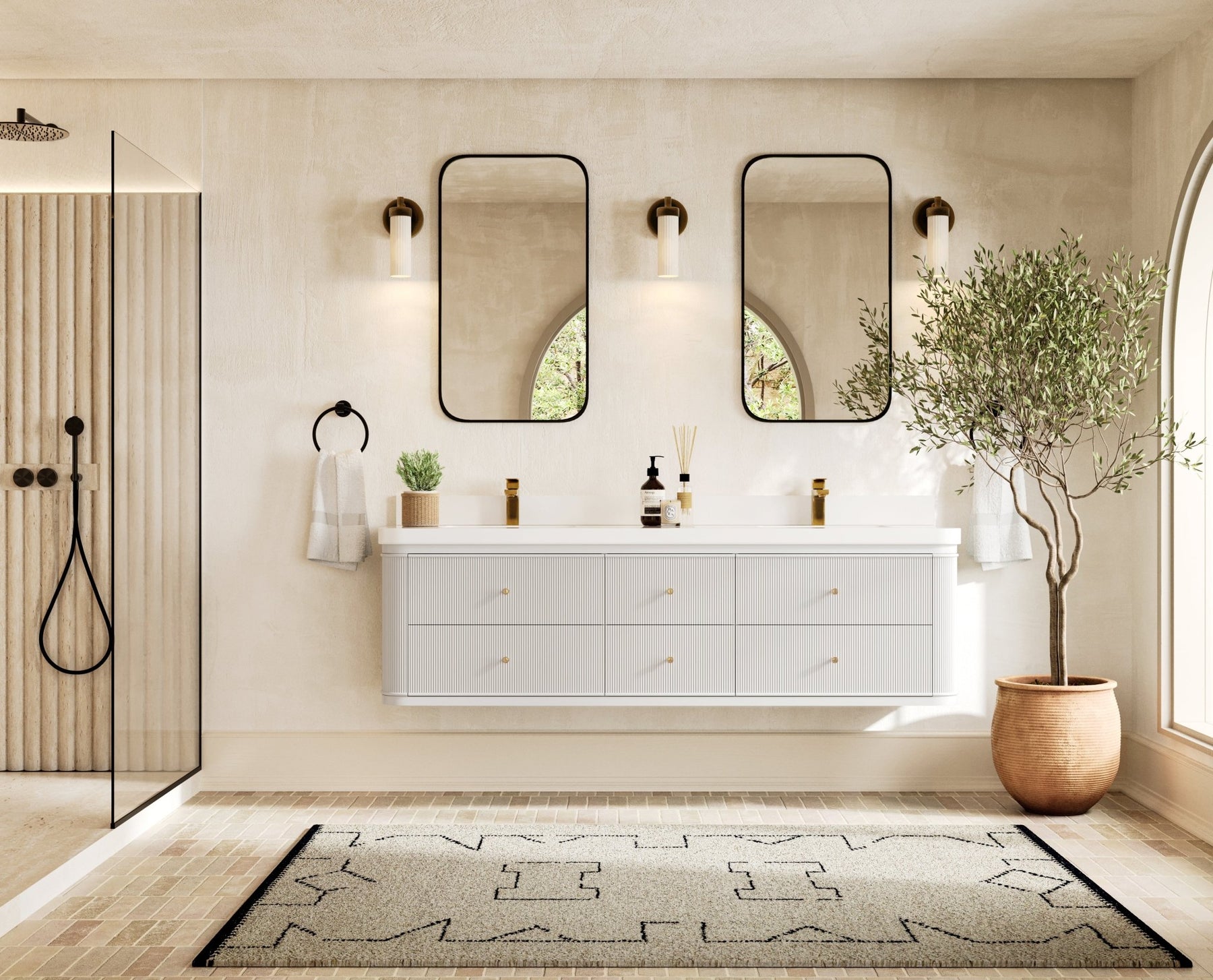 The Hampton Collection embodies understated elegance through its fluted detailing, soft rounded corners, and floating form. This wall-mounted vanity creates an elevated sense of space while offering exceptional storage and organization. Every drawer opens to reveal a thoughtfully designed interior with natural wood compartments, built-in power outlets, and soft-close hardware for a seamless experience.