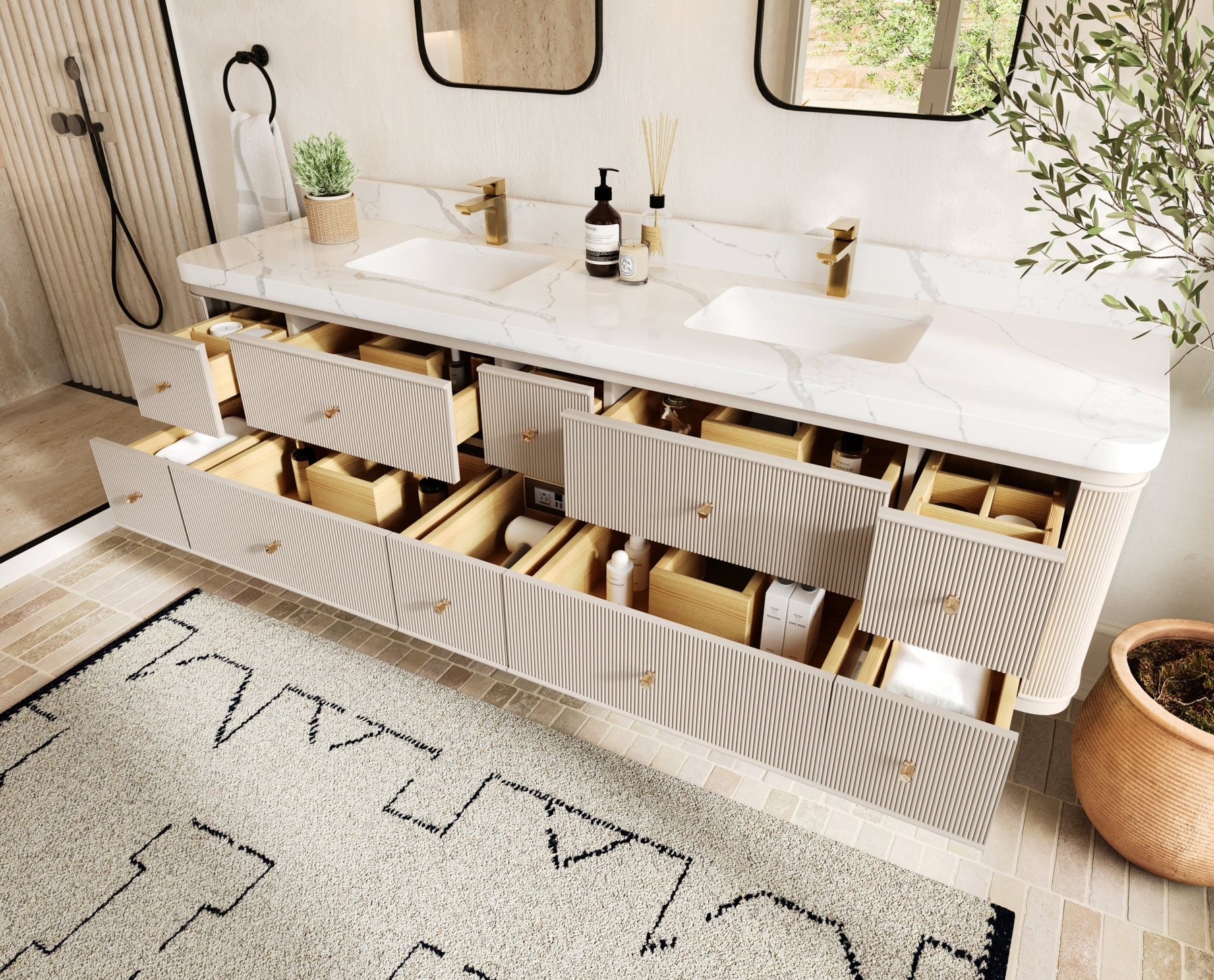 Vanity Countertops options: For Calacatta Laza Quartz, Calacatta Gold Quartz, Empira White Quartz, Pure White Quartz, Palissandro Quartz, Calacatta Nuvo Quartz, Carrara Marble, Carrara Quartz, Calacatta Sienna Quartz, Terrazzo Arctic Breeze, Terrazzo Golden Dusk we have Rounded - Edge option.