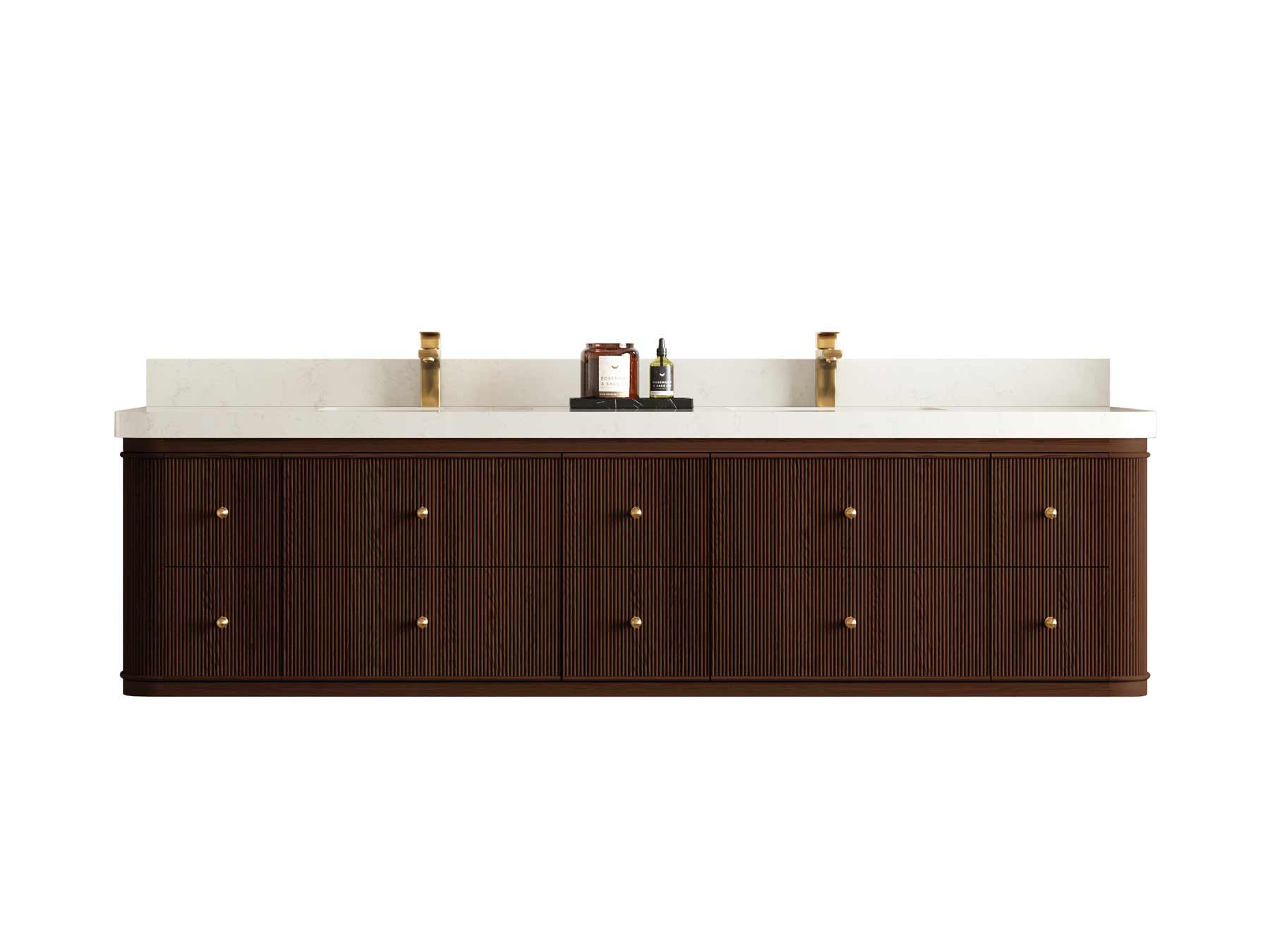 Elevate your bathroom with the Hampton Floating Teak Collection, where sleek contemporary design meets the natural warmth of fine teak wood. Featuring reeded drawer fronts, clean lines, and a luxurious white quartz countertop, this double vanity blends form and function effortlessly. The floating design creates a spacious, airy aesthetic perfect for modern interiors while maximizing storage with an elegant, minimalist appeal.