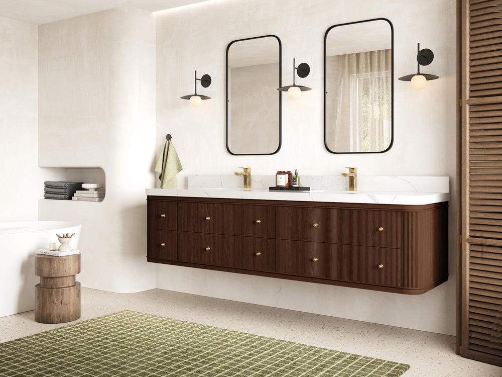 Elevate your bathroom with the Hampton Floating Teak Collection, where sleek contemporary design meets the natural warmth of fine teak wood. Featuring reeded drawer fronts, clean lines, and a luxurious white quartz countertop, this double vanity blends form and function effortlessly. The floating design creates a spacious, airy aesthetic perfect for modern interiors while maximizing storage with an elegant, minimalist appeal.