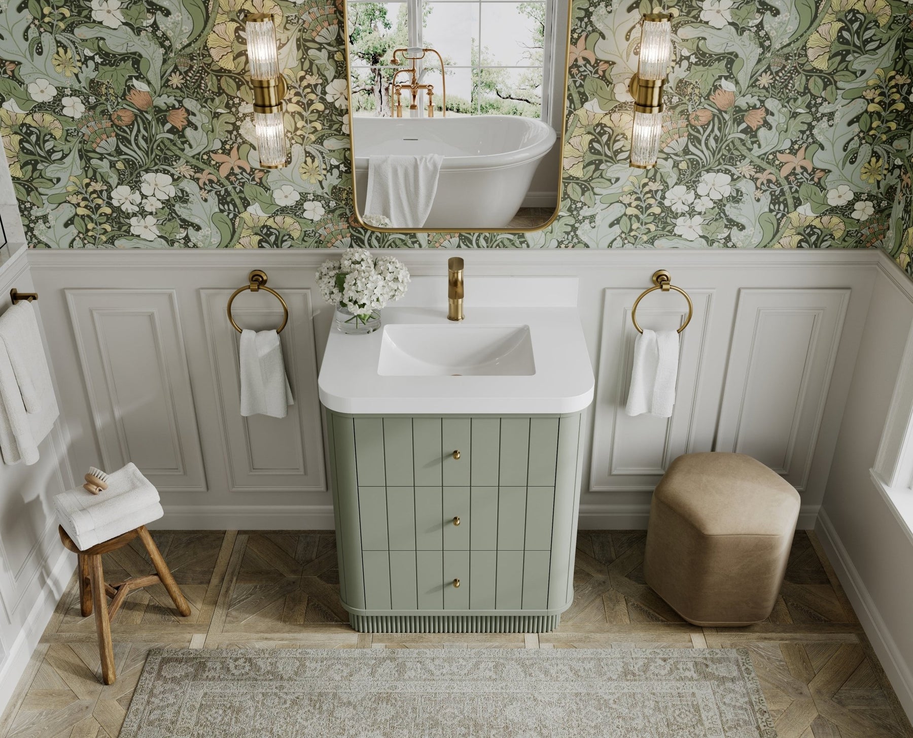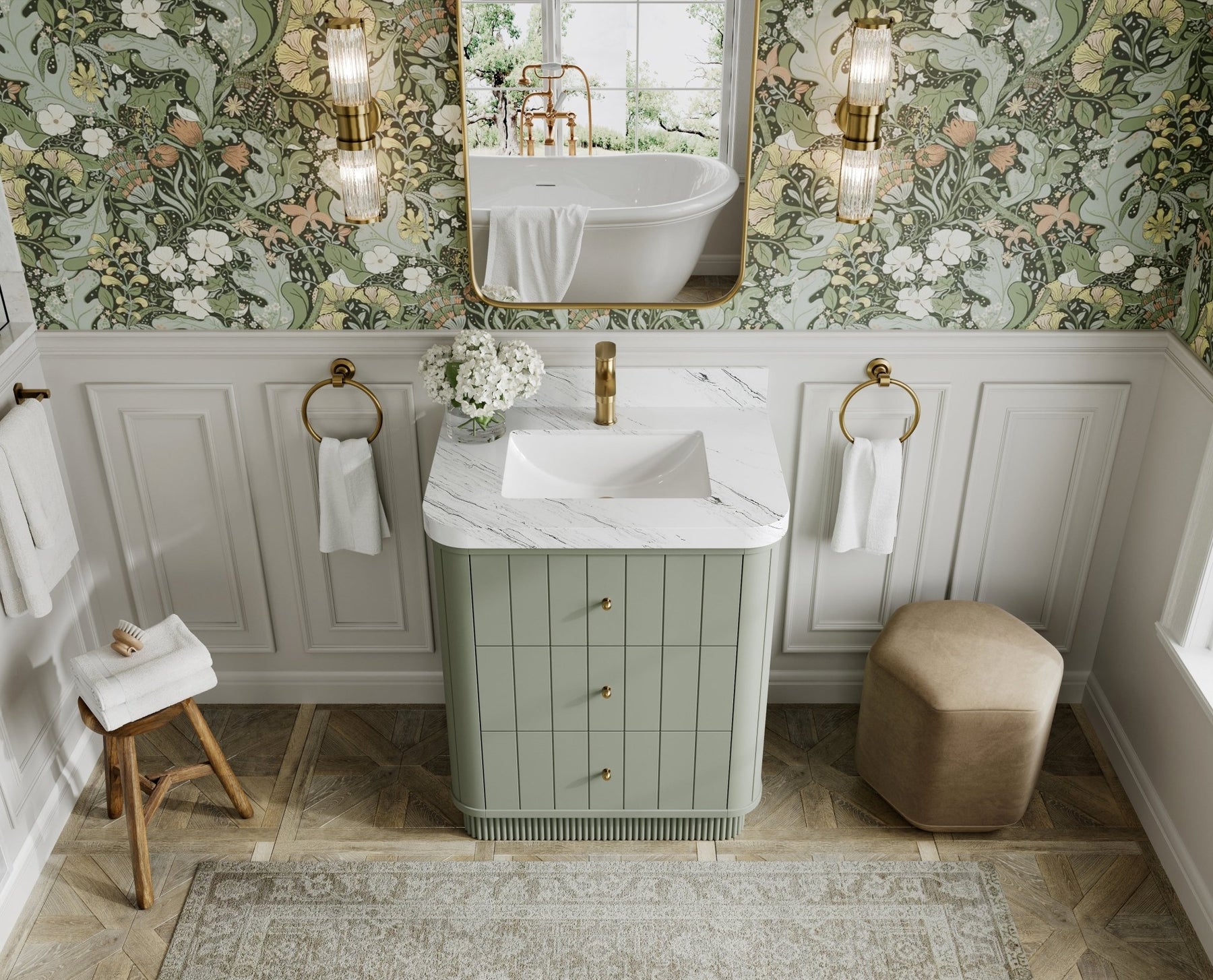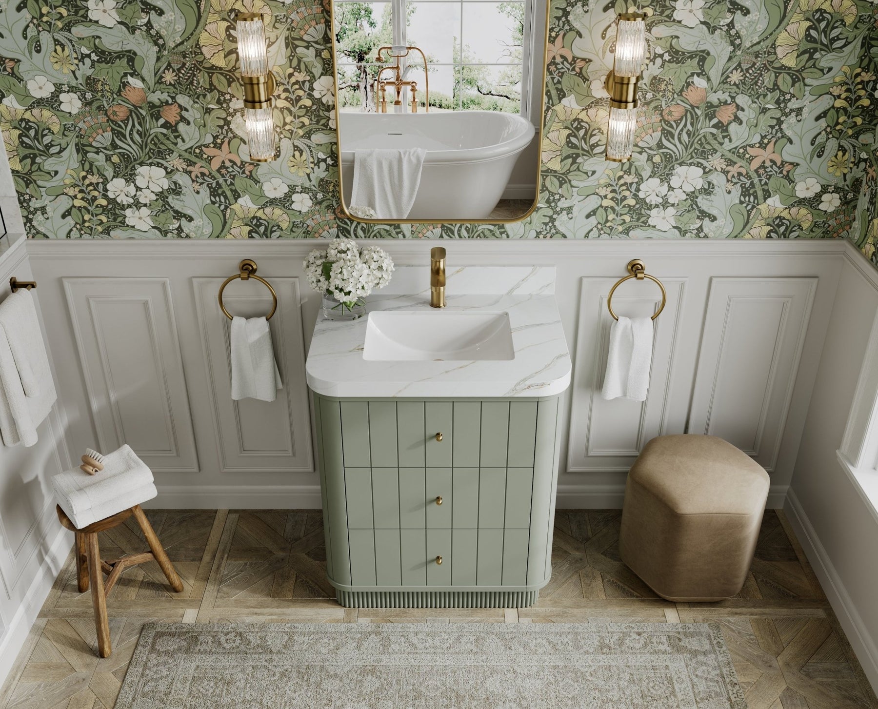 Premium countertop options – choose from Quartz or Marble, both featuring eased, rounded edges that echo the vanity’s curves.