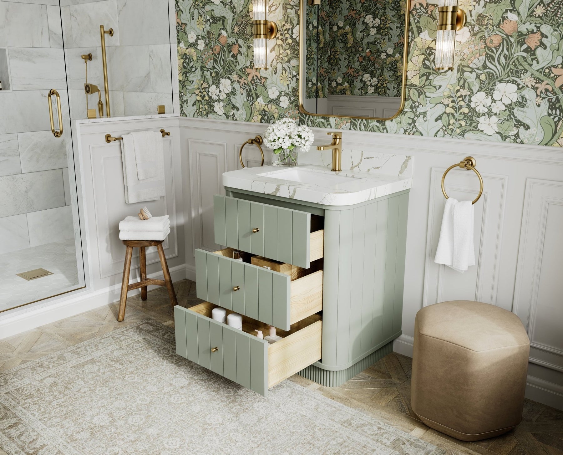 Meet Houston, the modern showpiece of the Houston Collection, crafted to bring warmth, texture, and refinement to any bathroom. A sculpted, softly rounded silhouette flows from the curved ends to the smooth, radiused countertop corners, while a fluted front meets a reeded kick plate for subtle texture and shadow play. The result is a clean, contemporary vanity that feels tailored and timeless — designed for bathrooms that want the look of luxury without harsh lines.