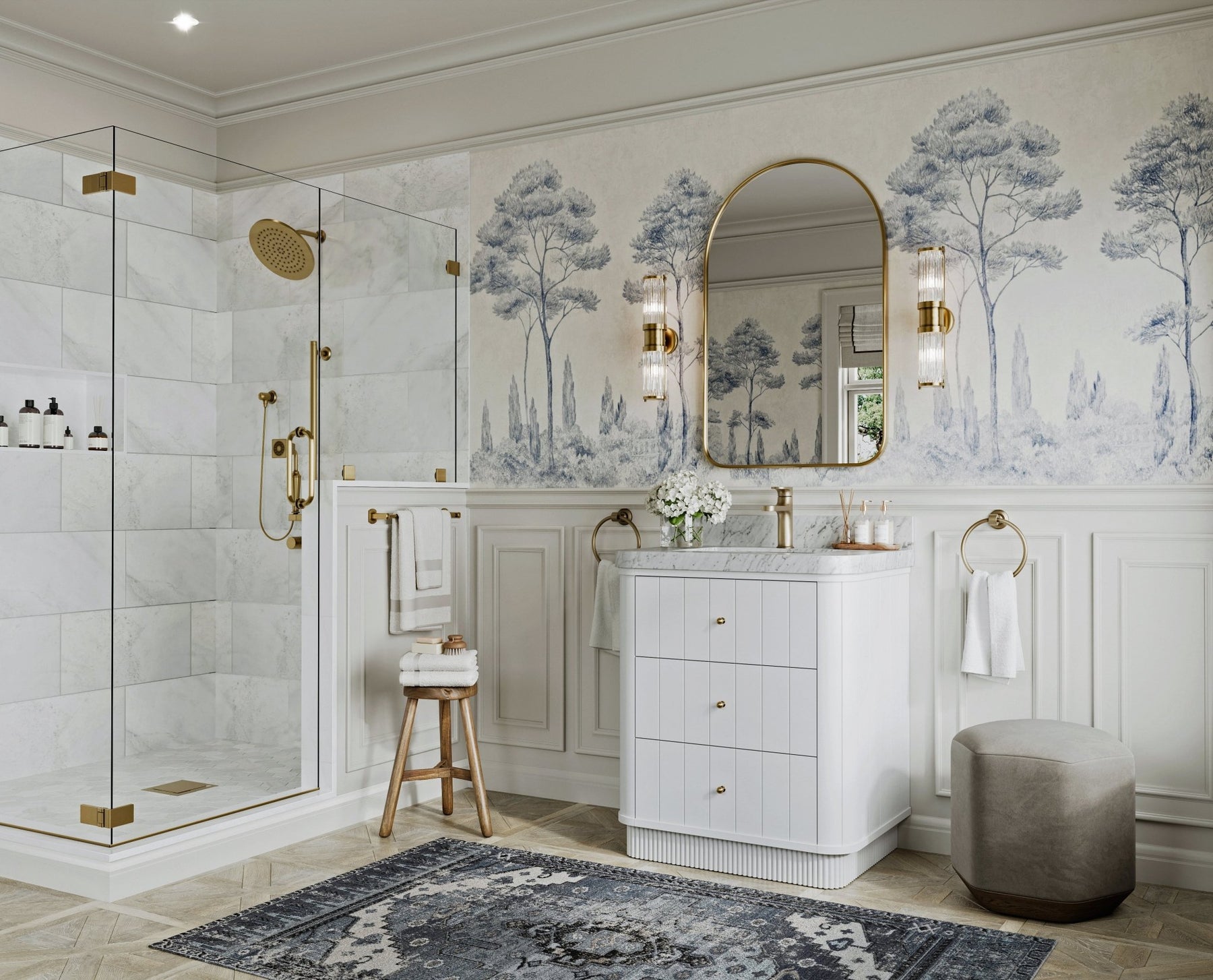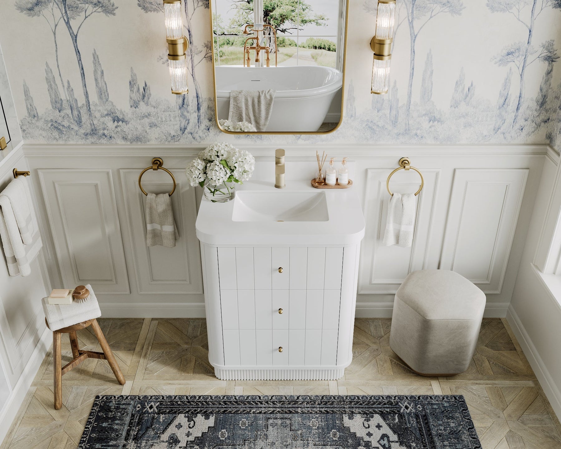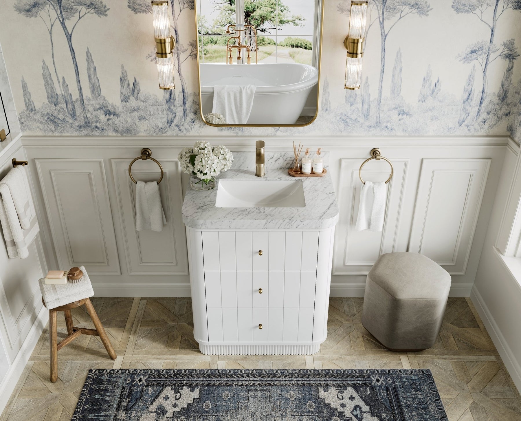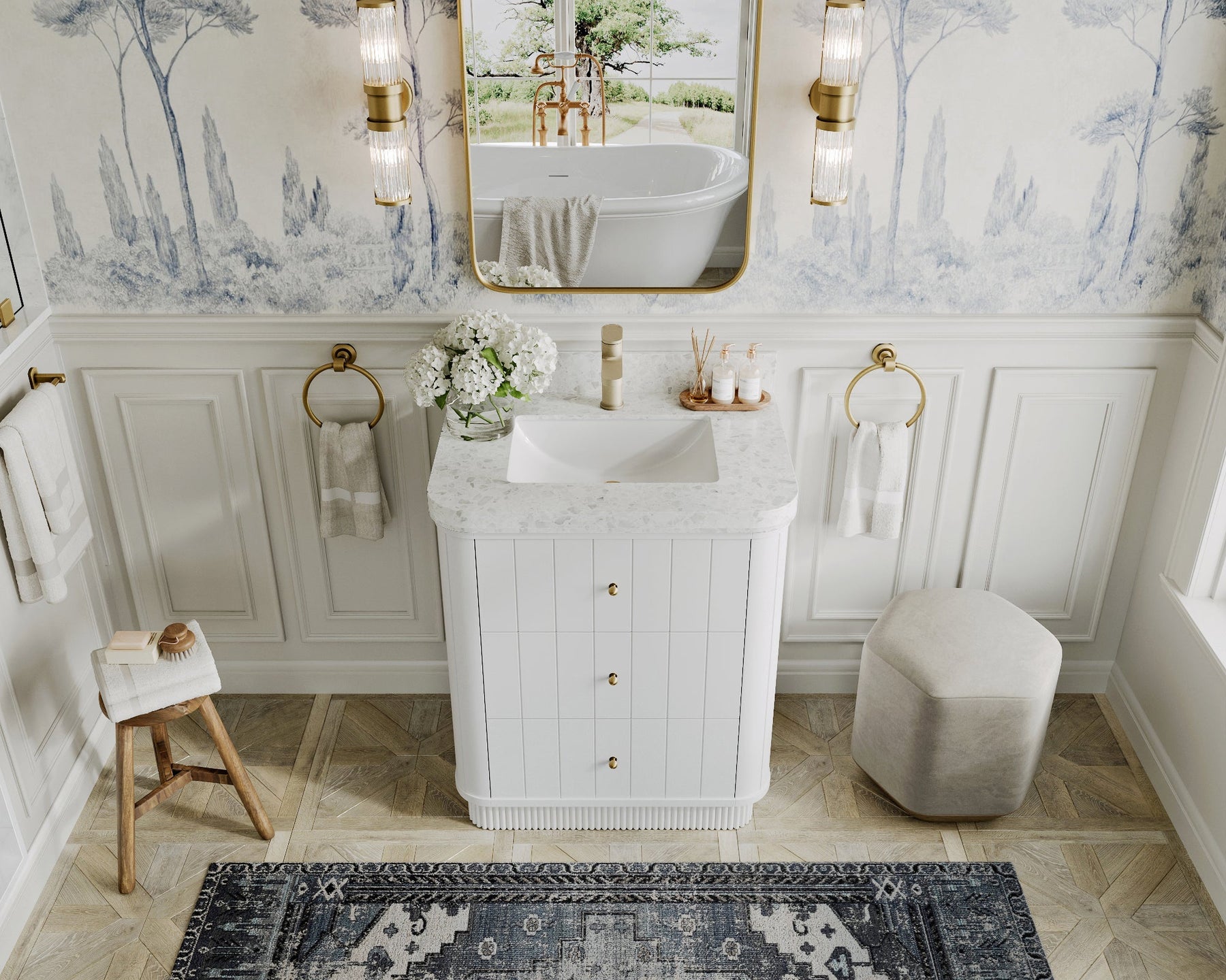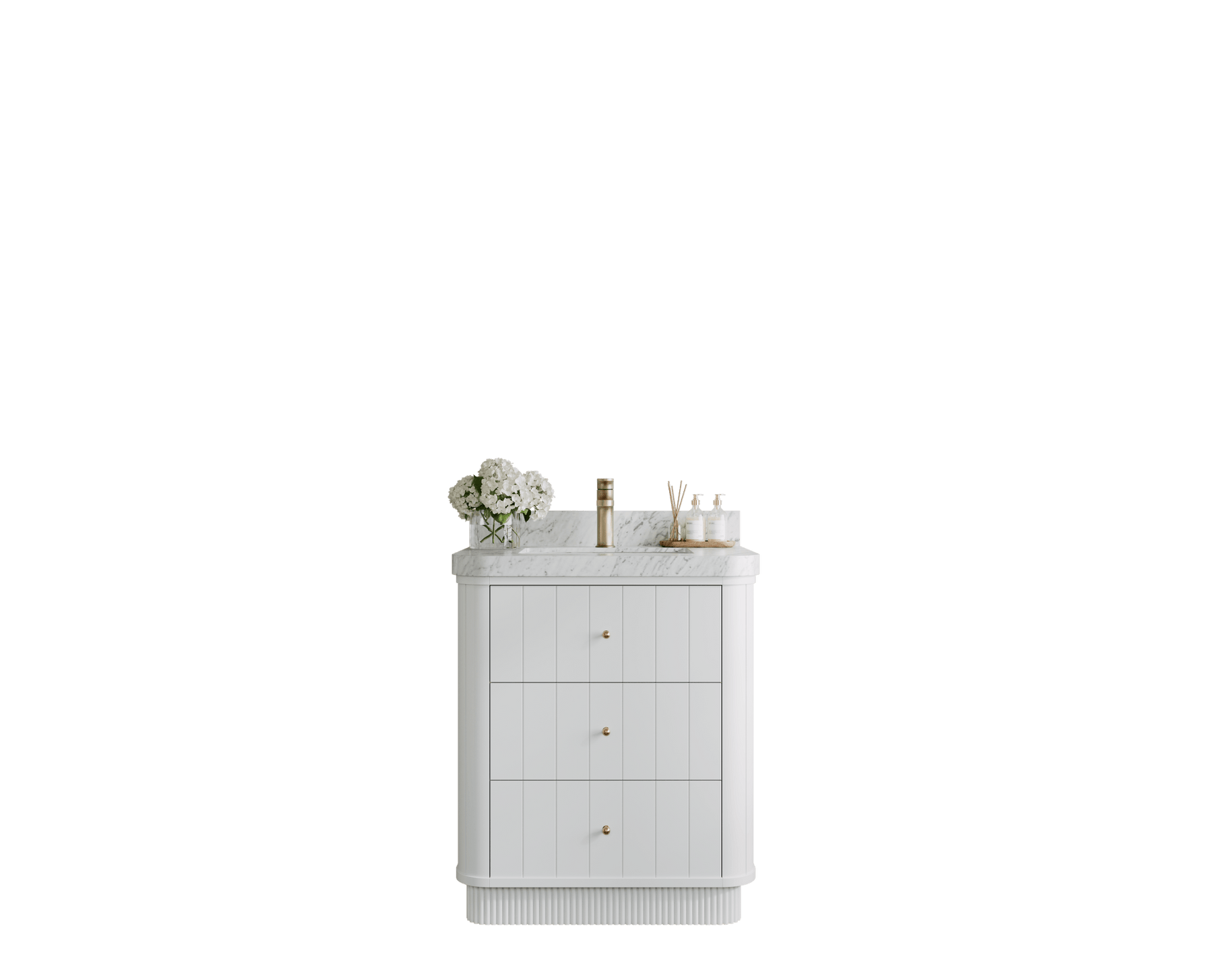 Vanity Countertops options: For Calacatta Laza Quartz, Calacatta Gold Quartz, Empira White Quartz, Pure White Quartz, Palissandro Quartz, Calacatta Nuvo Quartz, Carrara Marble, Carrara Quartz, Calacatta Sienna Quartz, Terrazzo Arctic Breeze, Terrazzo Golden Dusk we have Rounded - Edge option.