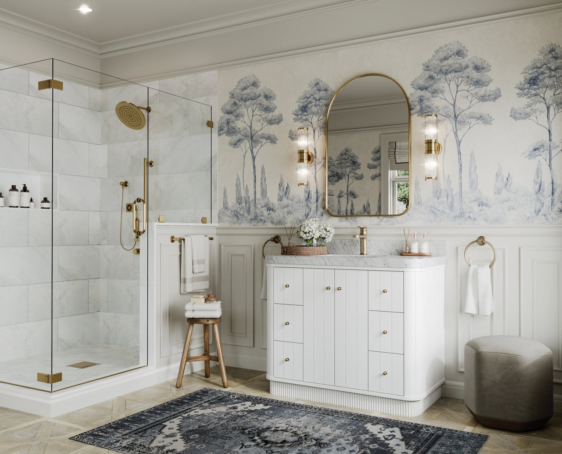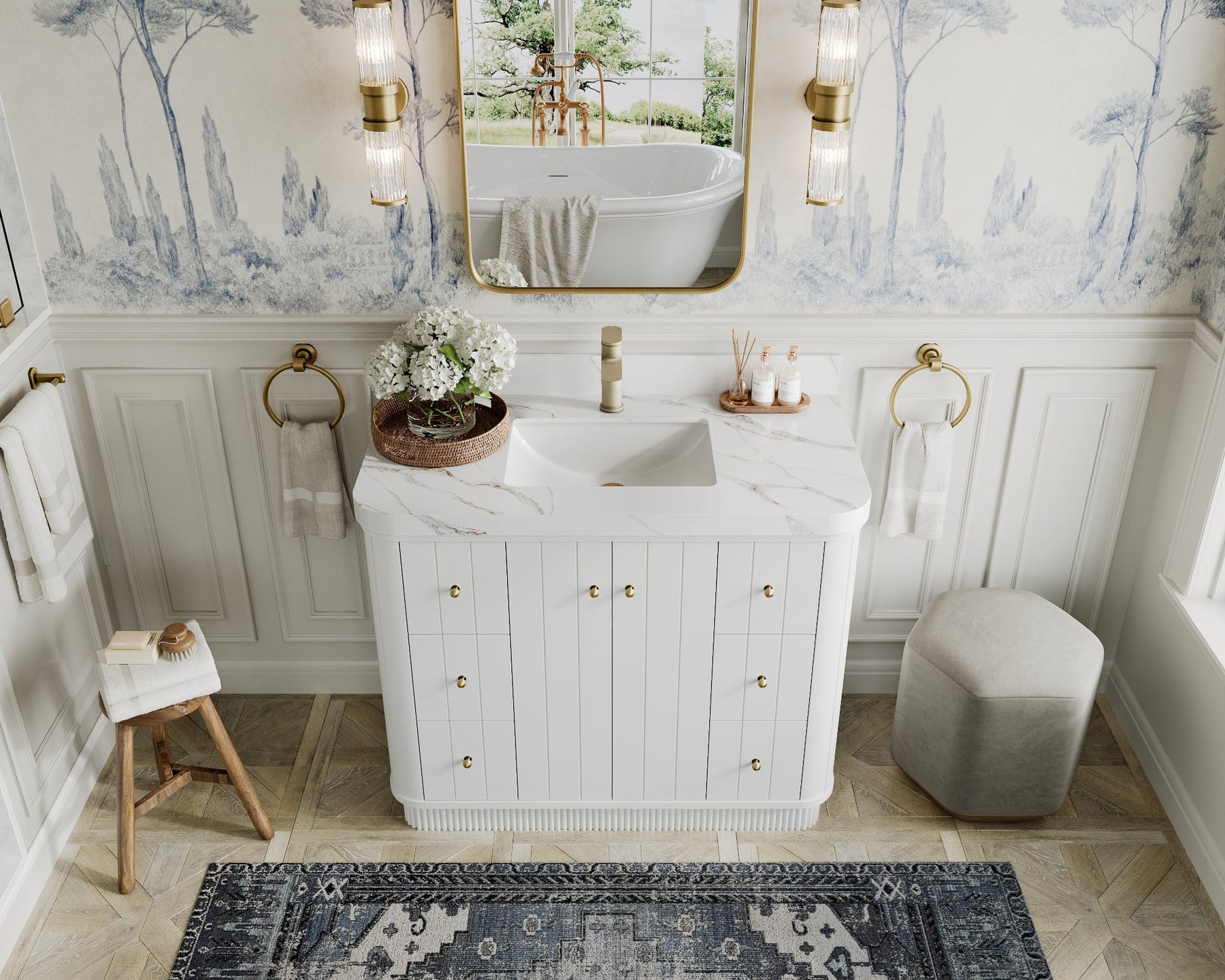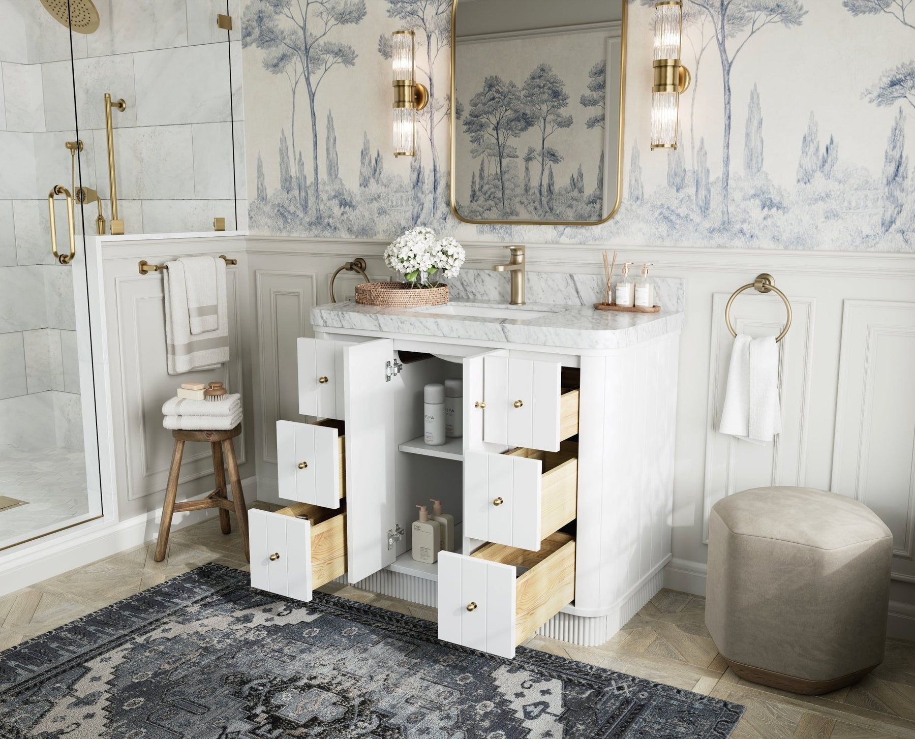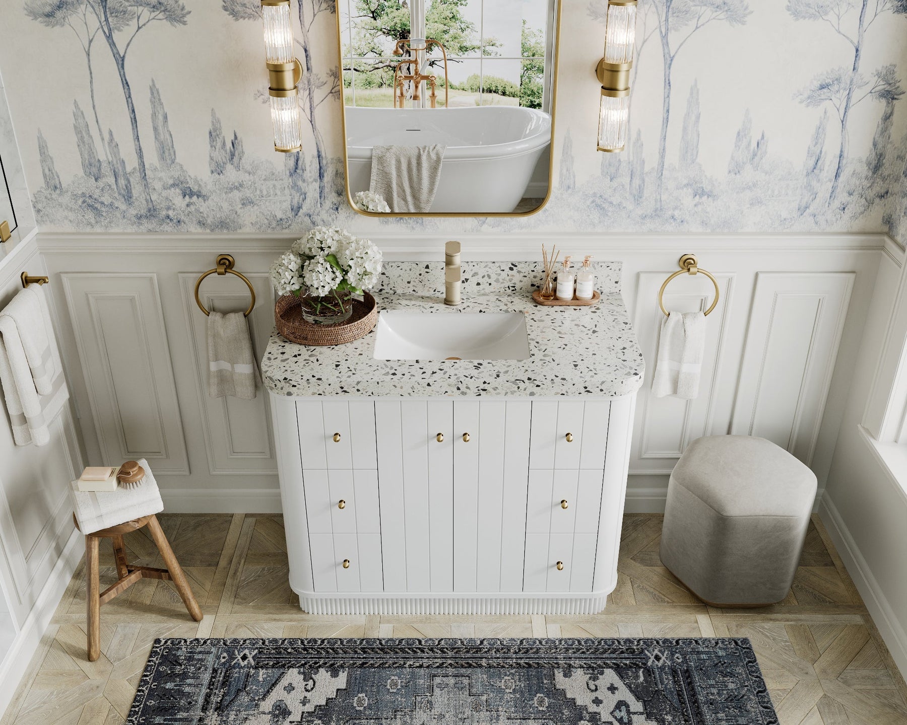 Vanity Countertops options: For Calacatta Laza Quartz, Calacatta Gold Quartz, Empira White Quartz, Pure White Quartz, Palissandro Quartz, Calacatta Nuvo Quartz, Carrara Marble, Carrara Quartz, Calacatta Sienna Quartz, Terrazzo Arctic Breeze, Terrazzo Golden Dusk we have Rounded - Edge option.