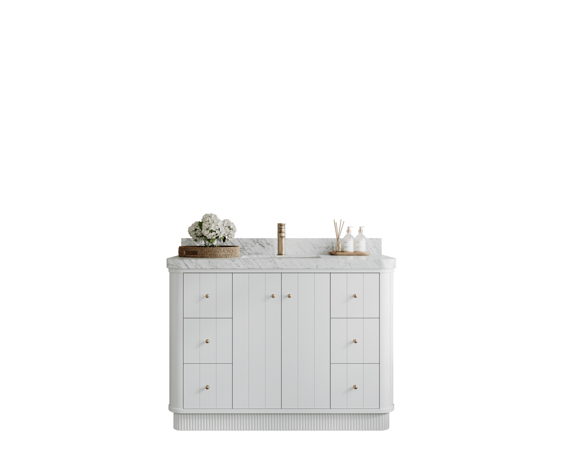 Premium countertop options – choose from Quartz or Marble, both featuring eased, rounded edges that echo the vanity’s curves.