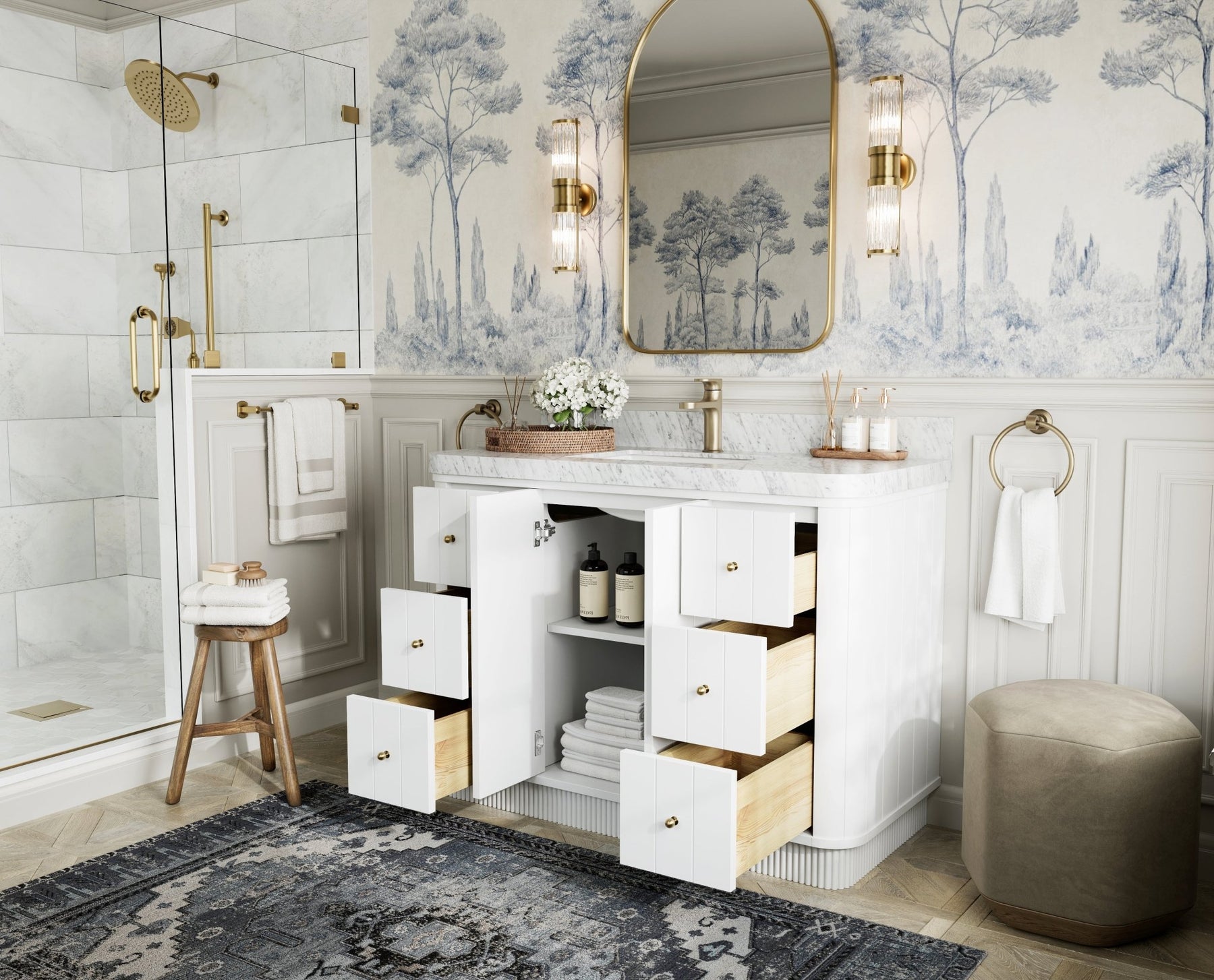 Meet Houston, the modern showpiece of the Houston Collection, crafted to bring warmth, texture, and refinement to any bathroom. A sculpted, softly rounded silhouette flows from the curved ends to the smooth, radiused countertop corners, while a fluted front meets a reeded kick plate for subtle texture and shadow play. The result is a clean, contemporary vanity that feels tailored and timeless — designed for bathrooms that want the look of luxury without harsh lines.