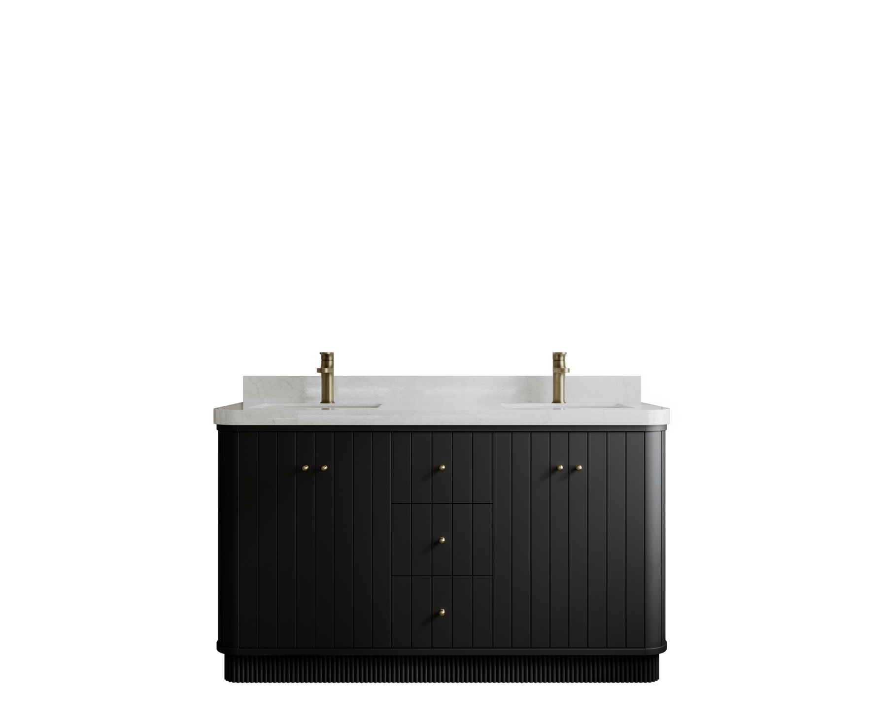 Premium countertop options – choose from Quartz or Marble, both featuring eased, rounded edges that echo the vanity’s curves.