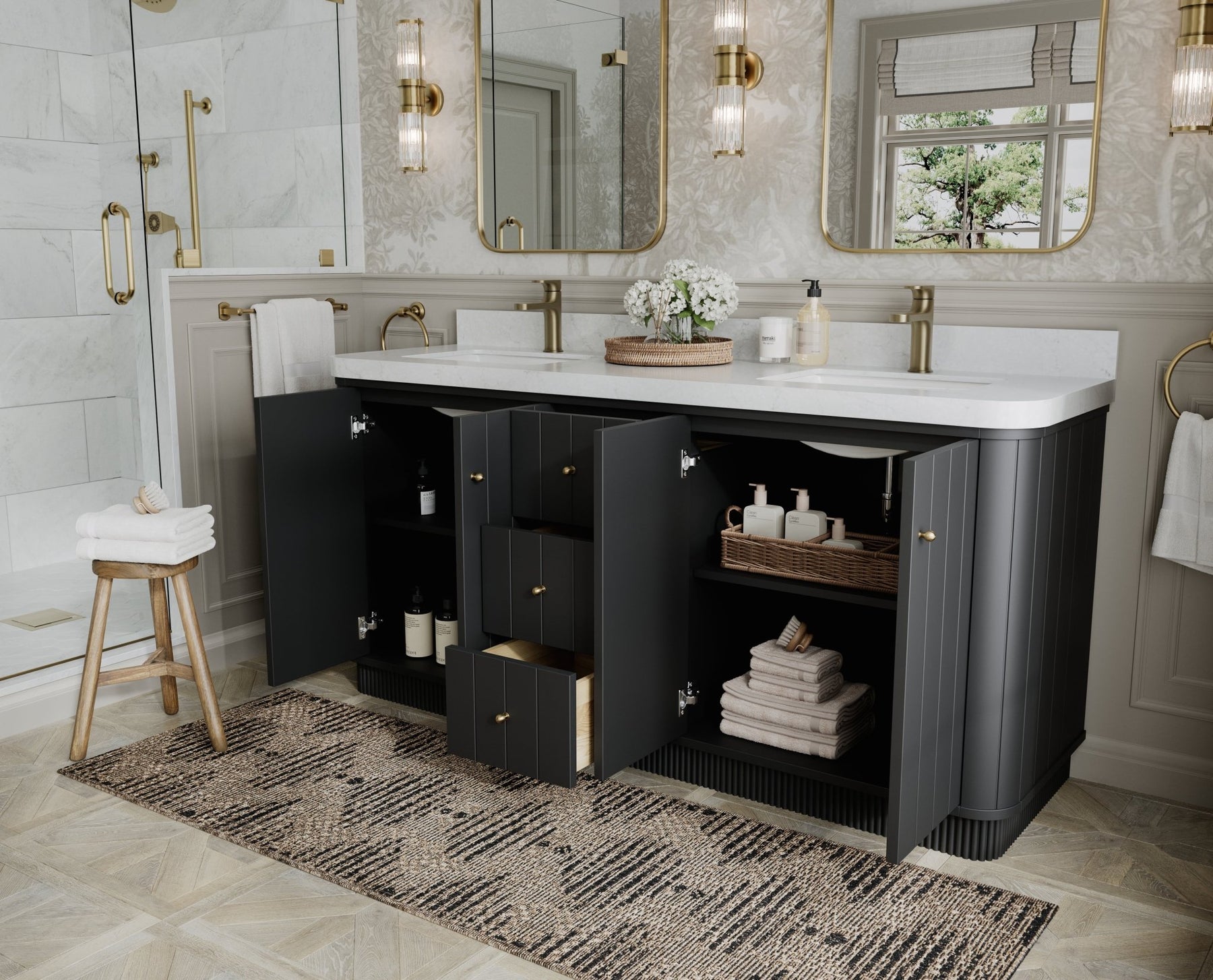 Premium countertop options – choose from Quartz or Marble, both featuring eased, rounded edges that echo the vanity’s curves.