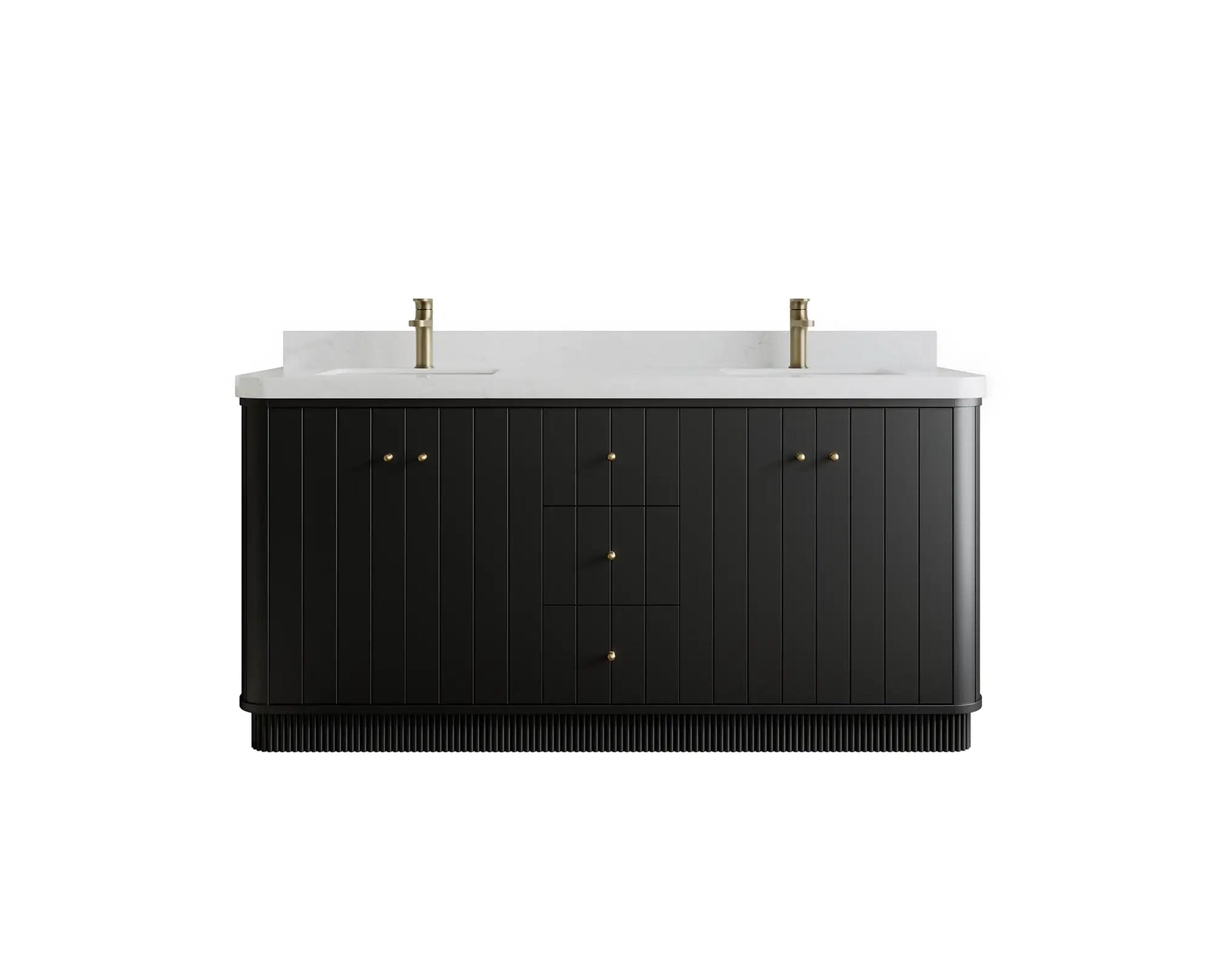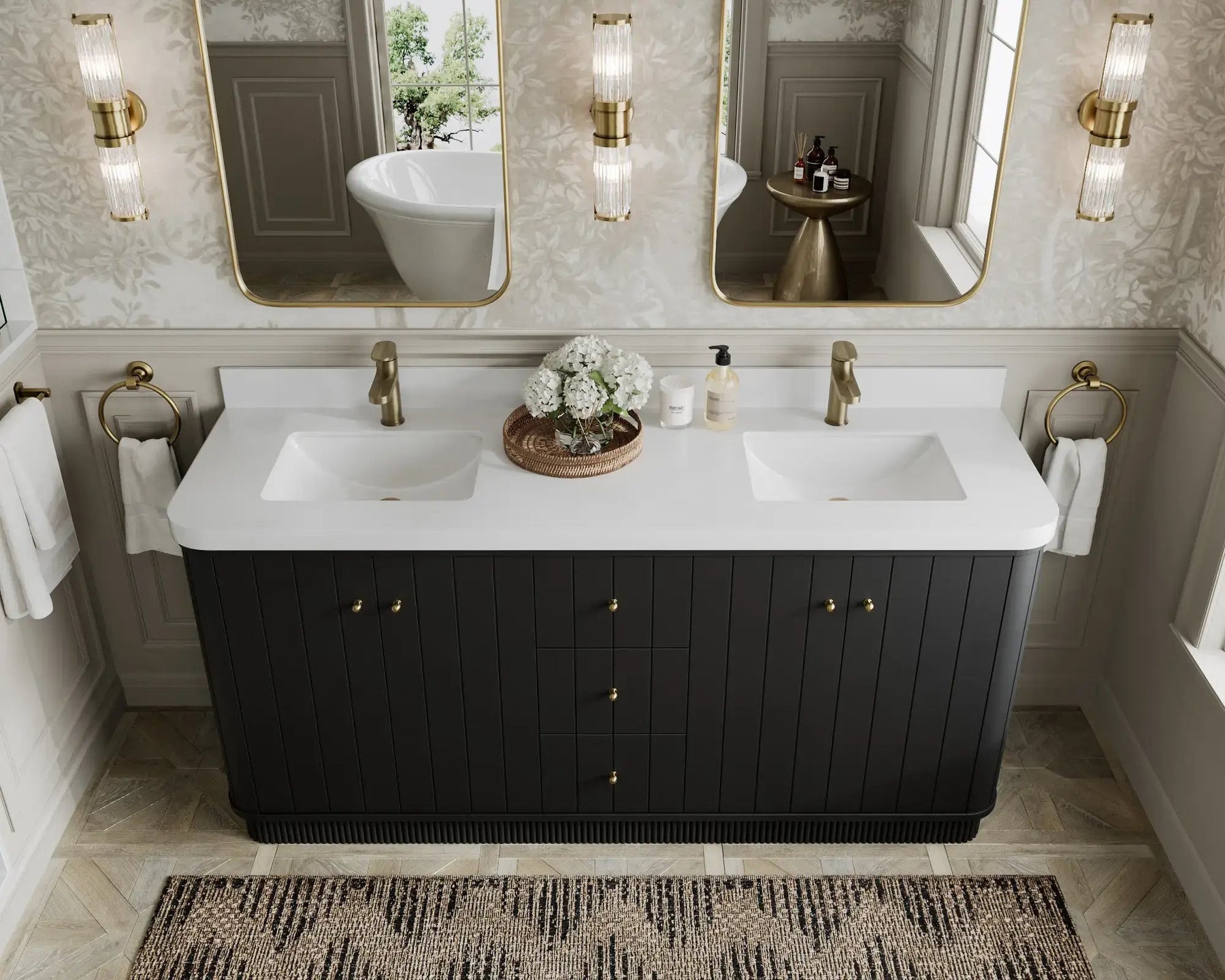 Premium countertop options – choose from Quartz or Marble, both featuring eased, rounded edges that echo the vanity’s curves.