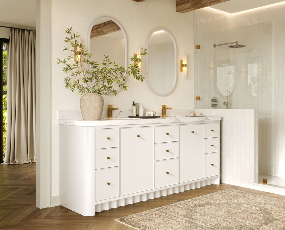 Meet Houston, the modern showpiece of the Houston Collection, crafted to bring warmth, texture, and refinement to any bathroom. A sculpted, softly rounded silhouette flows from the curved ends to the smooth, radiused countertop corners, while a fluted front meets a reeded kick plate for subtle texture and shadow play. The result is a clean, contemporary vanity that feels tailored and timeless — designed for bathrooms that want the look of luxury without harsh lines.